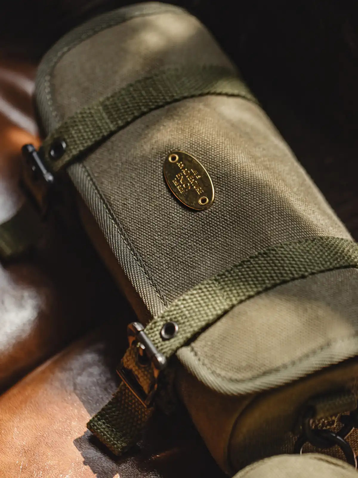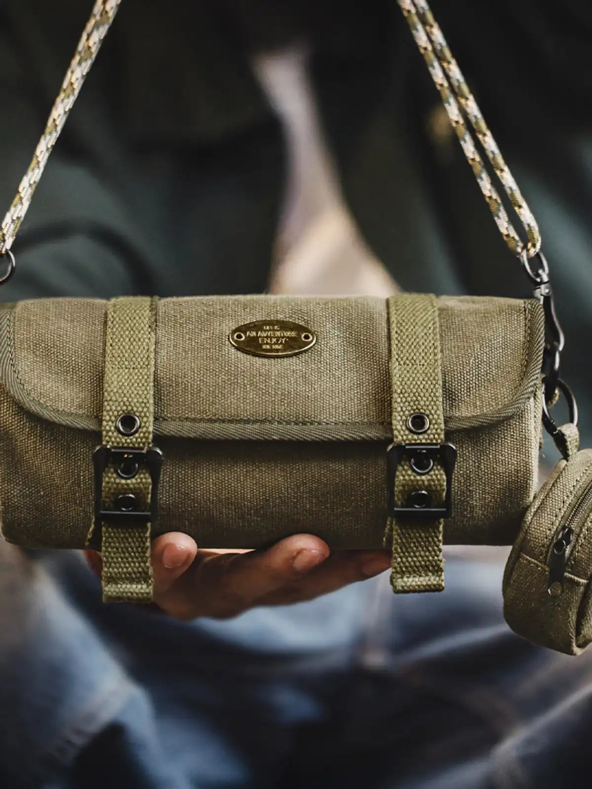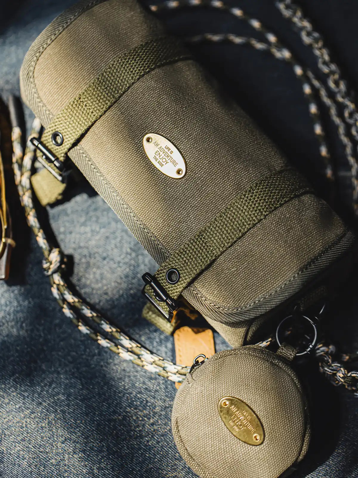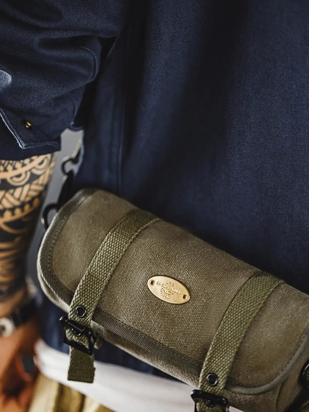 3世紀の歴史を持つ工具用ロールバッグをベースに、使いやすさと耐久性を追求したデザイン。厚手のコットンキャンバスは丈夫でハリがあり、時を経たかのような粒感のあるビンテージ風仕上げが特徴。工具の持ち運び用に設計された丸筒型フォルムは空間効率に優れ、取り外し可能なミニポーチを付属。多股に編み込んだ肩紐はクラフト感があり、金属プレートのブランドタグがアクセントとなっている。通勤やカジュアルな外出にぴったりのサイズ感で、冒険心を刺激する一品。
