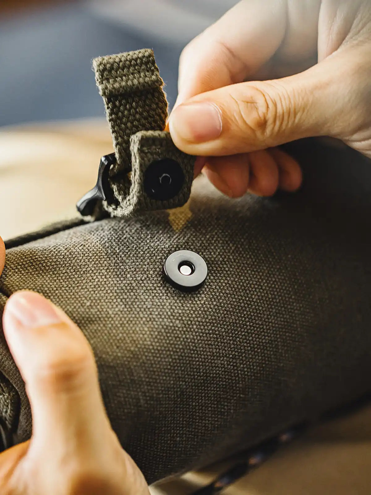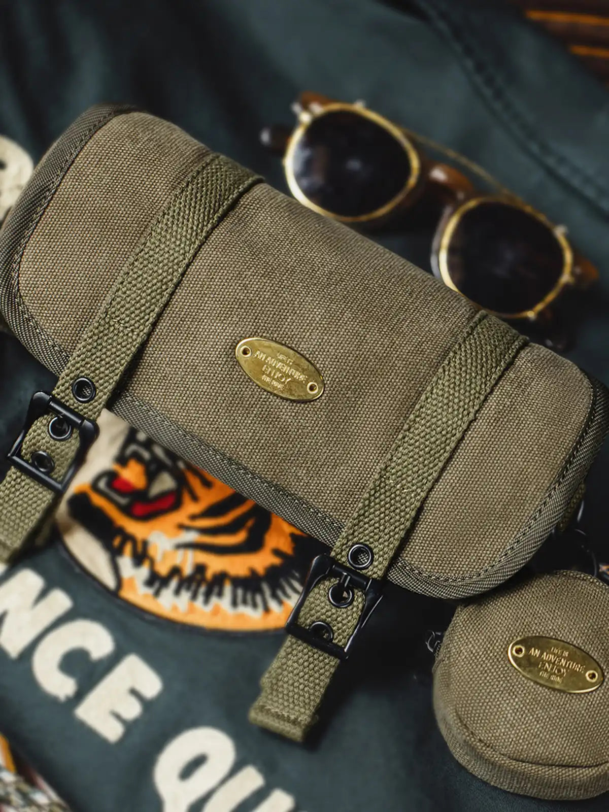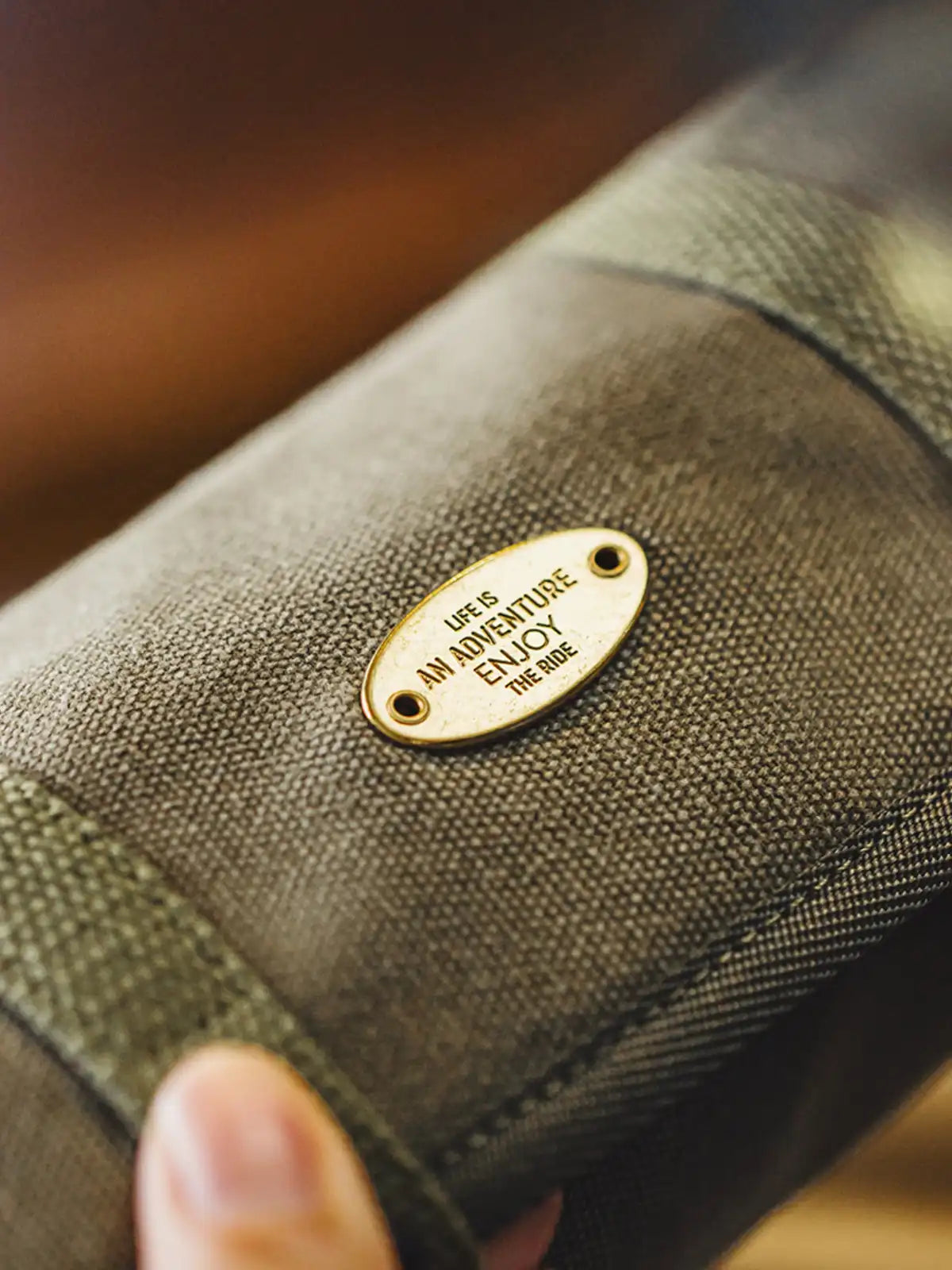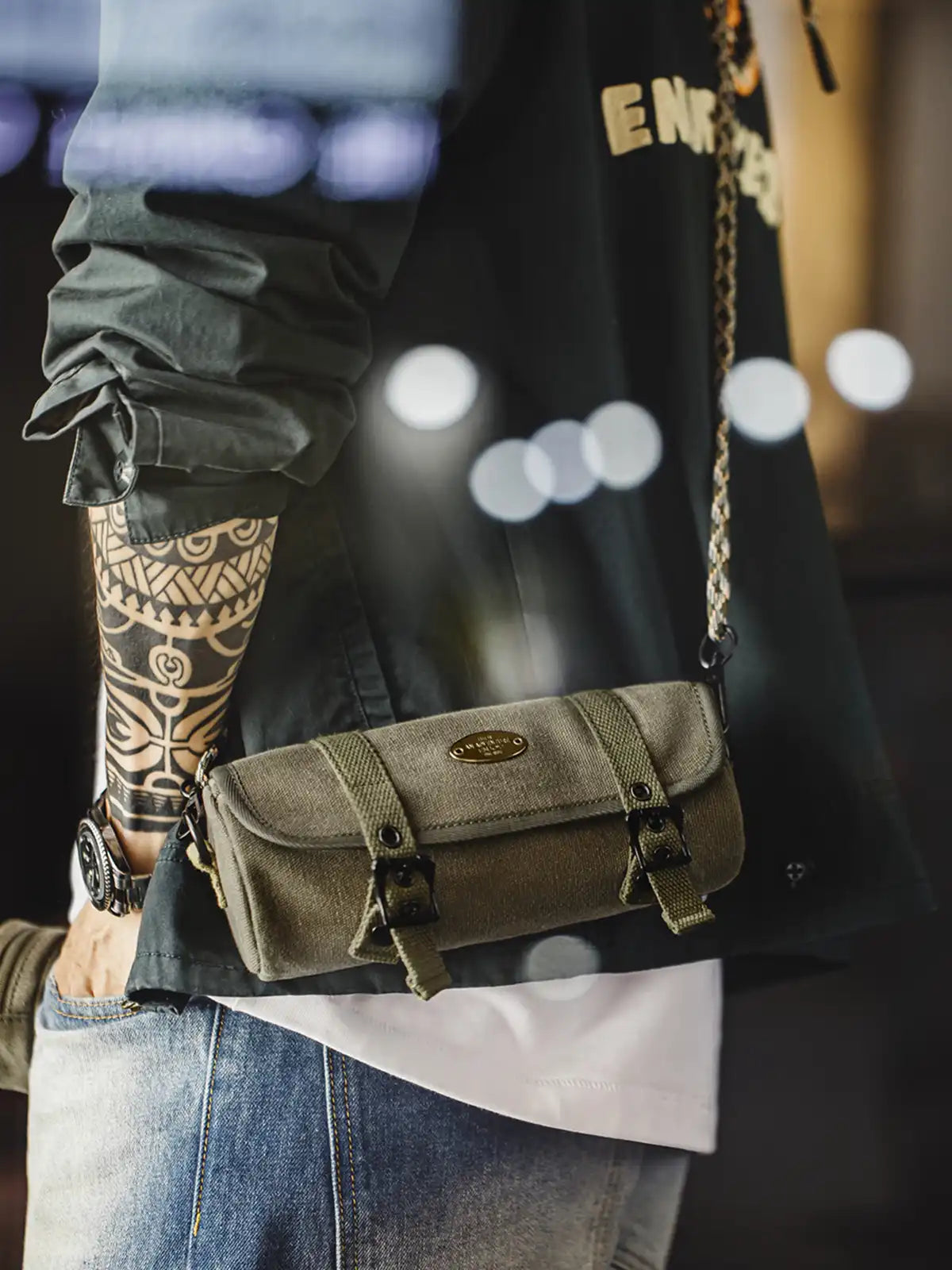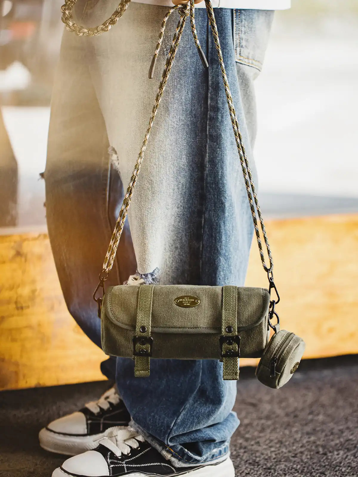 3世紀の歴史を持つ工具用ロールバッグをベースに、使いやすさと耐久性を追求したデザイン。厚手のコットンキャンバスは丈夫でハリがあり、時を経たかのような粒感のあるビンテージ風仕上げが特徴。工具の持ち運び用に設計された丸筒型フォルムは空間効率に優れ、取り外し可能なミニポーチを付属。多股に編み込んだ肩紐はクラフト感があり、金属プレートのブランドタグがアクセントとなっている。通勤やカジュアルな外出にぴったりのサイズ感で、冒険心を刺激する一品。