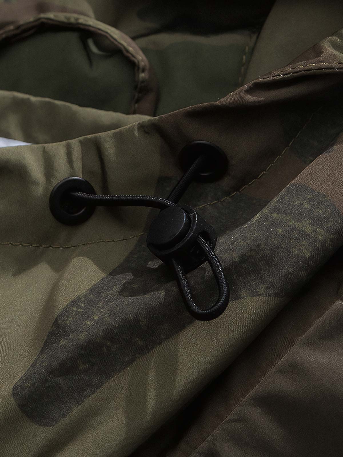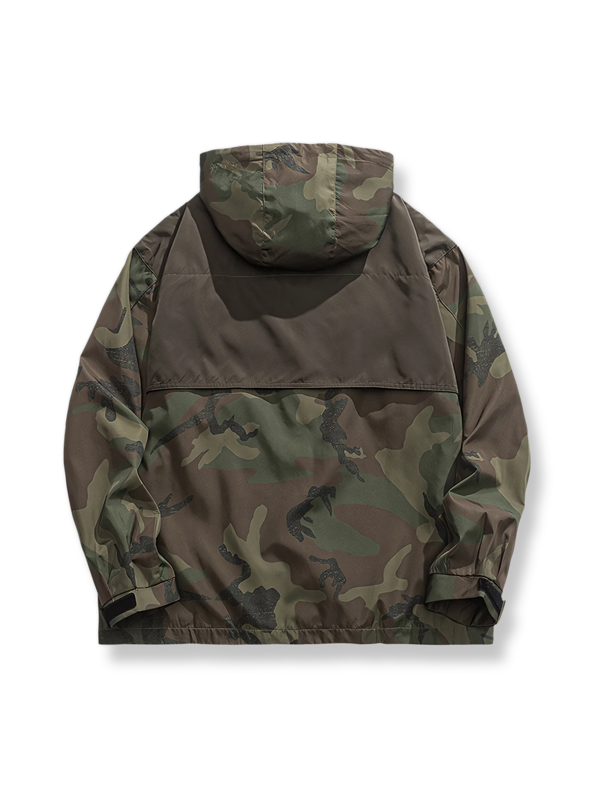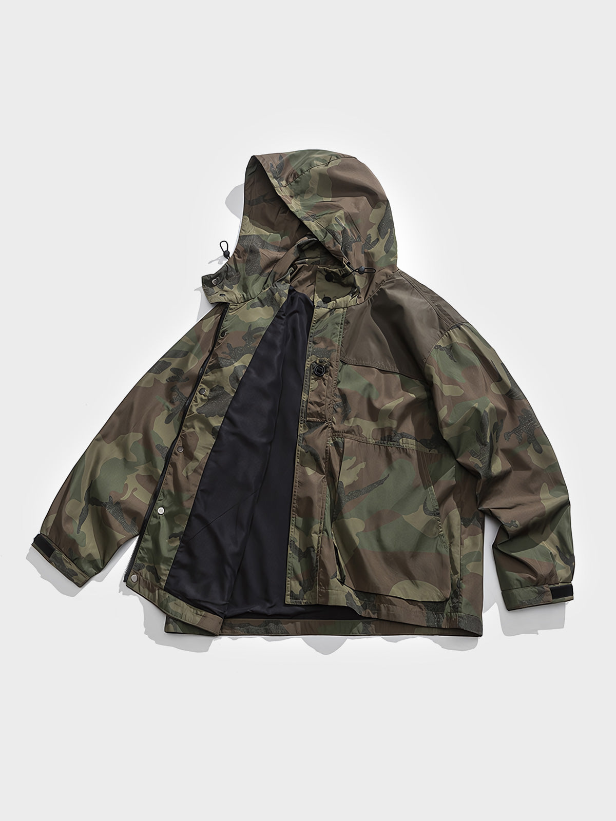 このマウンテンジャケットは、軍用迷彩からインスピレーションを得た機能的なアウトドアウェアです。カモフラージュパターンは、もともとは自然に溶け込むためのものですが、現在では都会的なファッションステートメントとしても人気を博しています。