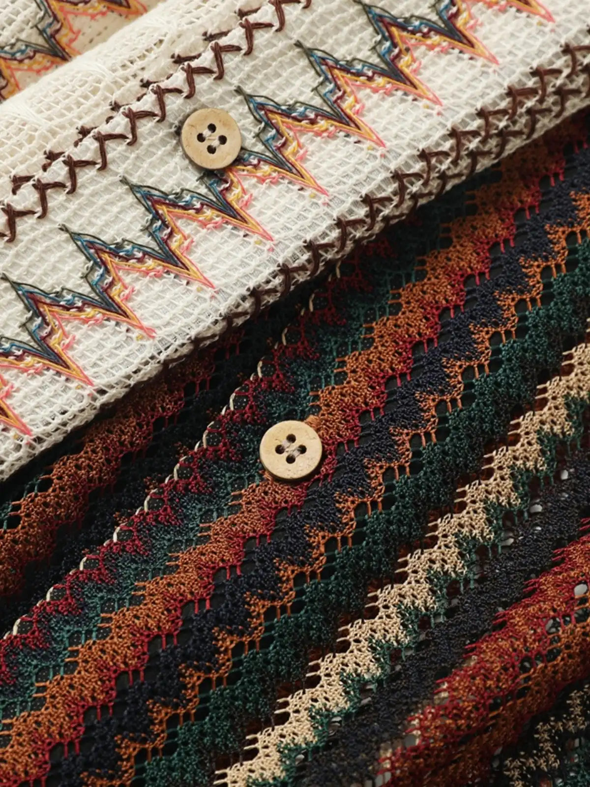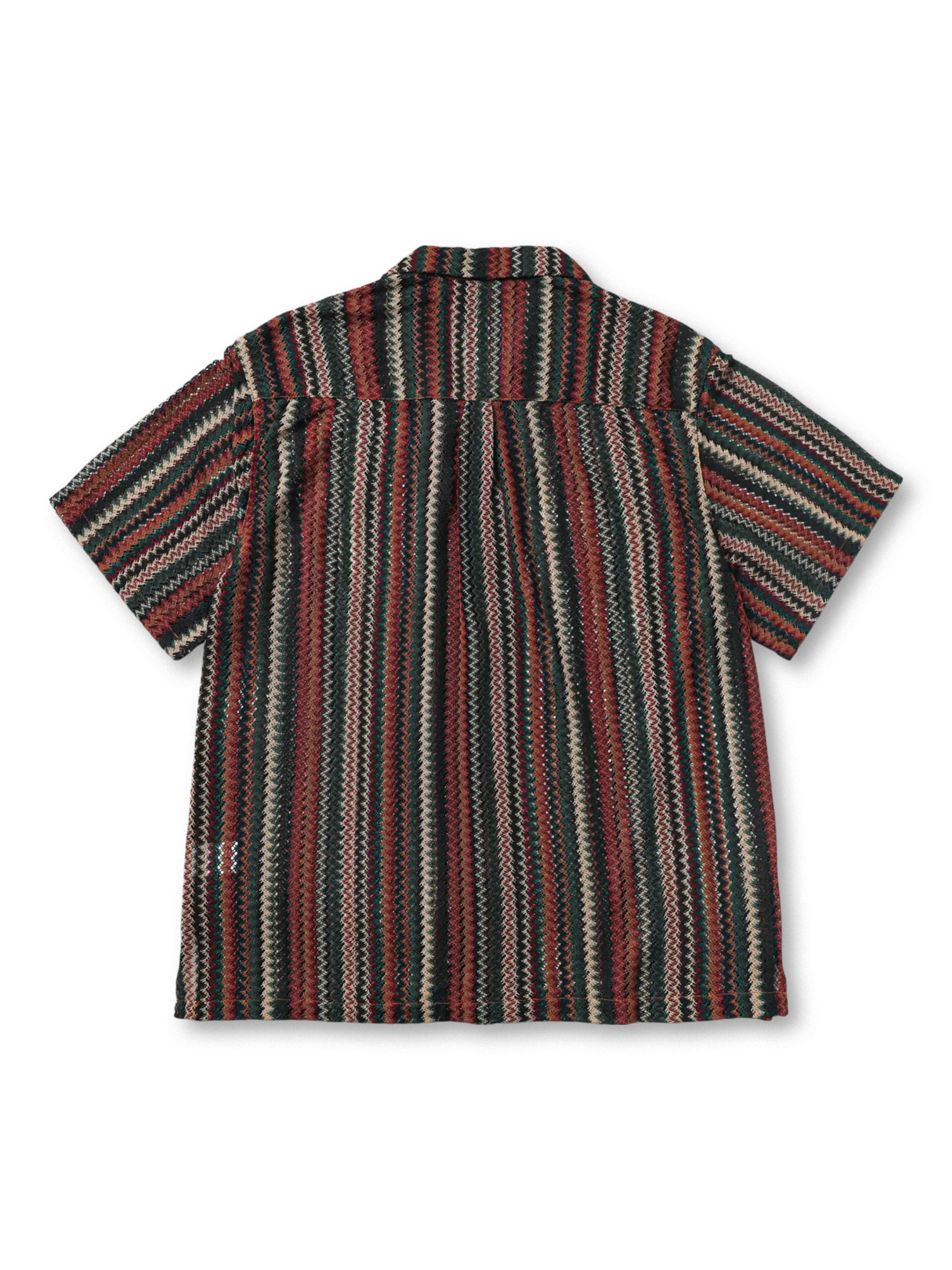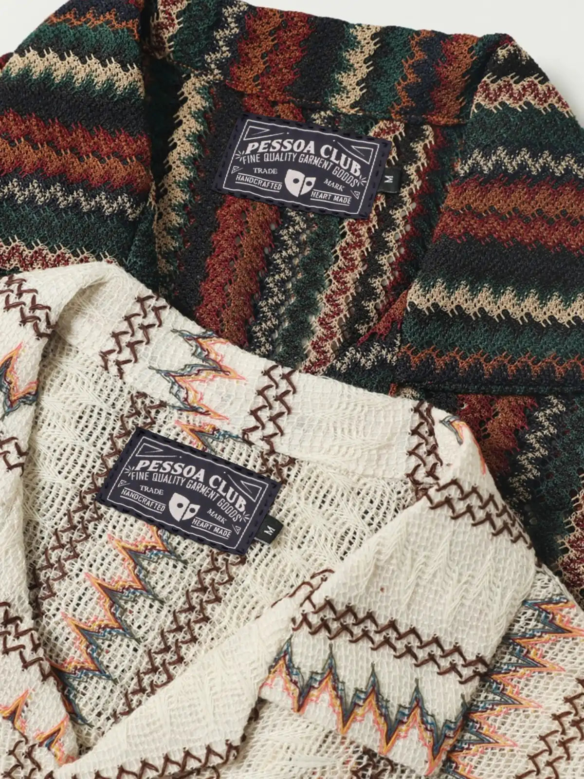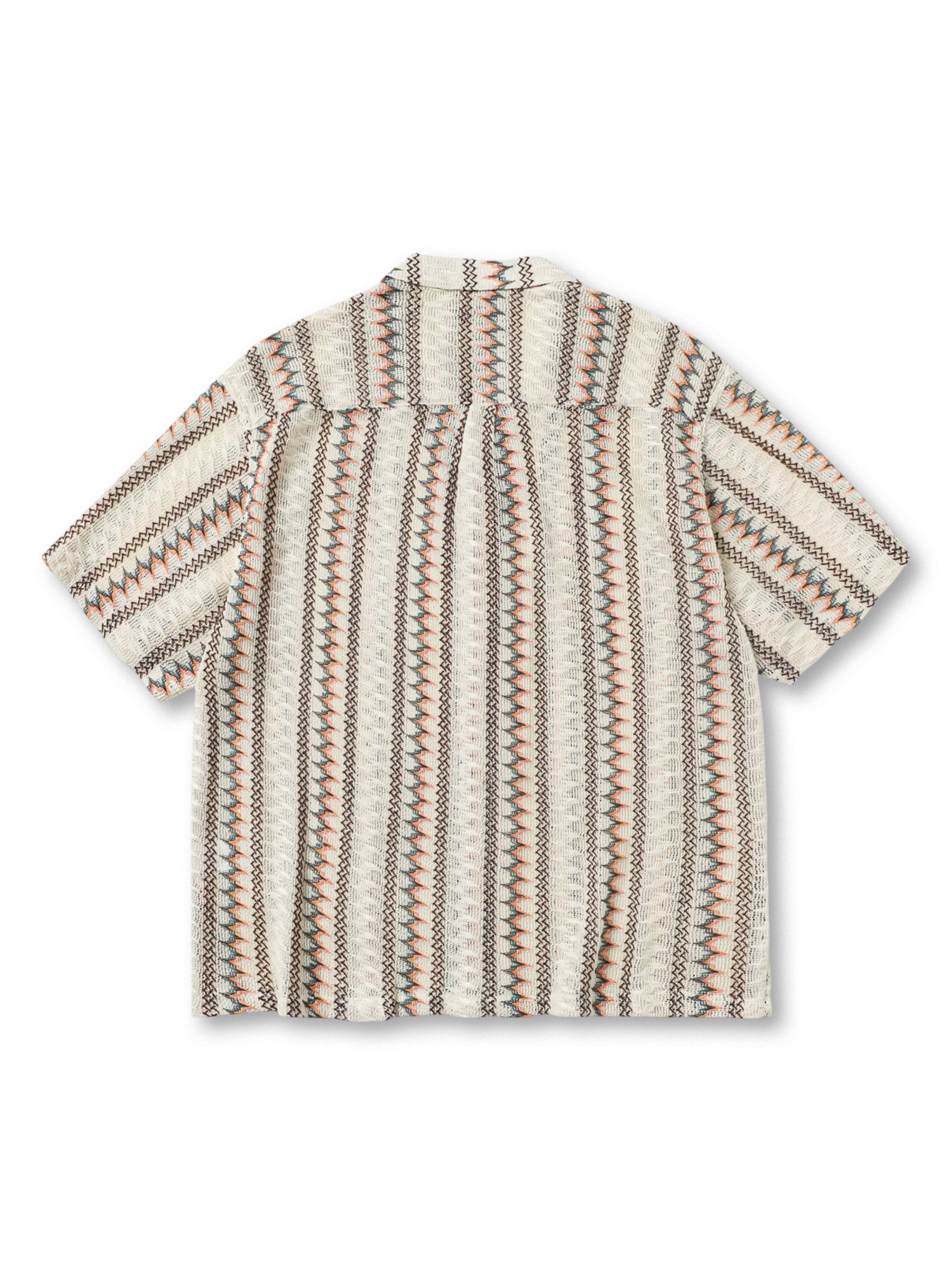 トライバルなジグザグストライプを立体的に編み上げたオープンワークニットは、太番手コットンとポリエステルをブレンドした生地が軽やかな通気性と程よいドレープ性を両立。開襟のリラックスシルエットはドロップショルダーで肩まわりにゆとりを持たせ、フロントは天然素材ボタンで仕上げました。デニムショーツやワイドリネンパンツとの相性が良く、ダークとライトの2色展開でストリートからリゾートまで幅広く活躍します。