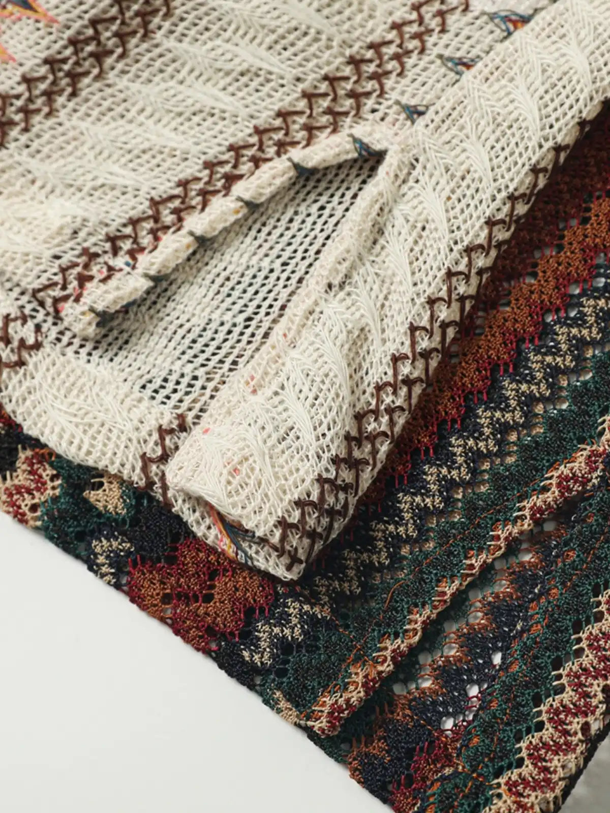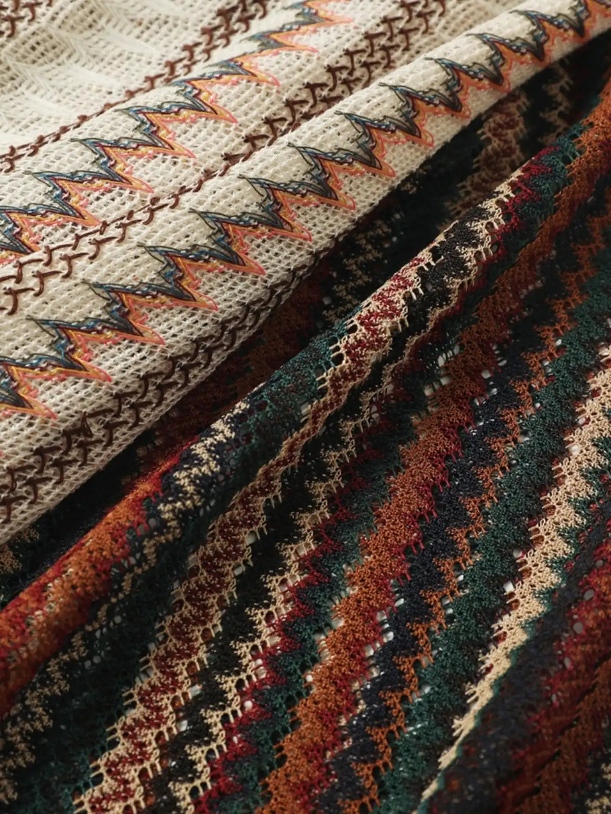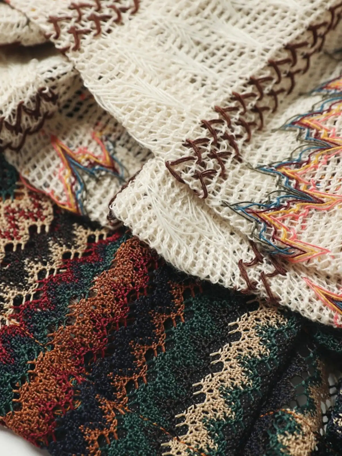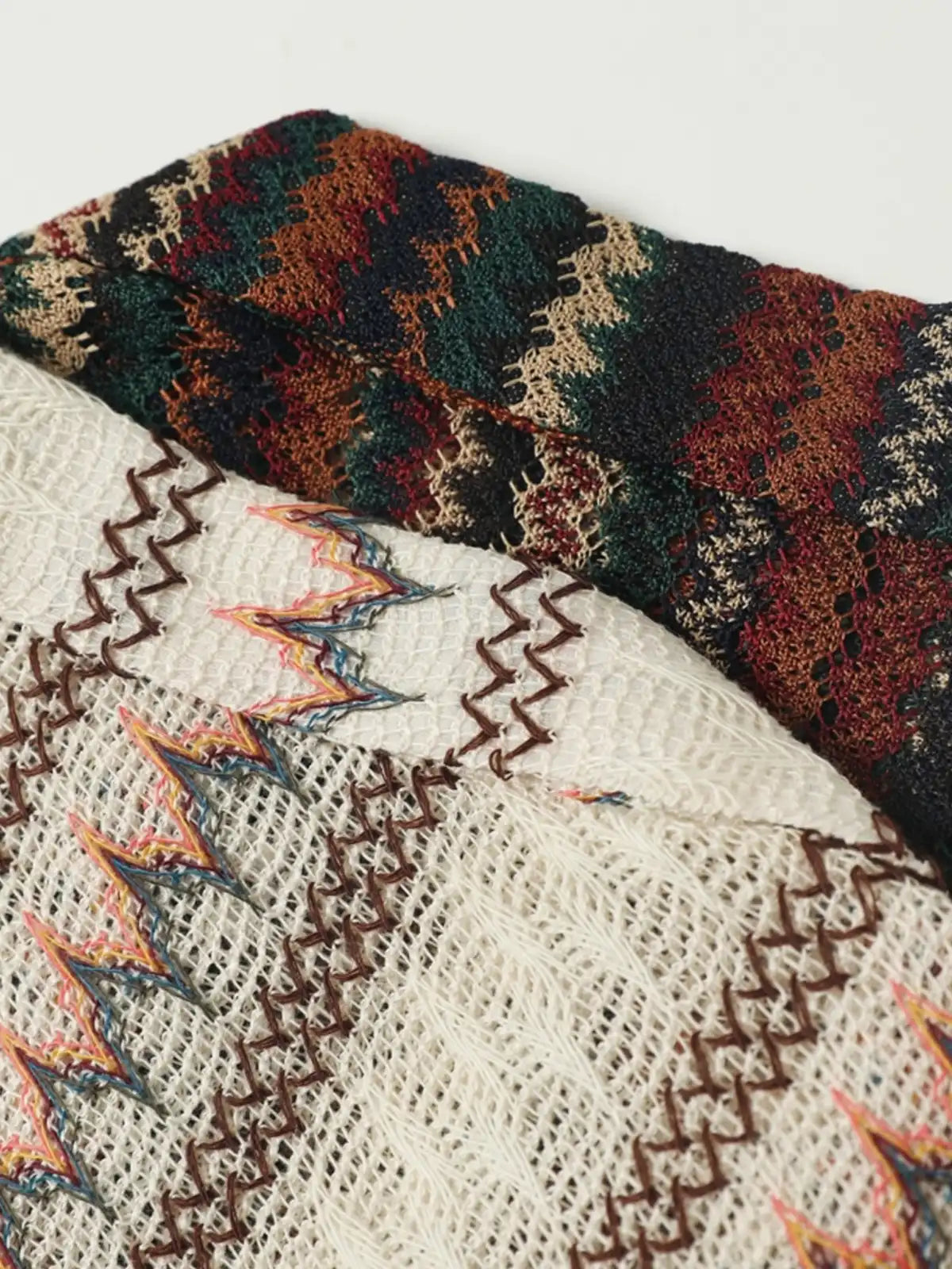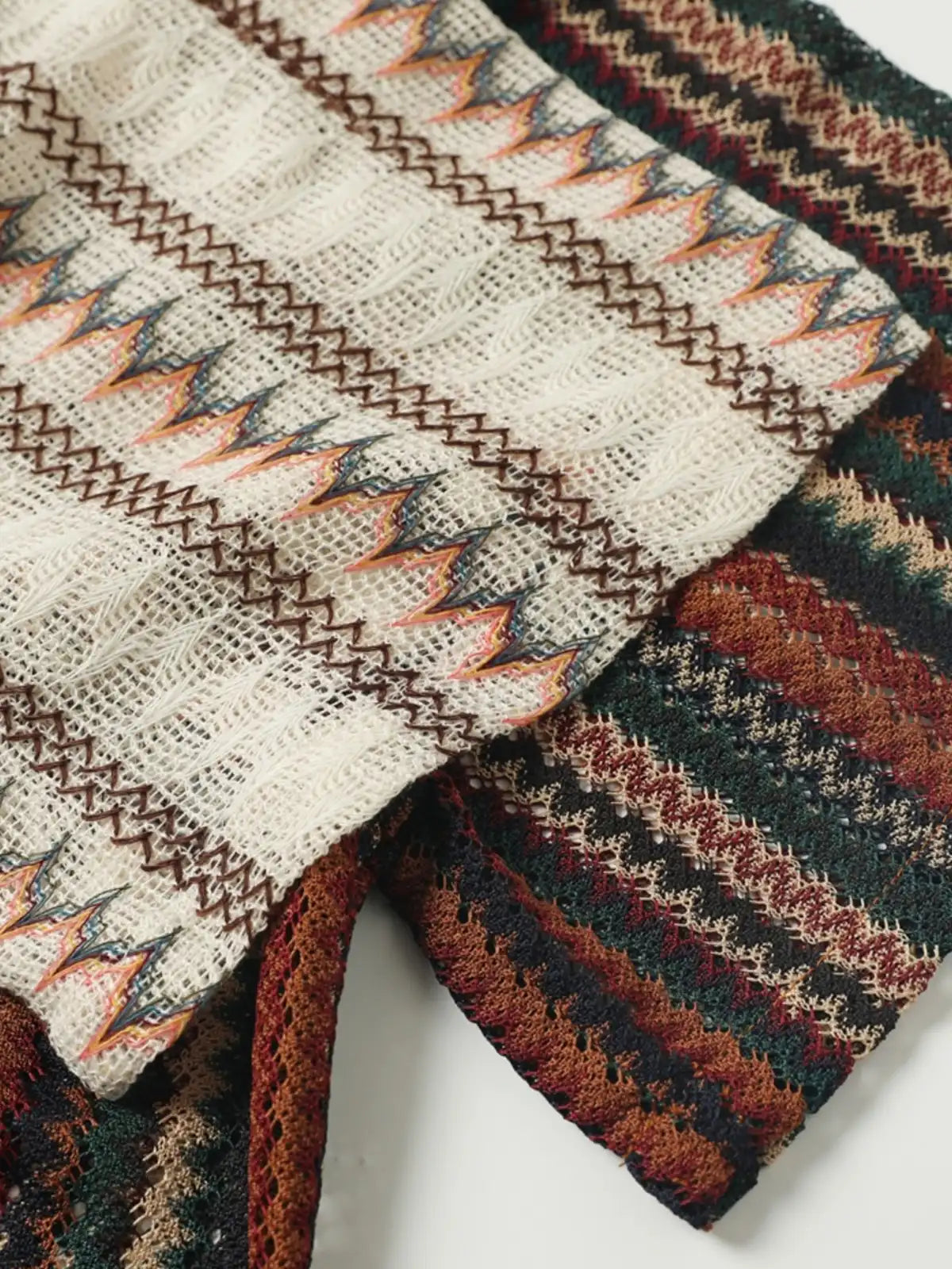 トライバルなジグザグストライプを立体的に編み上げたオープンワークニットは、太番手コットンとポリエステルをブレンドした生地が軽やかな通気性と程よいドレープ性を両立。開襟のリラックスシルエットはドロップショルダーで肩まわりにゆとりを持たせ、フロントは天然素材ボタンで仕上げました。デニムショーツやワイドリネンパンツとの相性が良く、ダークとライトの2色展開でストリートからリゾートまで幅広く活躍します。
