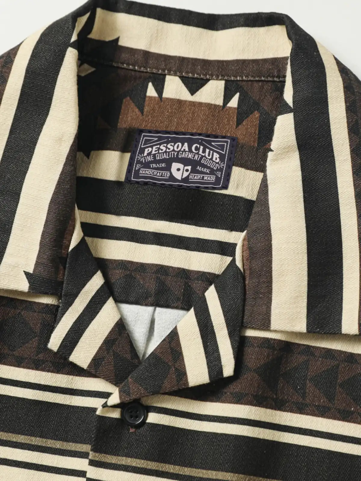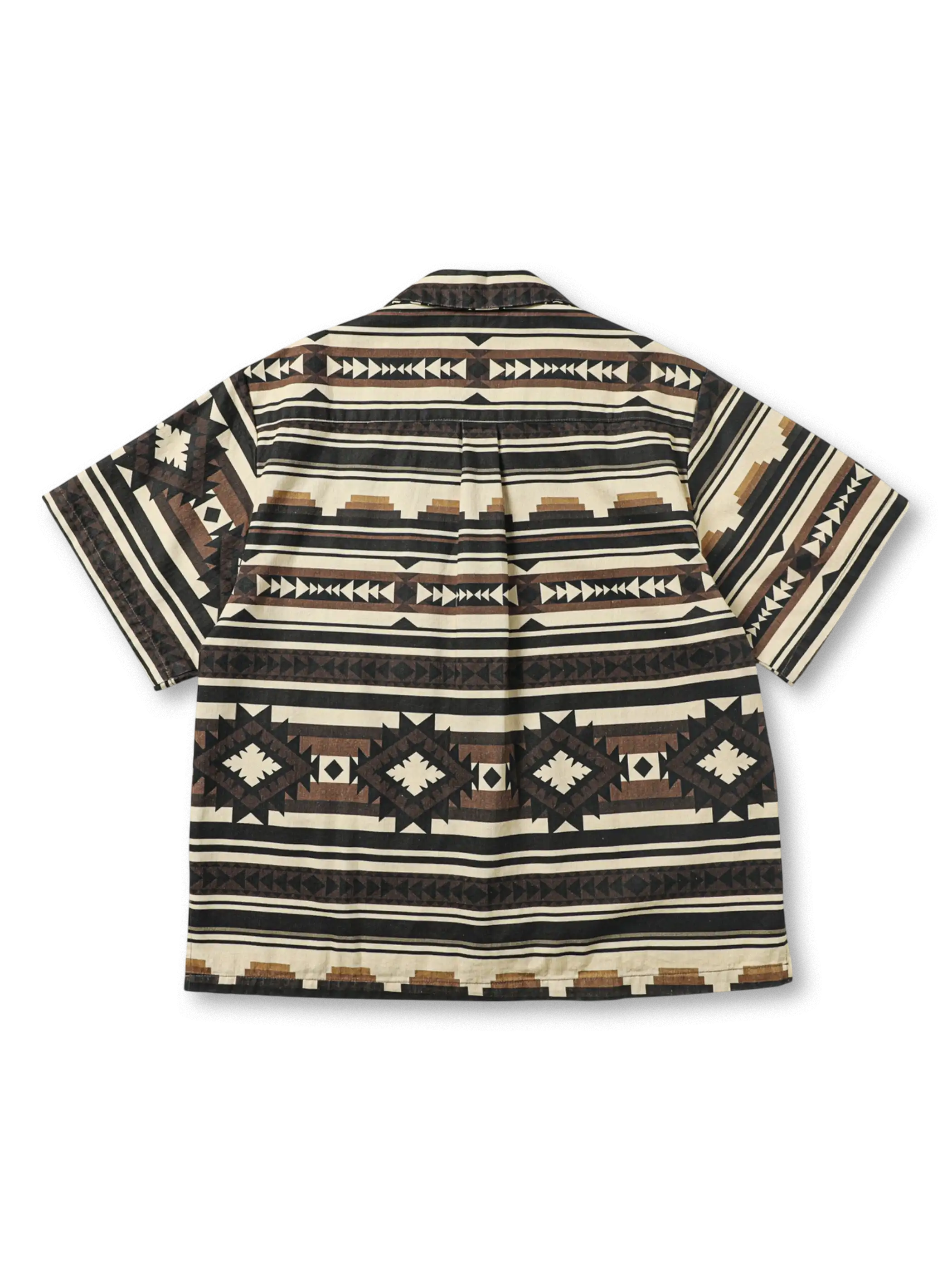 ネイティブアメリカンのテキスタイルに着想を得た幾何学模様を全体に配し、1950年代カリブ海リゾートウエアを彷彿とさせるゆったりシルエットがリラックスした雰囲気を演出。軽やかな100%コットンは肌触りが良く通気性に優れ、デニムやチノショーツとの相性が抜群です。襟を開けて着こなせばビーチからタウンまで幅広く活躍します。