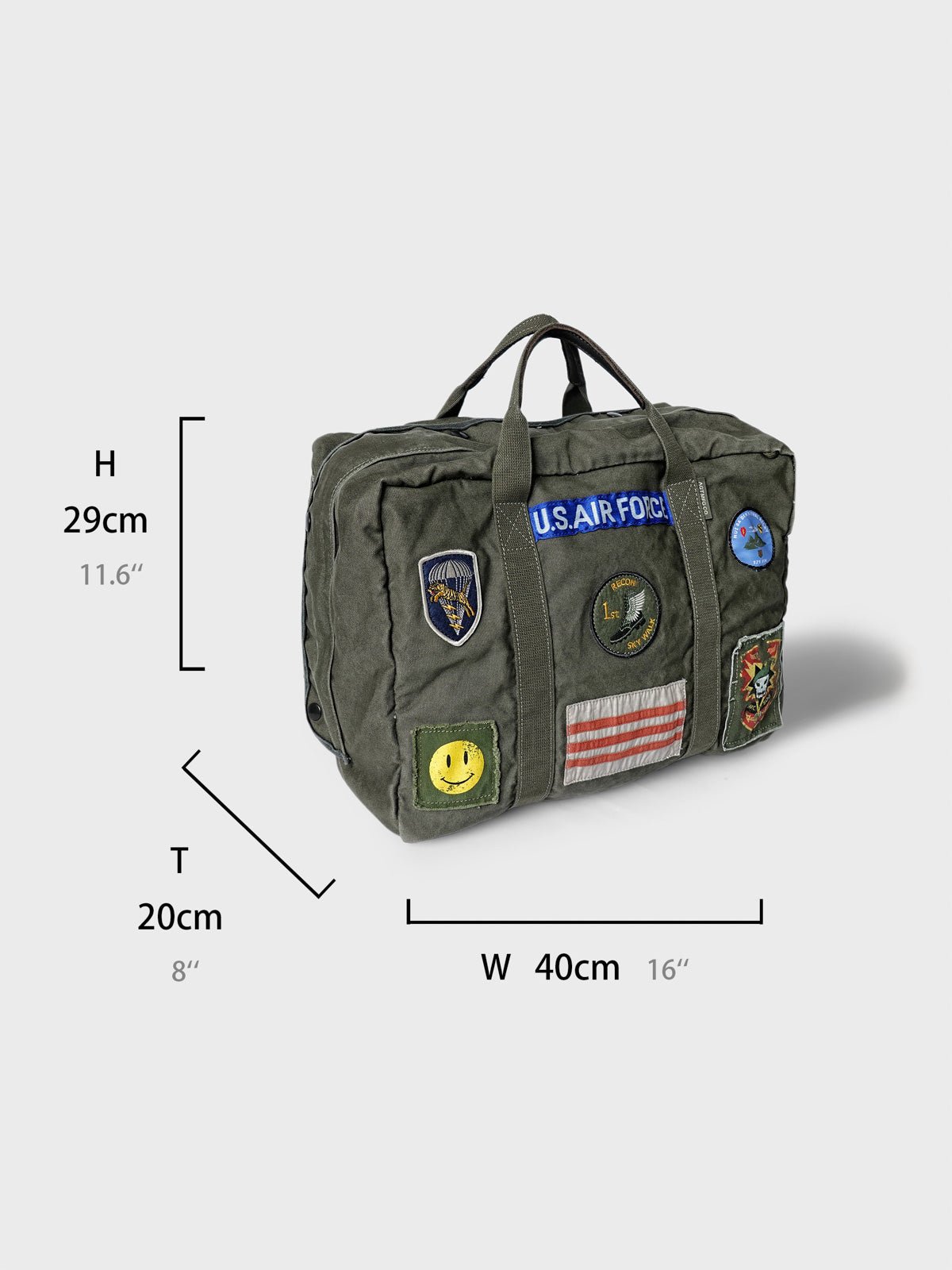 このバッグは、1970年代のアメリカ空軍のデプロイメントバッグにインスピレーションを得てデザインされました。多様なレトロな軍事バッジや「U.S. Air Force」のマークが取り入れられ、当時の軍事スタイルと歴史を反映しています。実用的な通勤アクセサリーとしても機能しつつ、レトロな軍事スタイルを好むコレクターにも魅力的です。