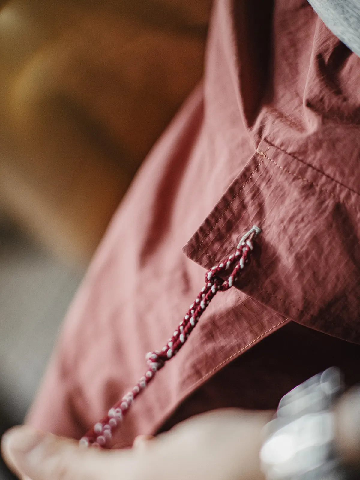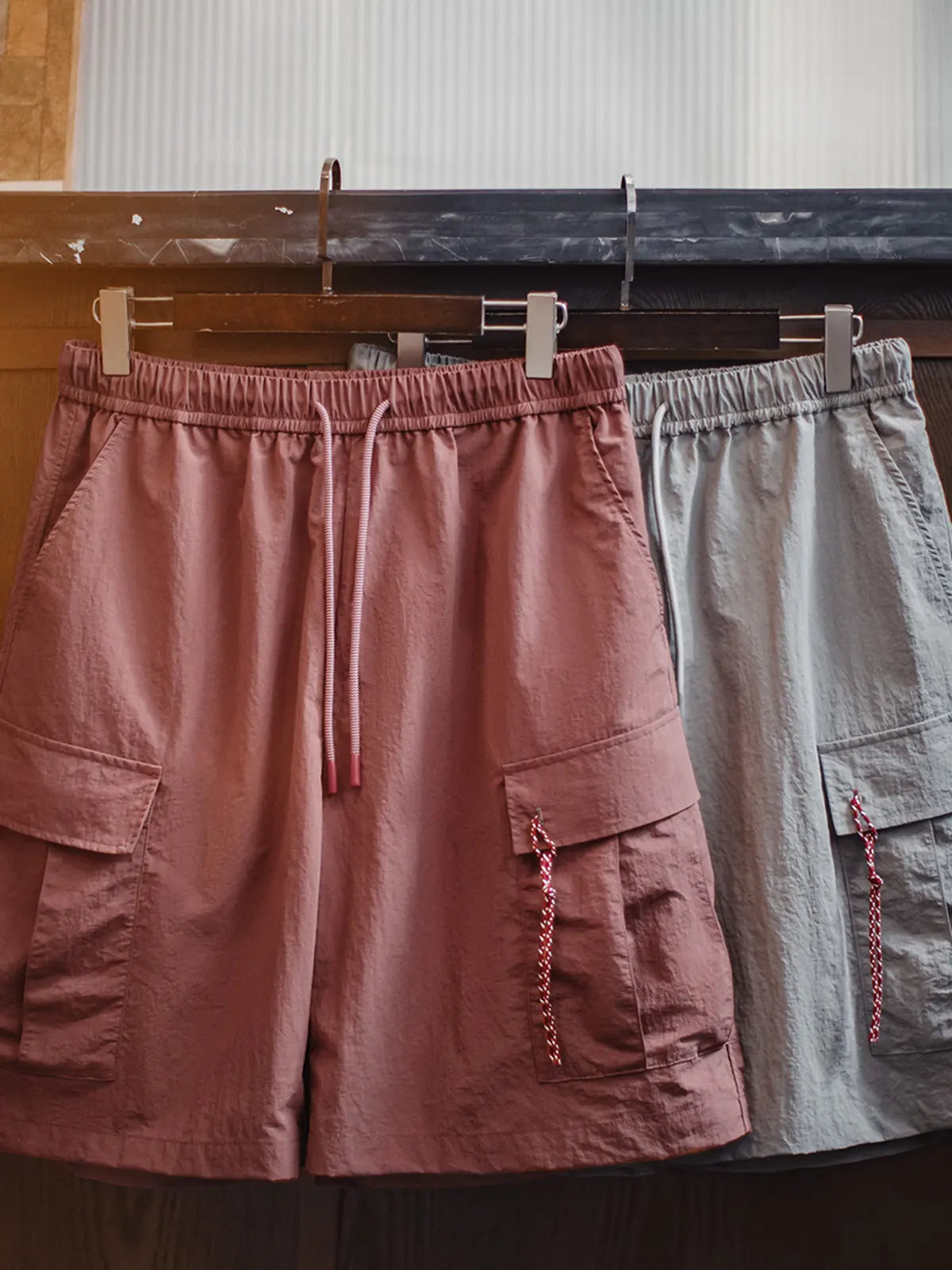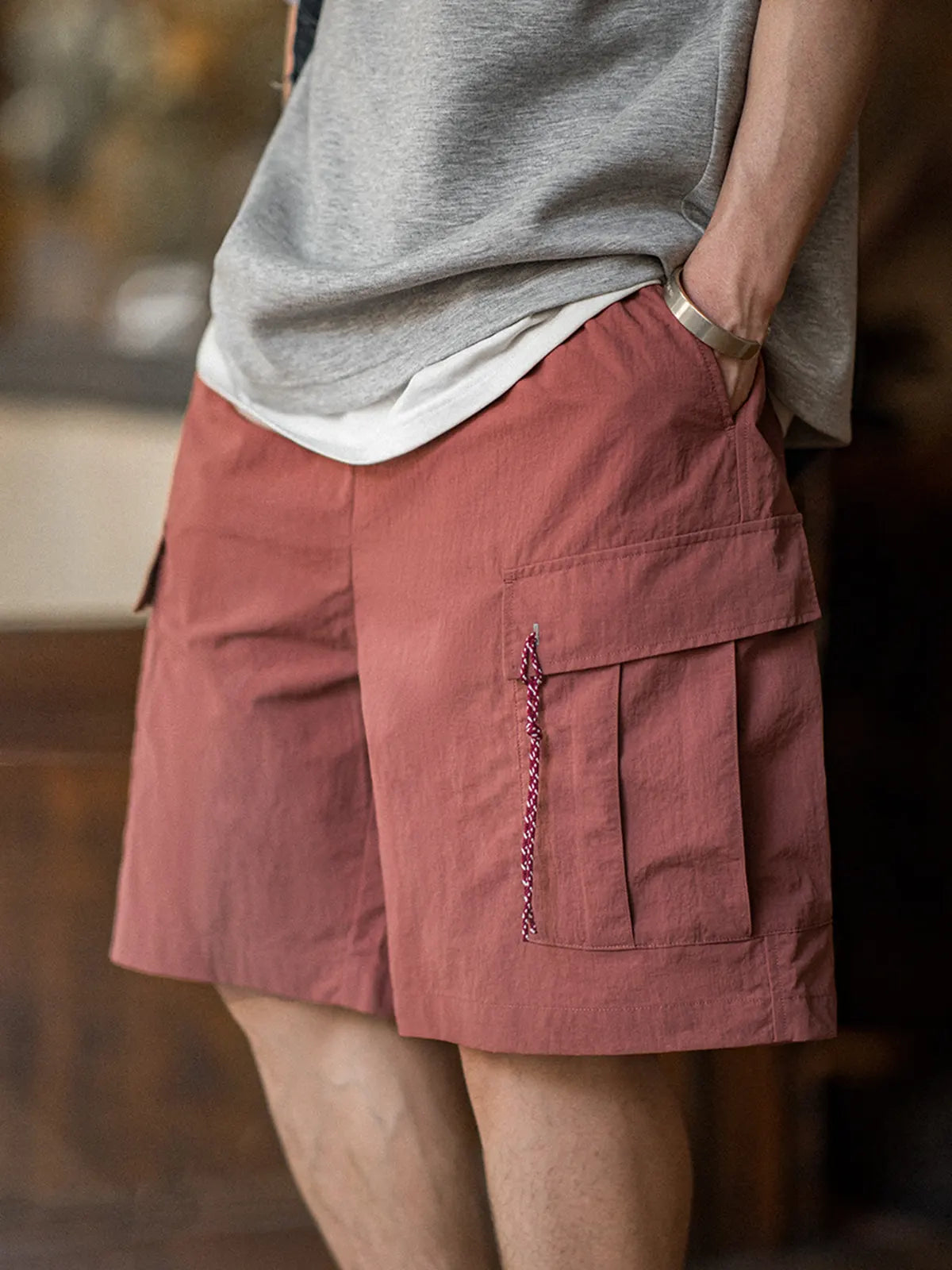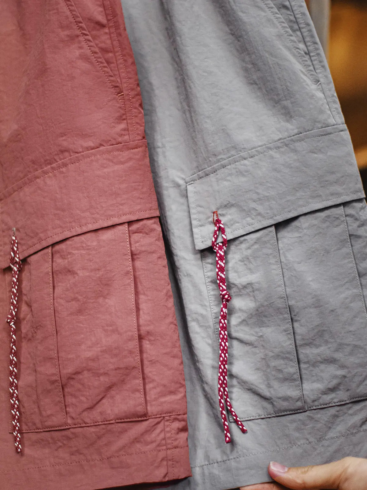 1950年代に米軍が採用したM65フィールドパンツの象徴的なポケット配置を踏襲しつつ、現代的なルーズフィットのショーツとしてアレンジ。130g/m²薄手ナイロンは撥水性と通気性を兼ね備え、折り返し可能なフラップ付きカーゴポケットに施されたコントラストドローコードが視覚的なアクセントをプラス。山岳スタイルのアウターやスニーカーとも好相性で、ワンアイテムでアウトドアからストリートまで多彩な着こなしが実現します。