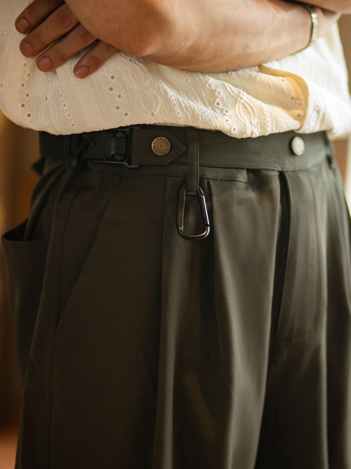 涼感スラックス生地、ゆったりと快適、クラシックなゴールドD字バックルデザイン。