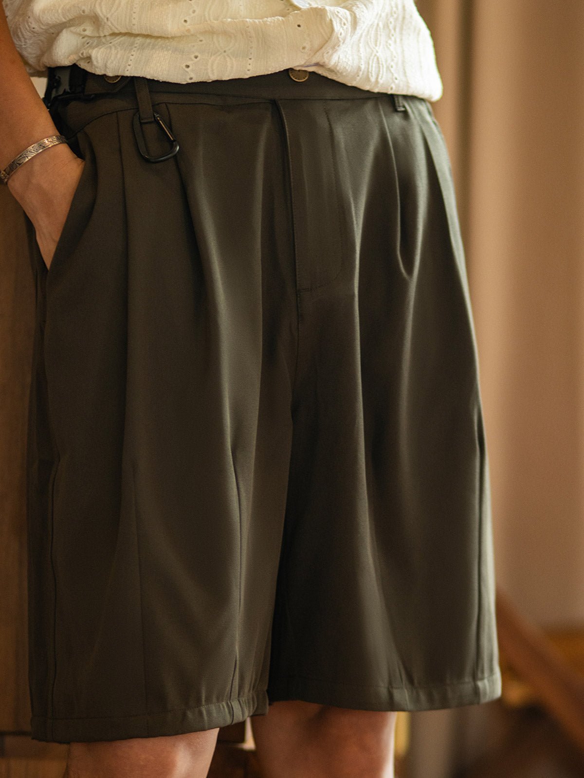 このグルカ五分丈パンツは、230グラムの涼感スラックス生地を使用しており、柔らかくドレープ感があり、夏の着用に最適です。独特なタクティカルバックルデザインとクラシックなカスタムブラスバックルが、ファッション性と実用性を高めています。ゆったりとしたシルエットとスラックスプリーツデザインが、イギリス軍のパンツの紳士的な雰囲気とイタリアのスーツの洒落た雰囲気を兼ね備えています。生地はアイロンがけ不要で、常に整然としたエレガントな状態を保ち、日常の着用に便利です。カジュアルなシーンでもアウトドア活動でも、このショートパンツは快適さとファッション性を兼ね備えた着心地を提供します。
