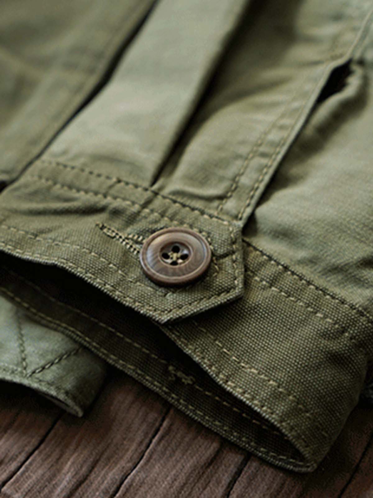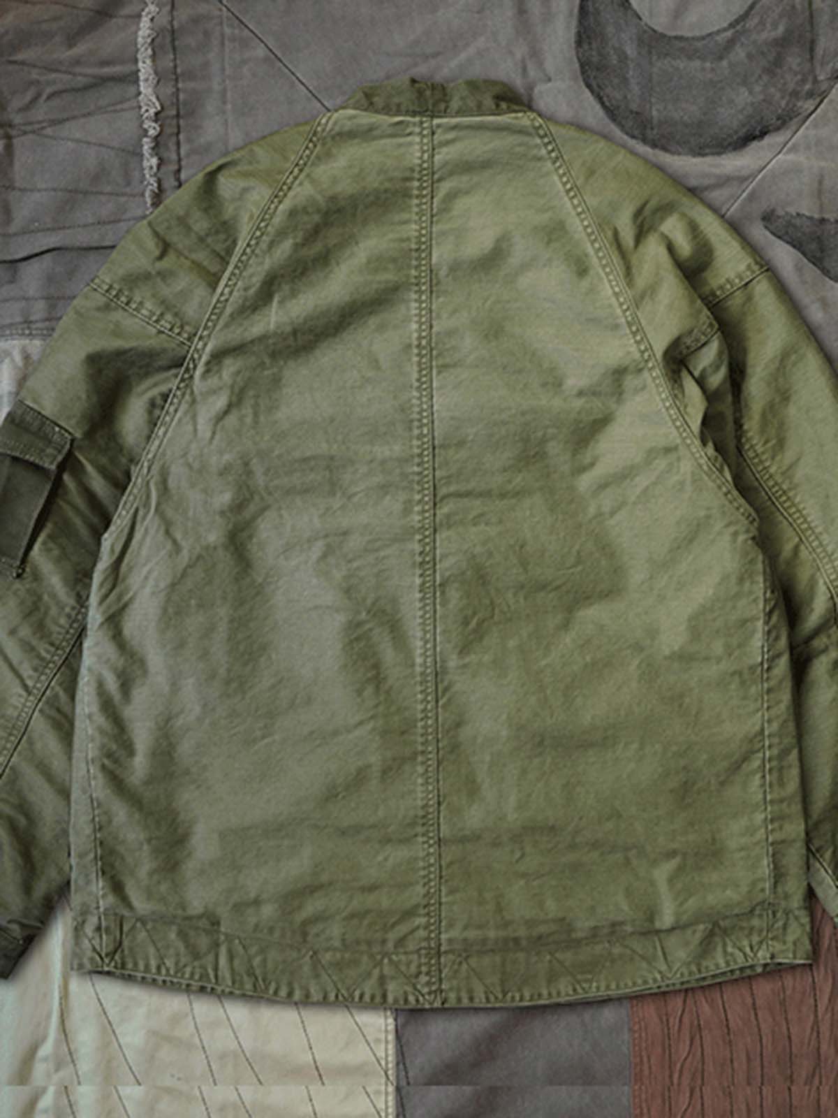 このミリタリースタイルの半纏は、実用的な軍隊の要素とモダンなデザインが見事に融合しています。全体のデザインは6つの大容量ポケットを配置し、日常的なアイテムの収納がしやすく、機能性を高めています。380gの高密度竹節綿と細帆布のコントラストデザインに、200gの長綿コットンを裏地に使用し、快適さと質感が向上しています。ショルダースリーブデザインにより、肩回りの広さが増し、ゆったりとしたフィット感で様々な肩幅や胸囲に対応し、高い着心地を提供します。細部までこだわりの作りで、YKK製のメタルボタンがデザインのポイントになり、ディテールの精巧さを引き立てています。日常使いやアウトドアなど、ミリタリースタイルの独特の魅力を発揮するアイテムです。