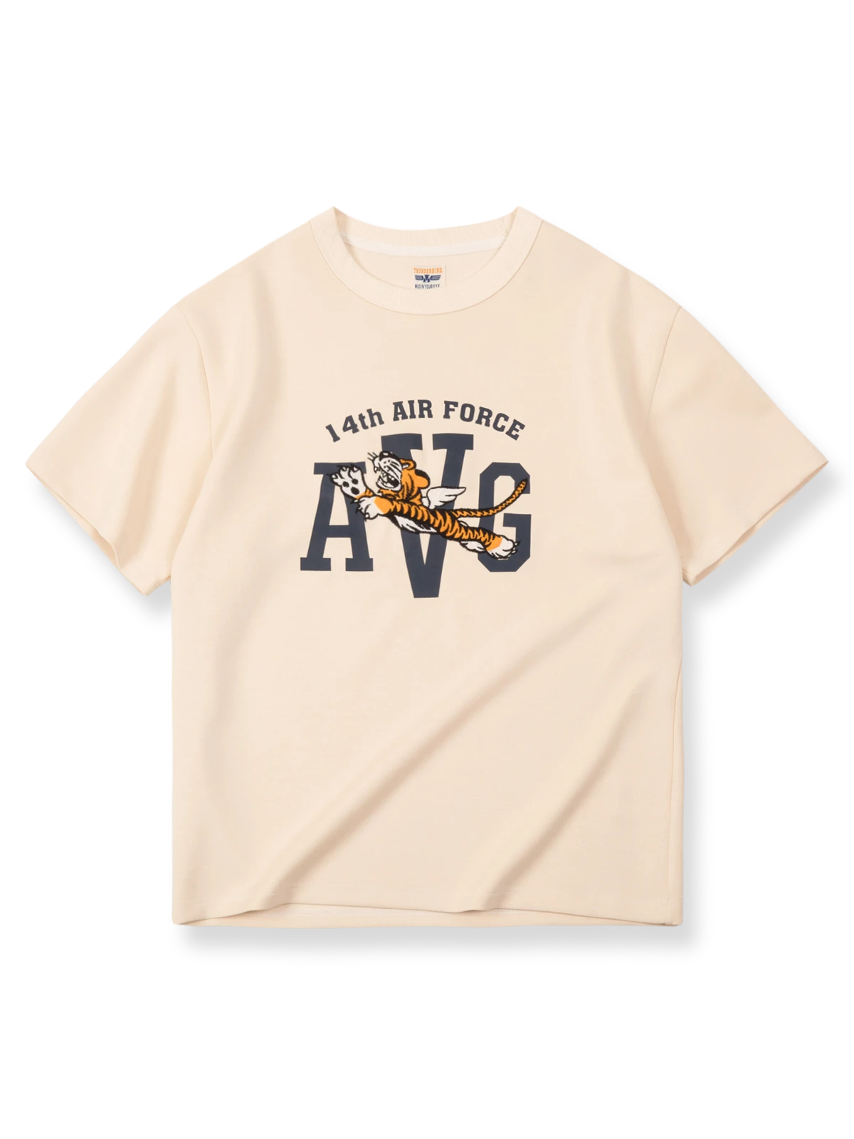 このTシャツには、胸部に「AVG」と飛虎のイメージが印刷されており、刺繍とプリント技術の組み合わせで、精巧な手工芸とディテールが表現されています。衣服の色とパターンのデザインにより、カジュアルな装いに活気を与えます。