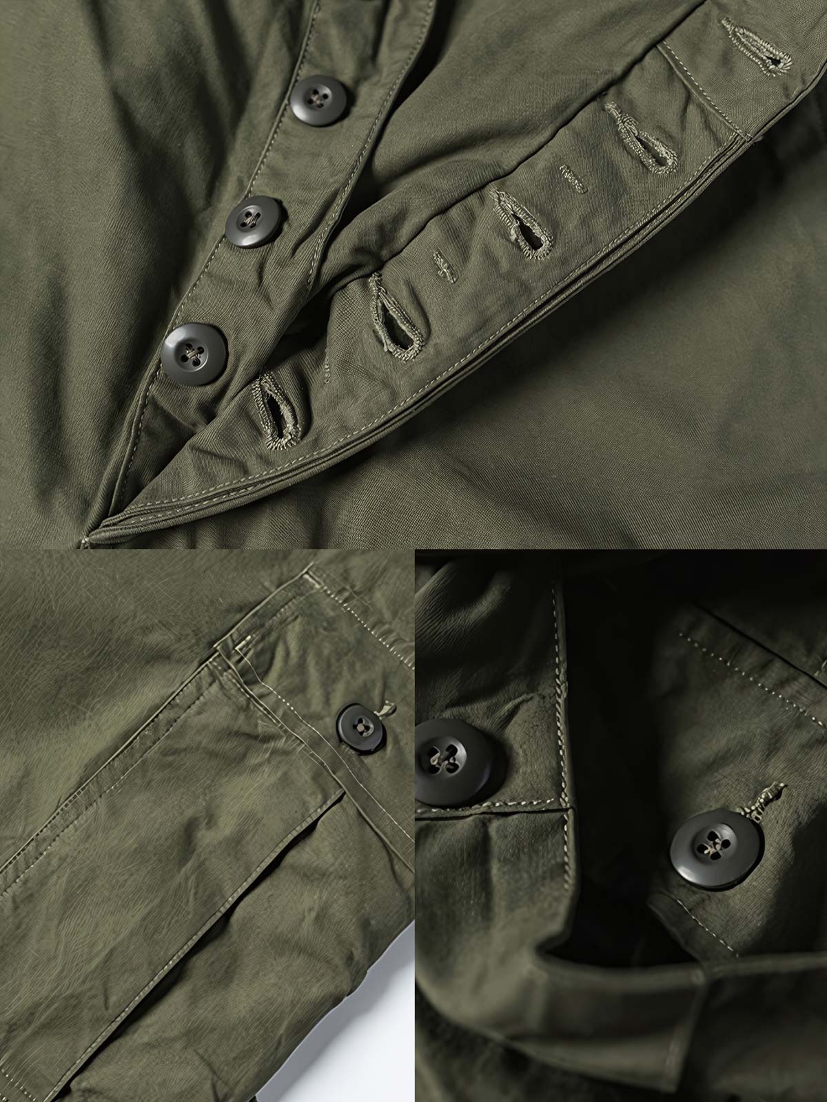 耐久性に優れたコットン素材を使用し、細部の丁寧な仕上げが特徴です。フロントのボタン留めや裾のドローコードが実用性を高めています。