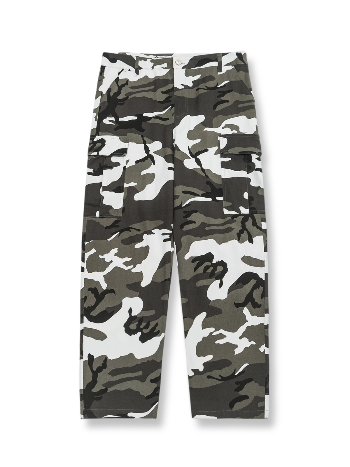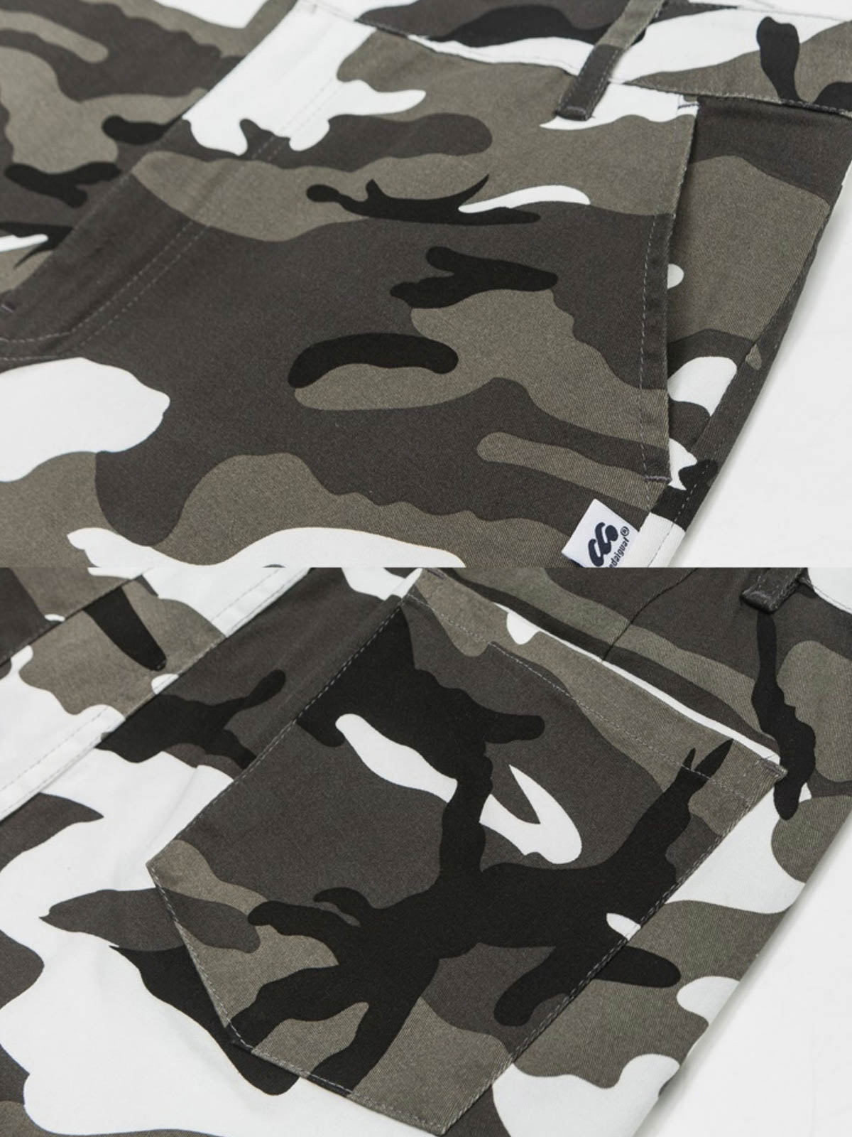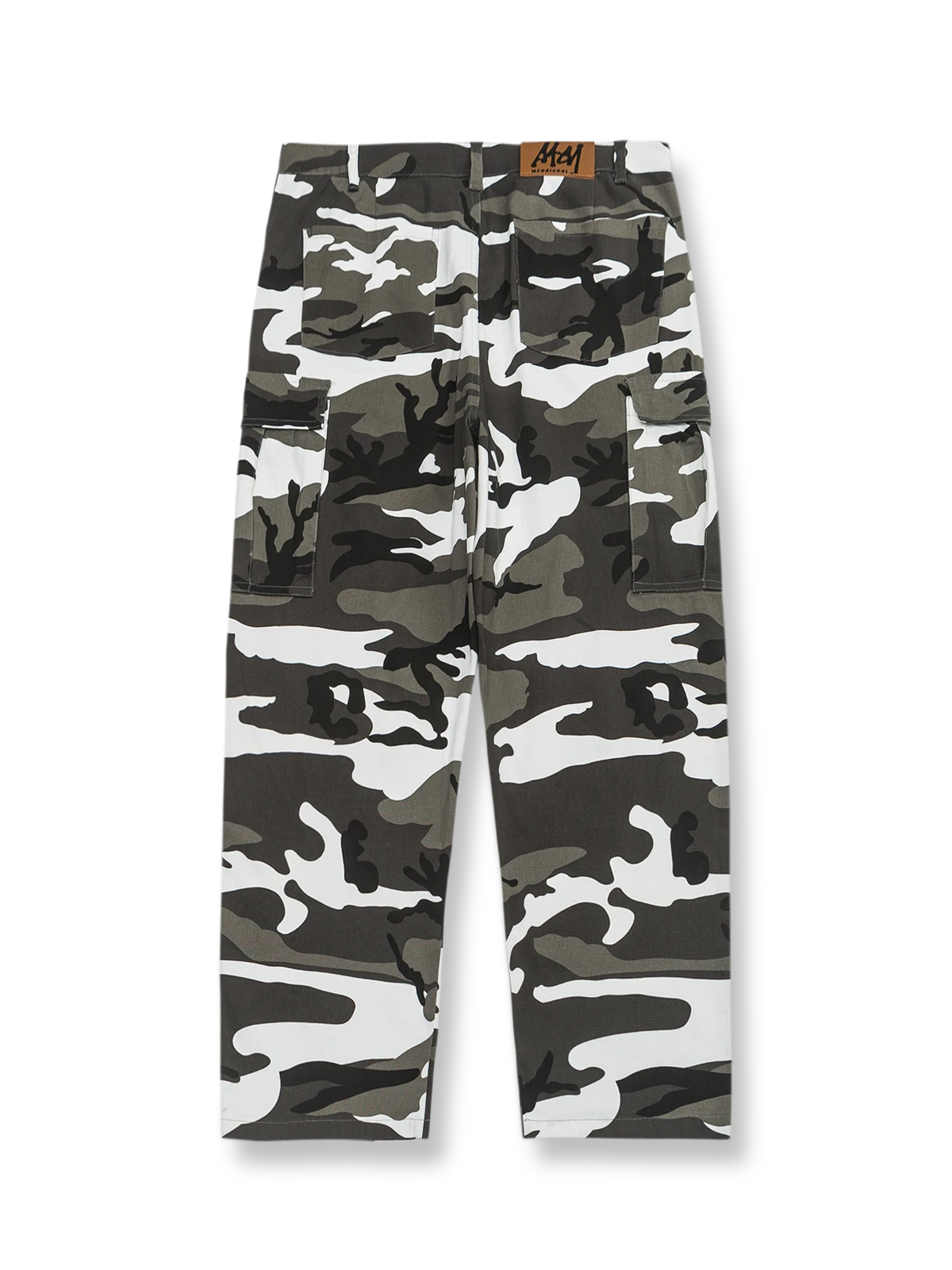 スノーカモフラージュパターンは軍事装備から派生し、雪の環境での迷彩効果を目的として設計されました。このワークパンツは、伝統的な軍服への敬意を込めつつ、現代のストリートカルチャーに適応するデザインで再解釈されています。