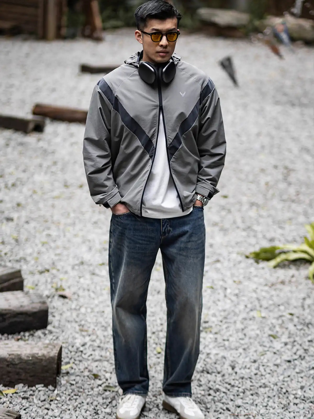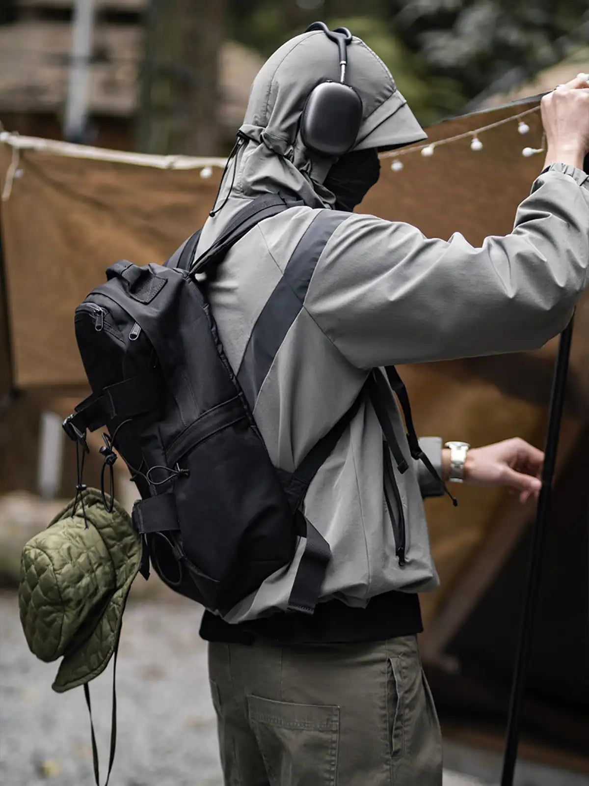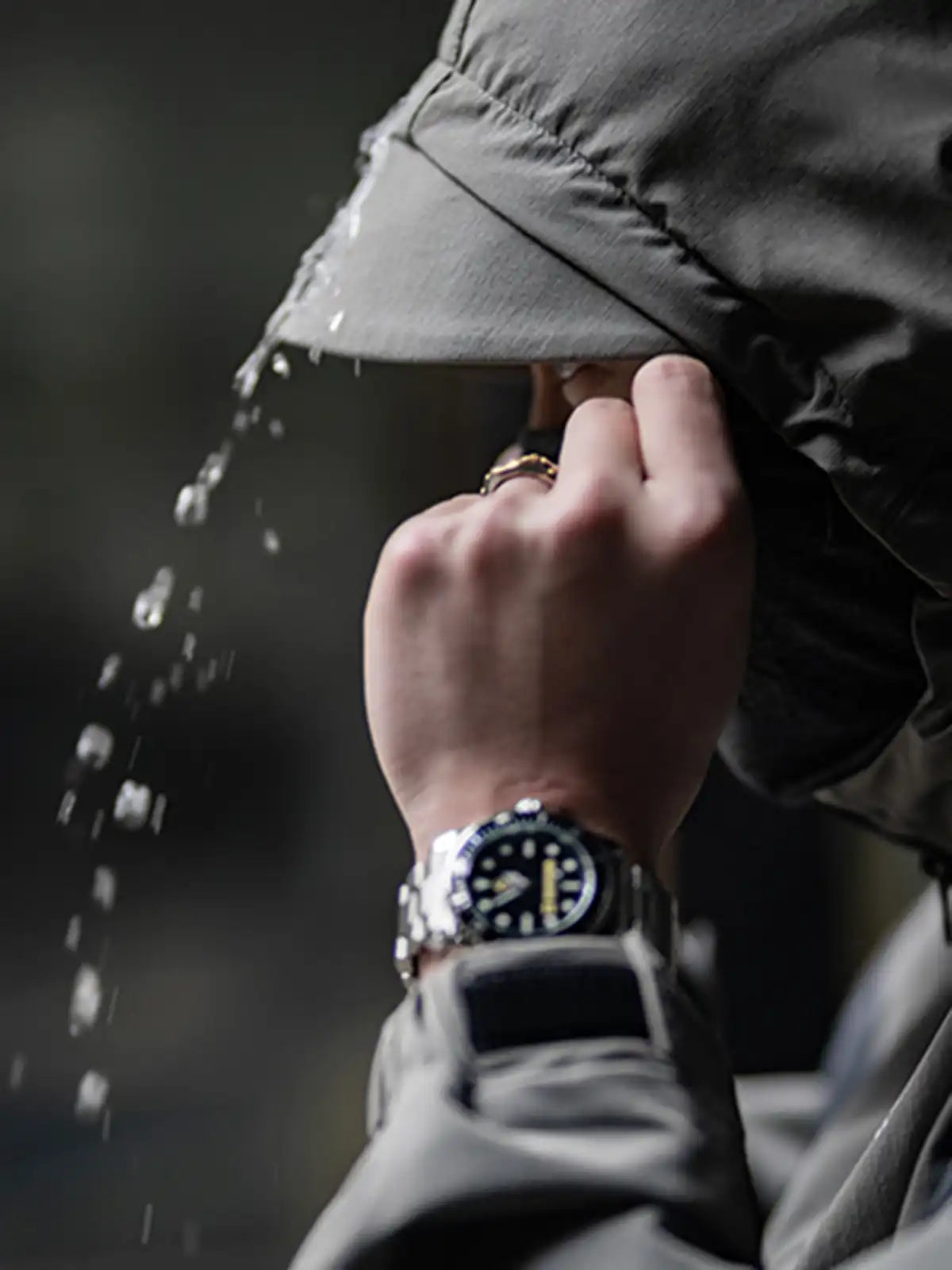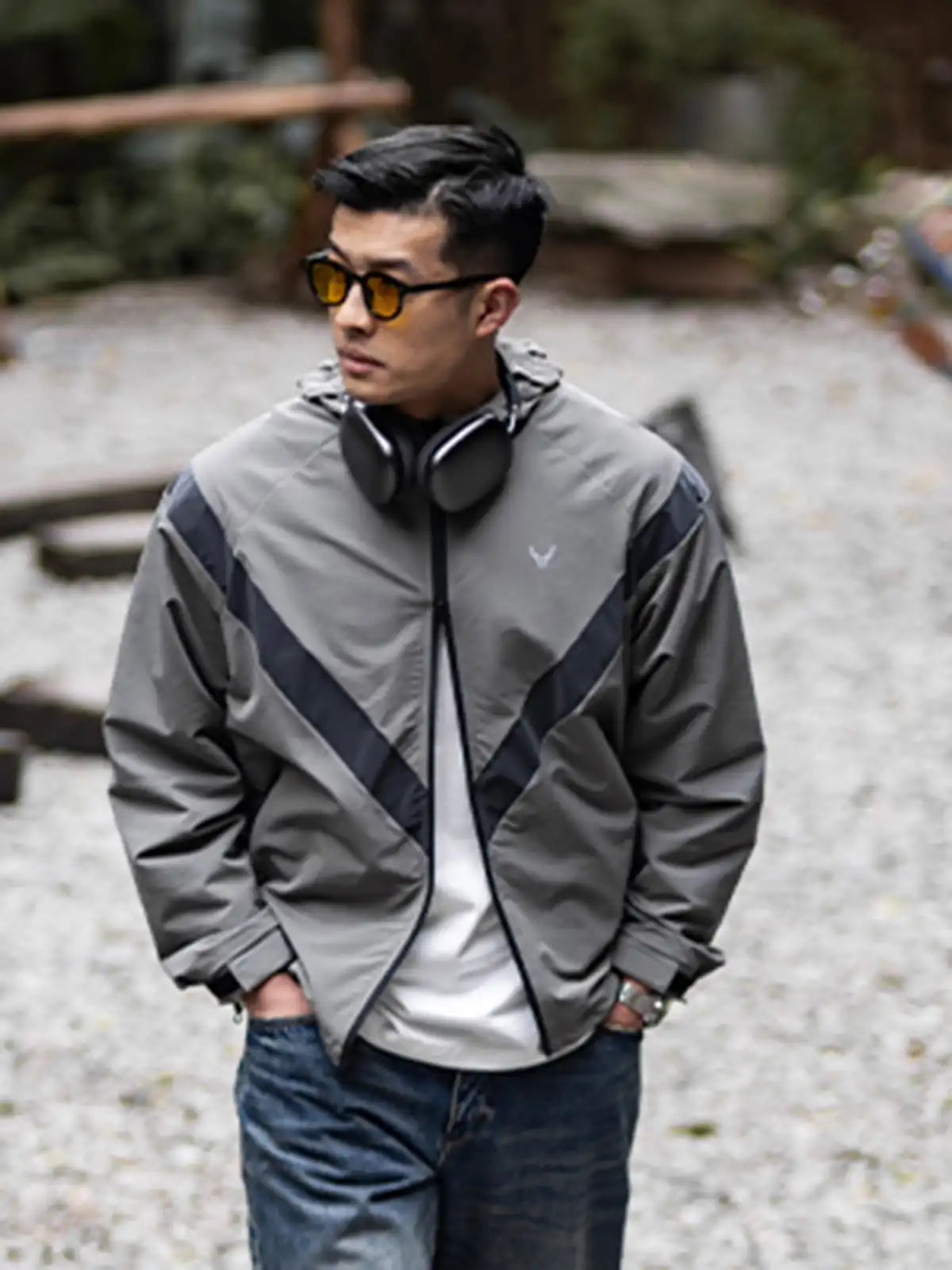 1990年代に米軍が採用したIPFU(Improved Physical Fitness Uniform)をベースに、アウトドア機能とミリタリー要素を融合したハイブリッドデザイン。4方向ストレッチが効くソフトシェル素材に特フッ素防水コーティングを施し、5000mm相当の耐水圧を実現。フードは3点調整式でヘルメットやキャップとの併用が可能。ラグランに近い肩のパターンで、アジア体型に合わせてゆったりとしたシルエットを保ちつつ、動きやすさを向上。夜間の視認性を高める反射プリントのVロゴや、ミリタリーライクな圧着ジッパーなど、細部にわたるディテールにもこだわりを感じさせる一着。
