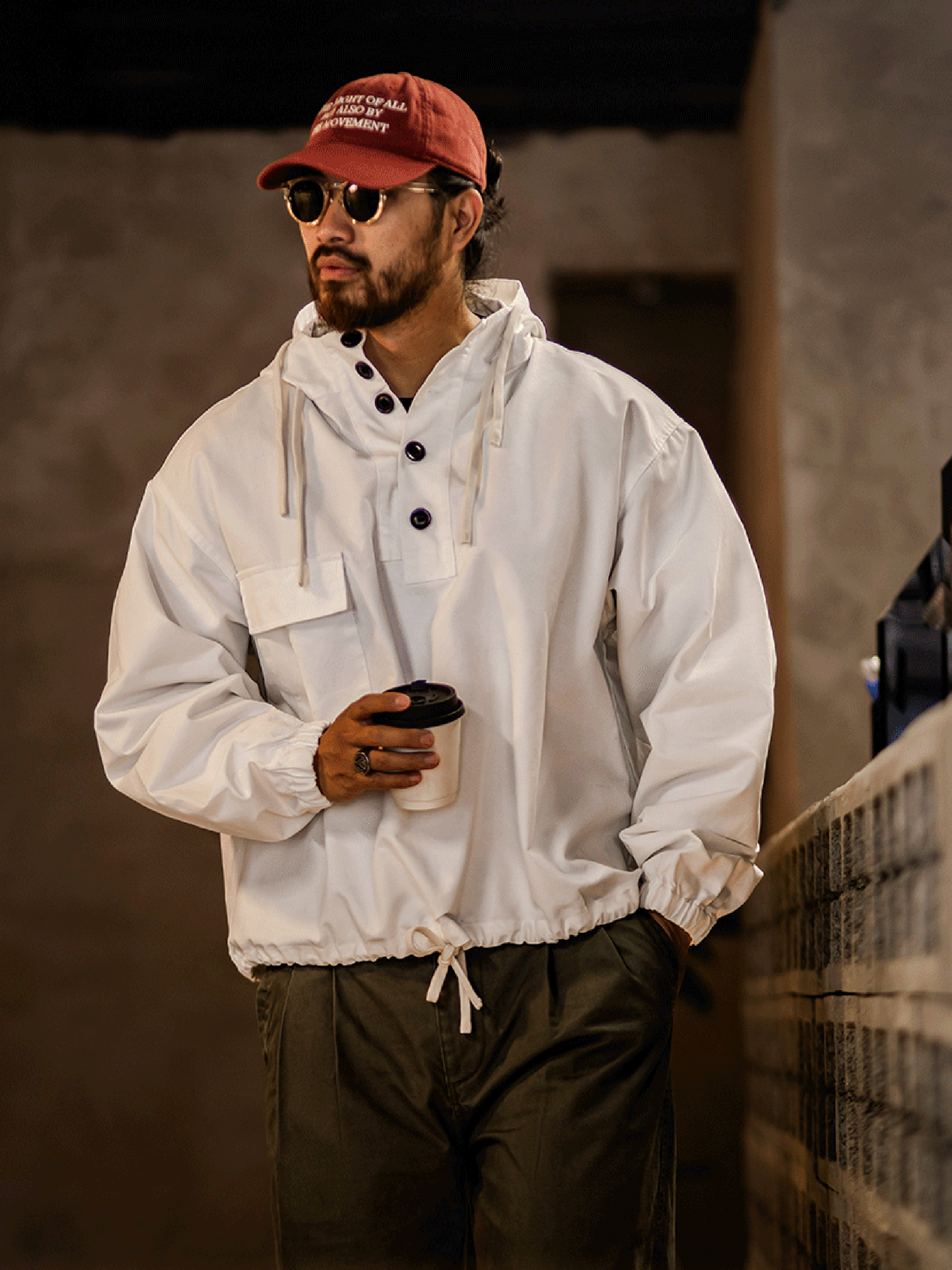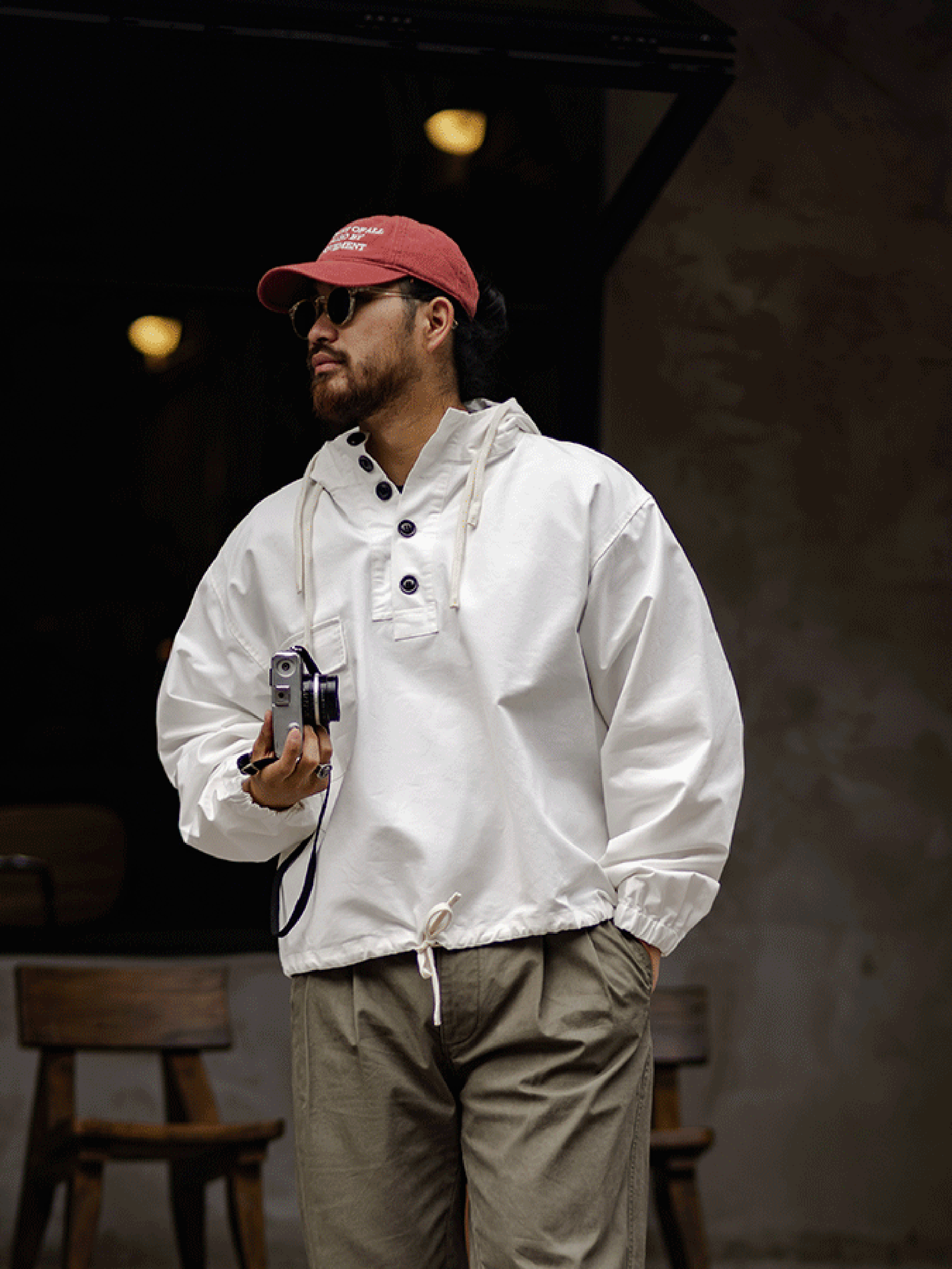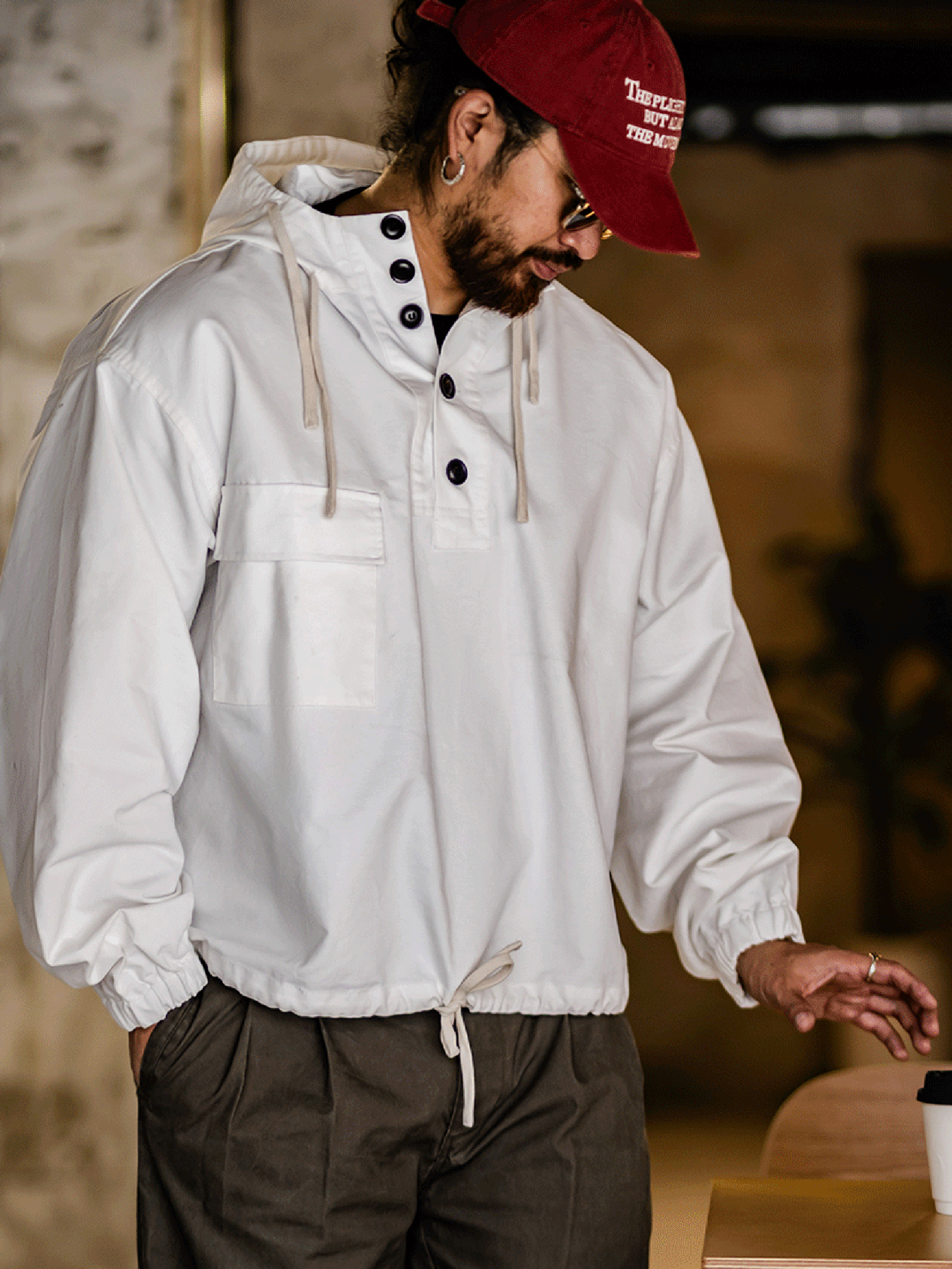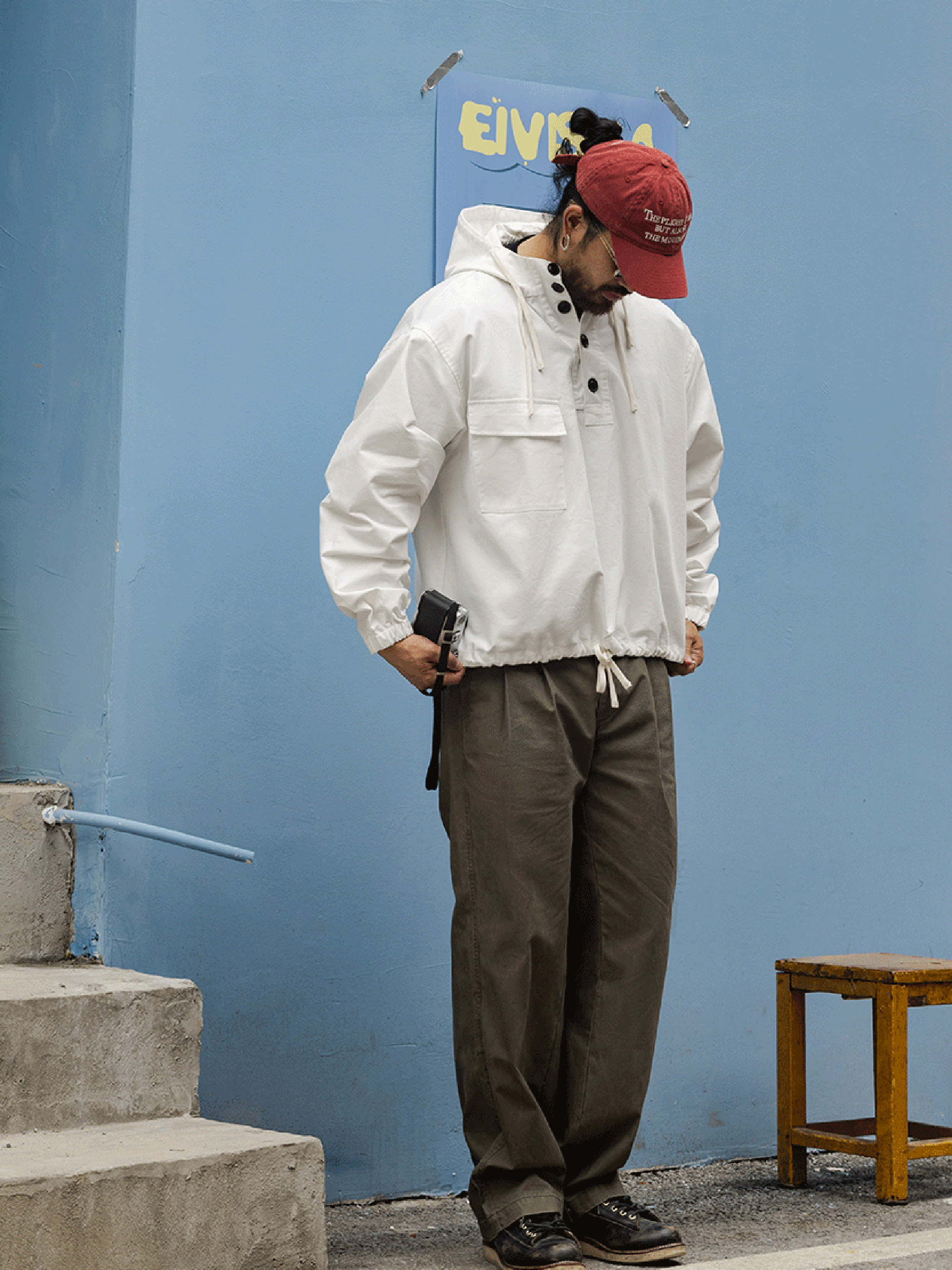 このプルオーバーパーカーは、第二次世界大戦期の軍用防護服をモチーフに、半開襟とワイドシルエットを取り入れた実用性とデザイン性を両立する一着です。