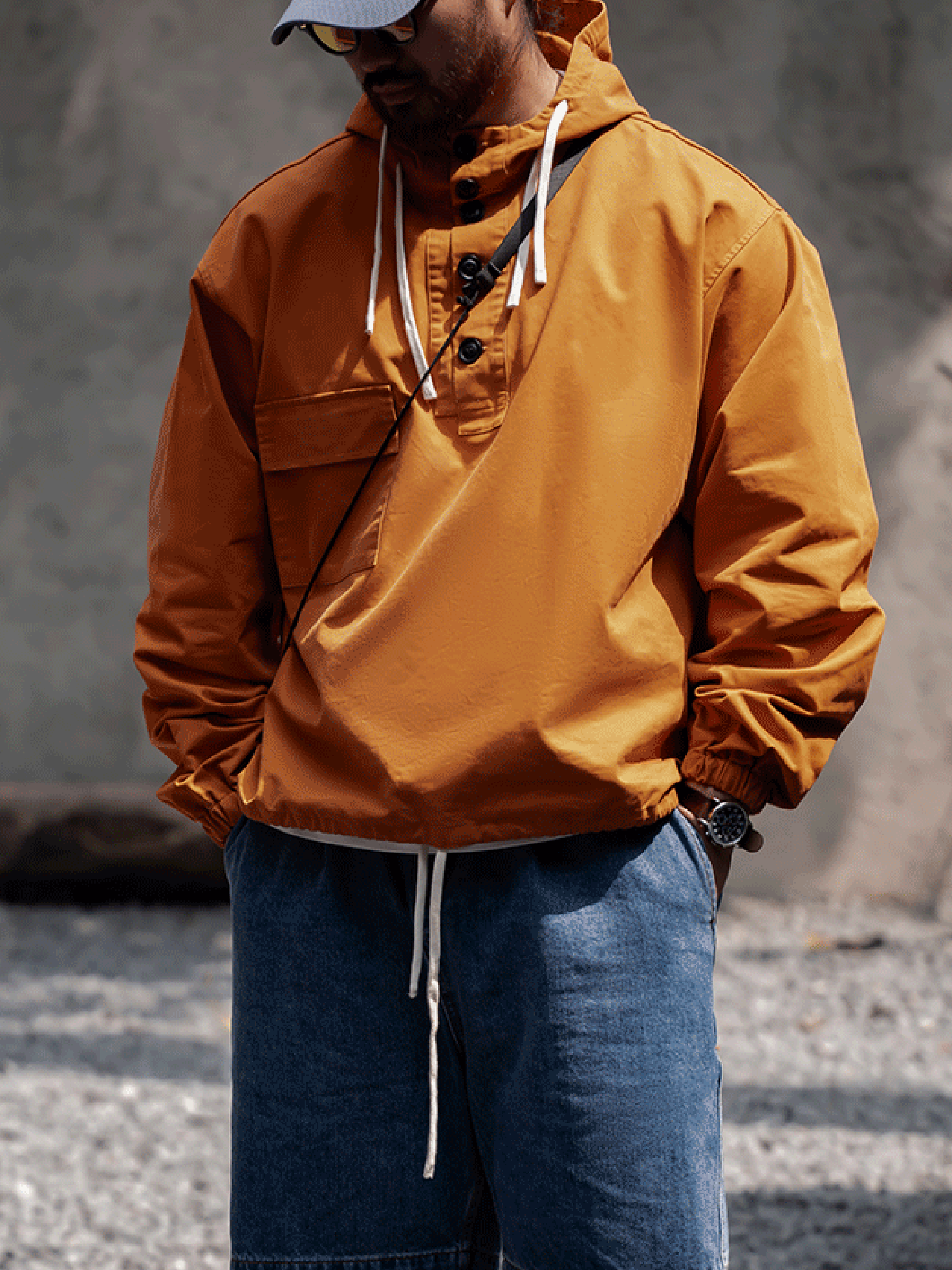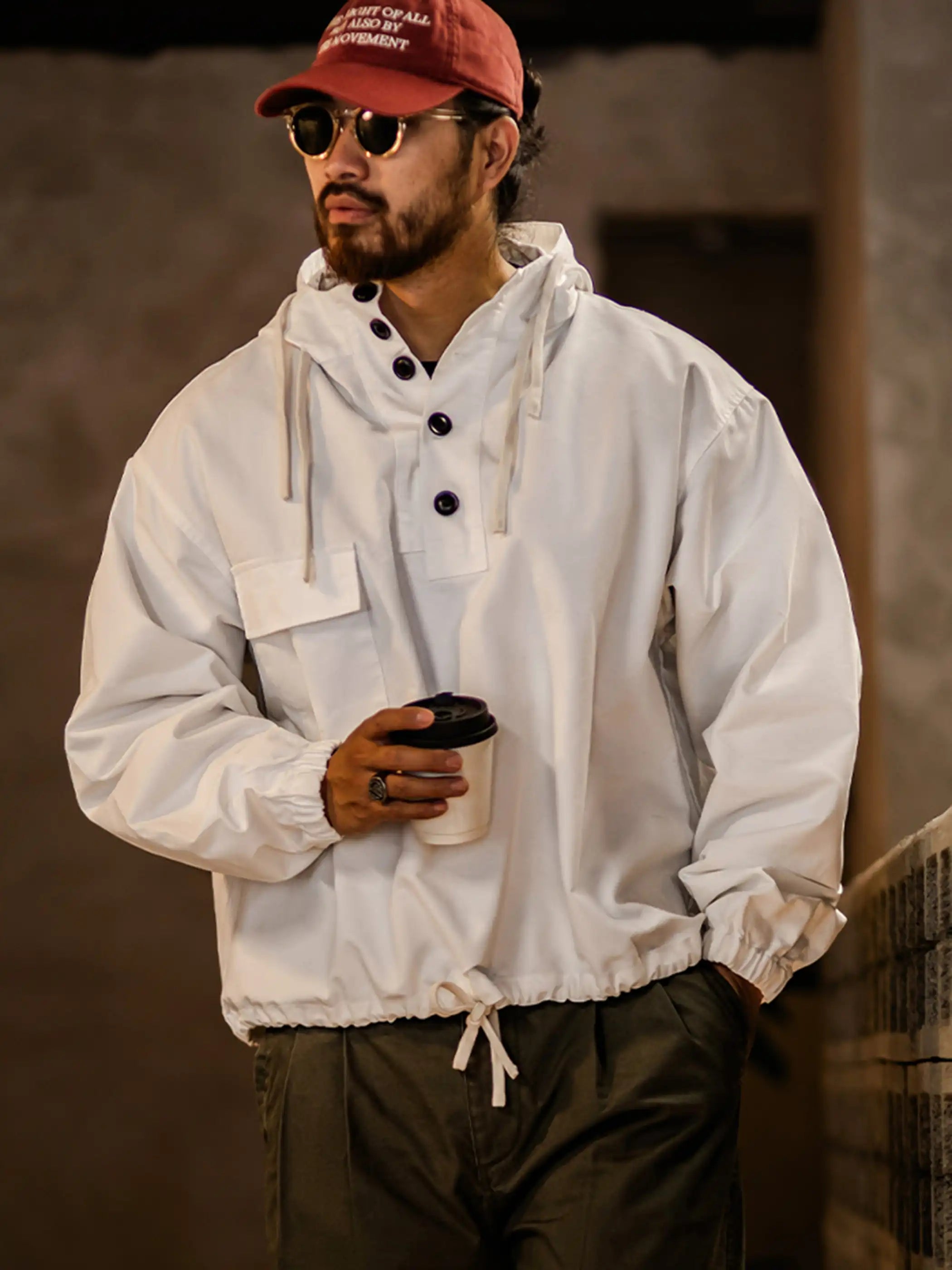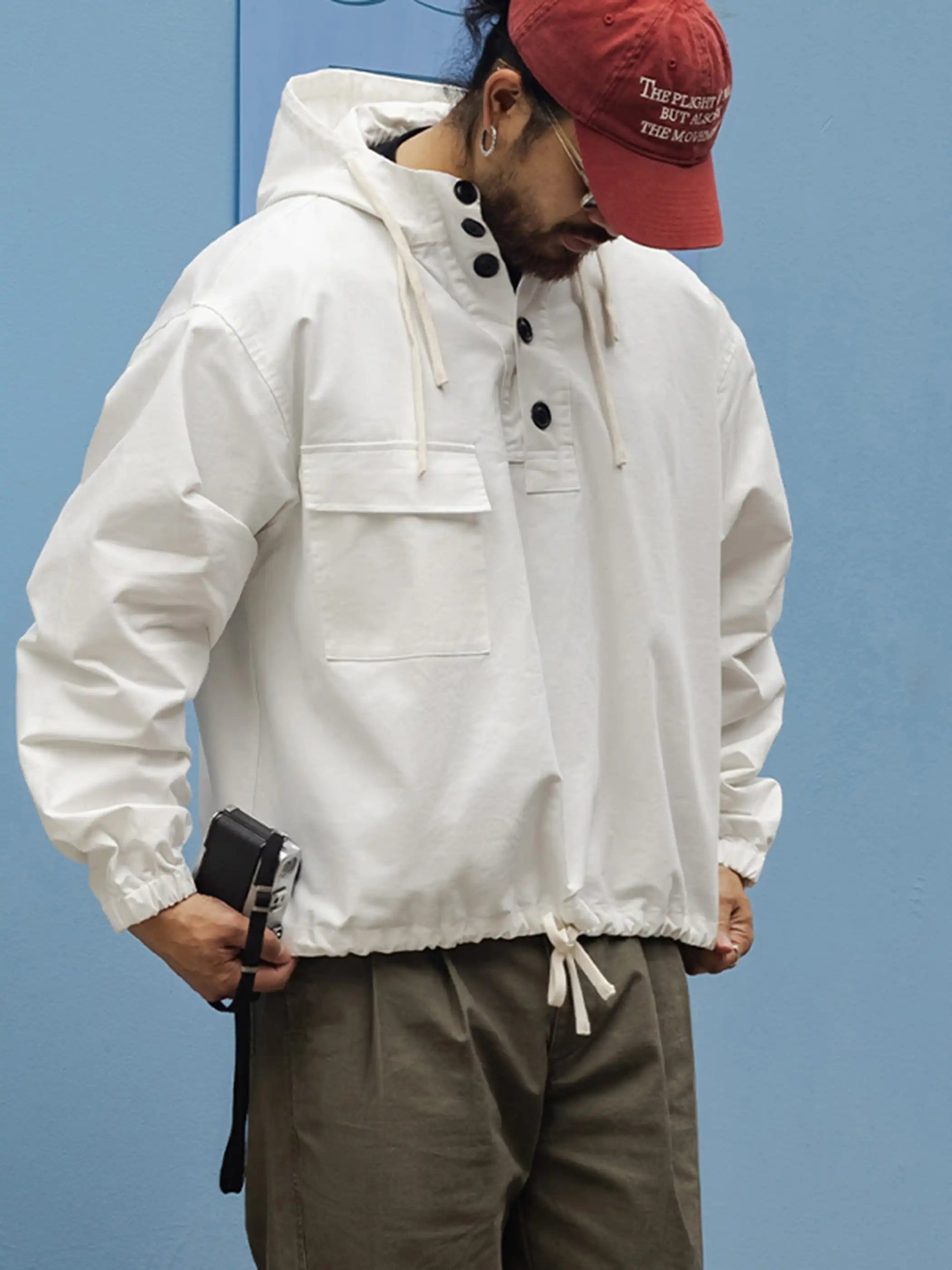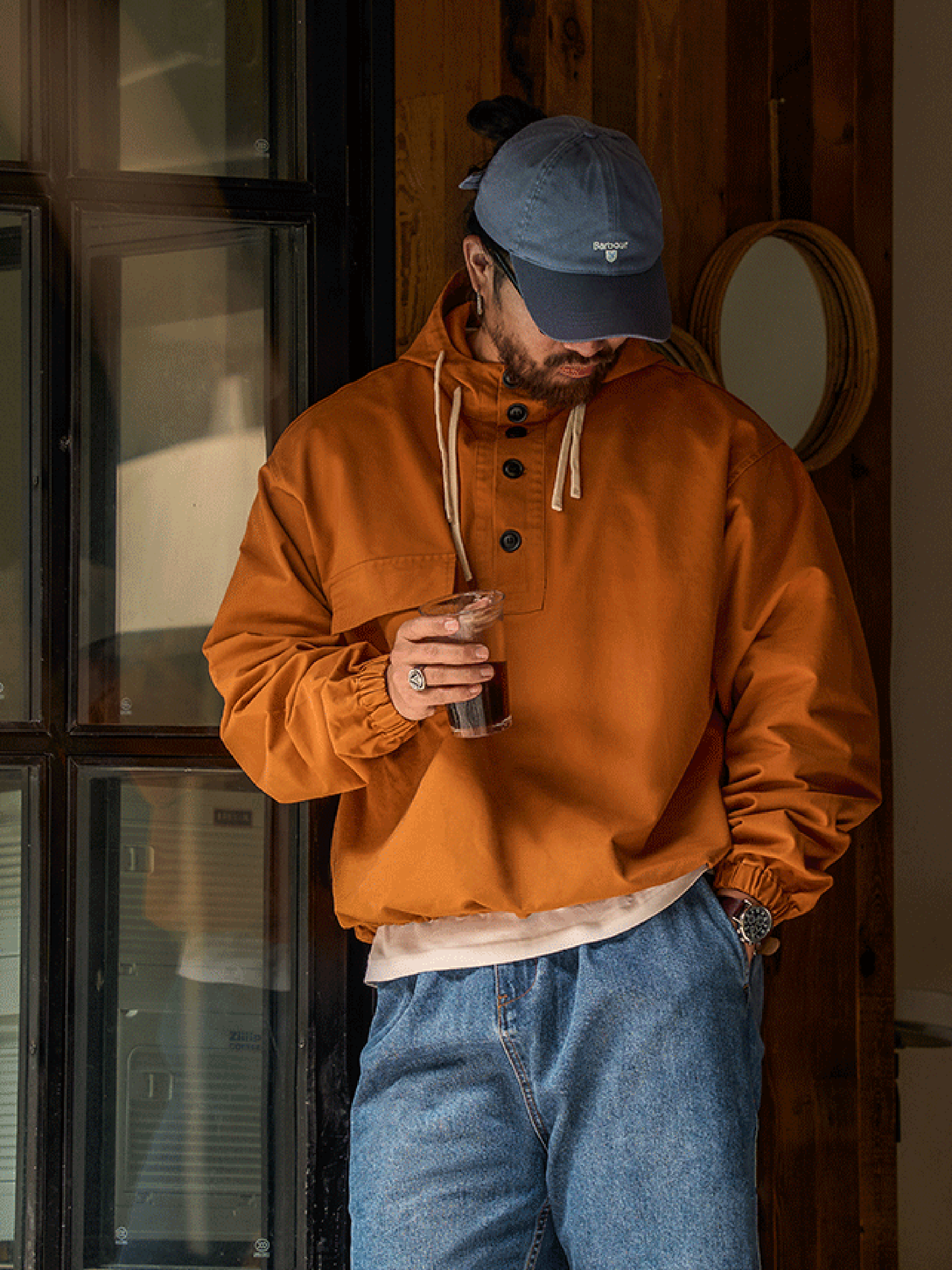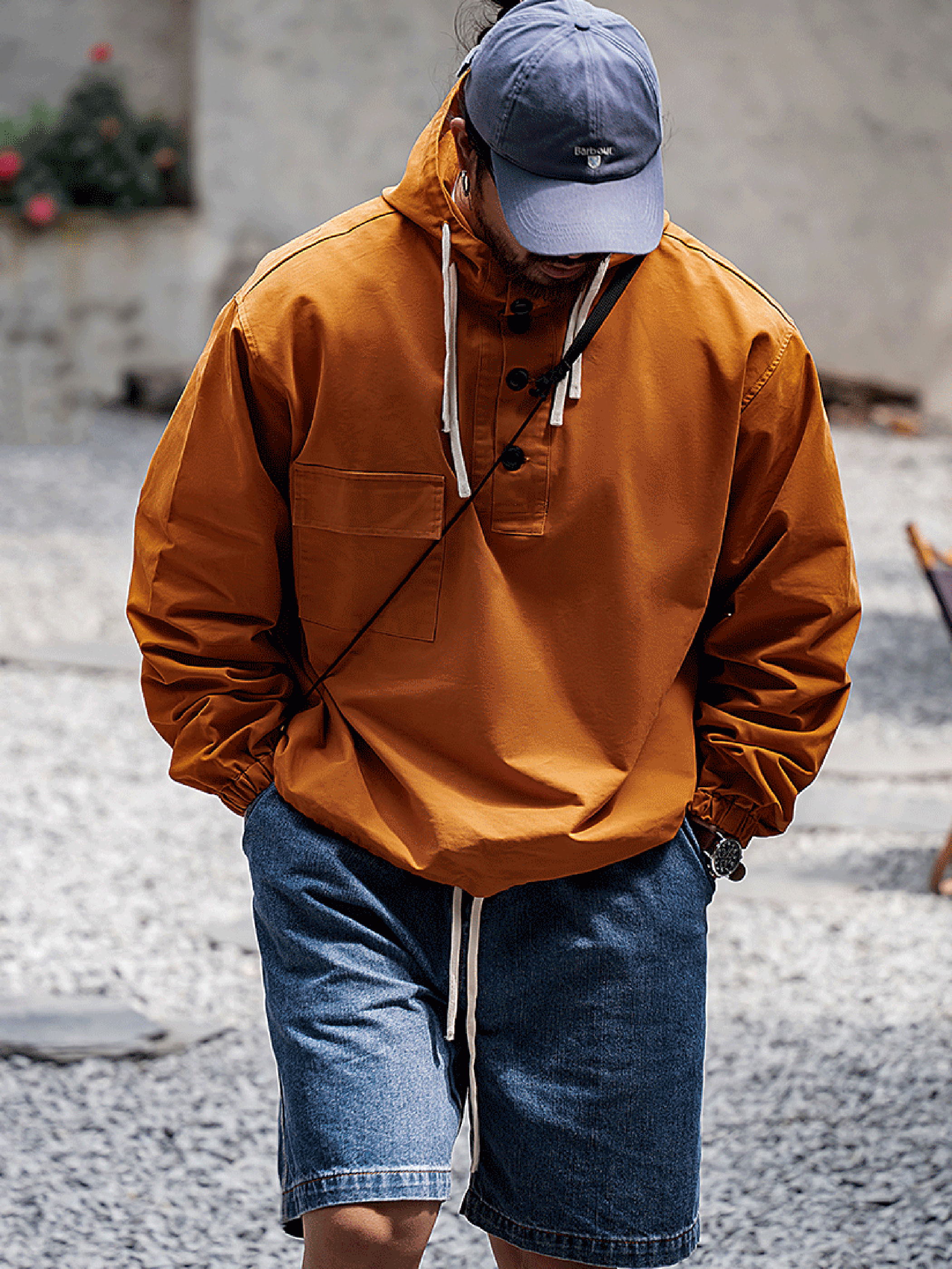 このプルオーバーパーカーは、第二次世界大戦期の軍用防護服をモチーフに、半開襟とワイドシルエットを取り入れた実用性とデザイン性を両立する一着です。