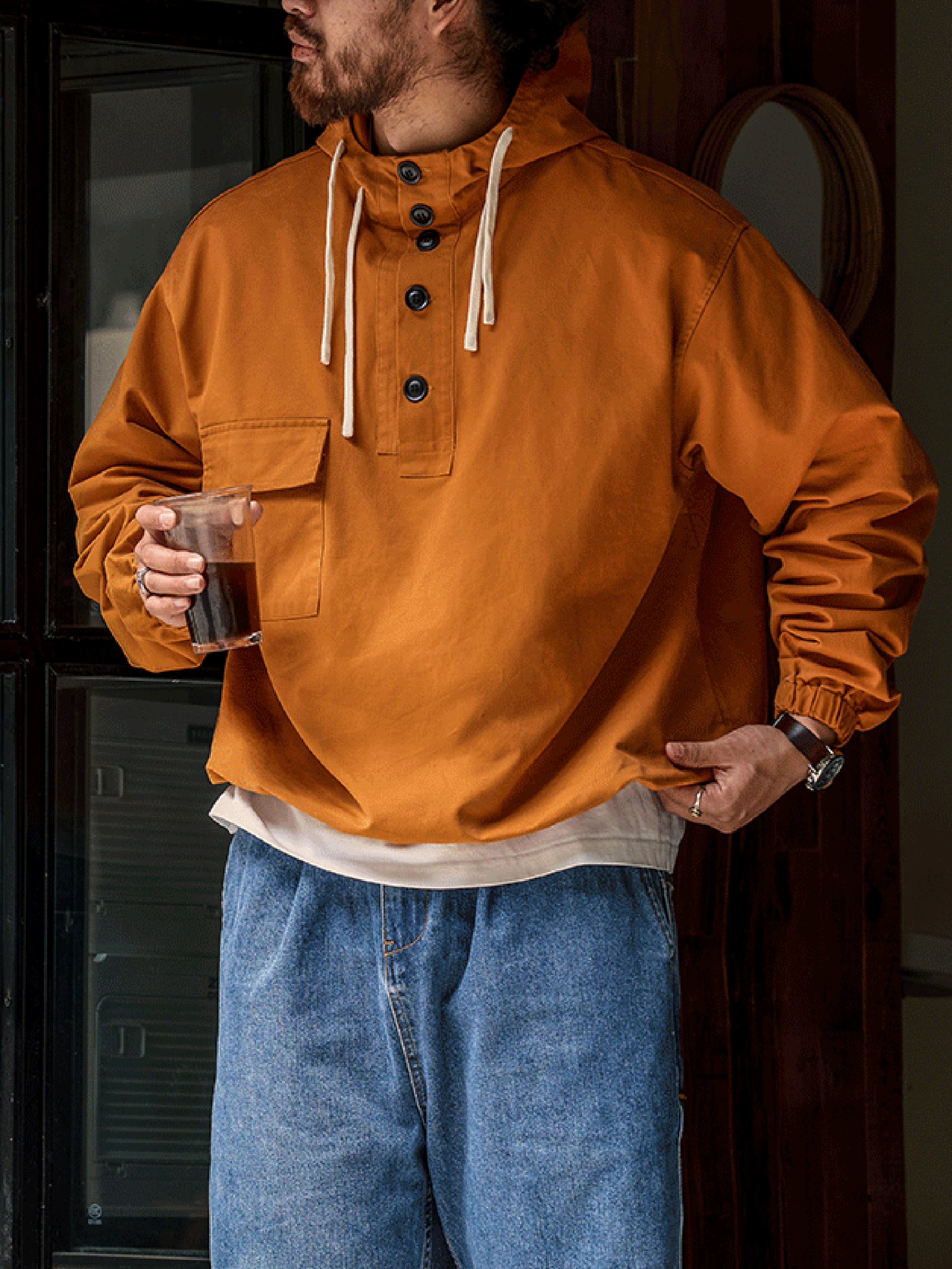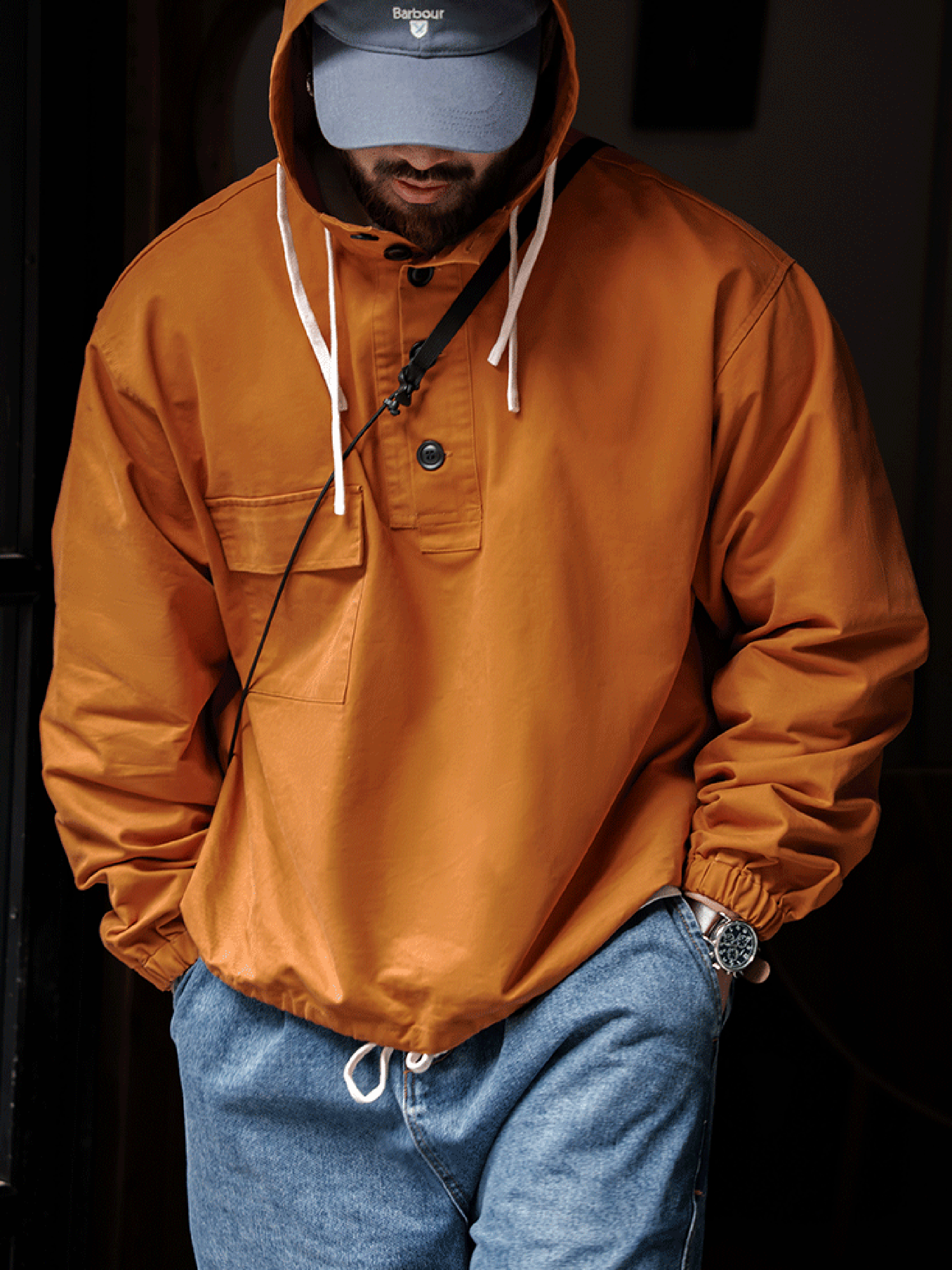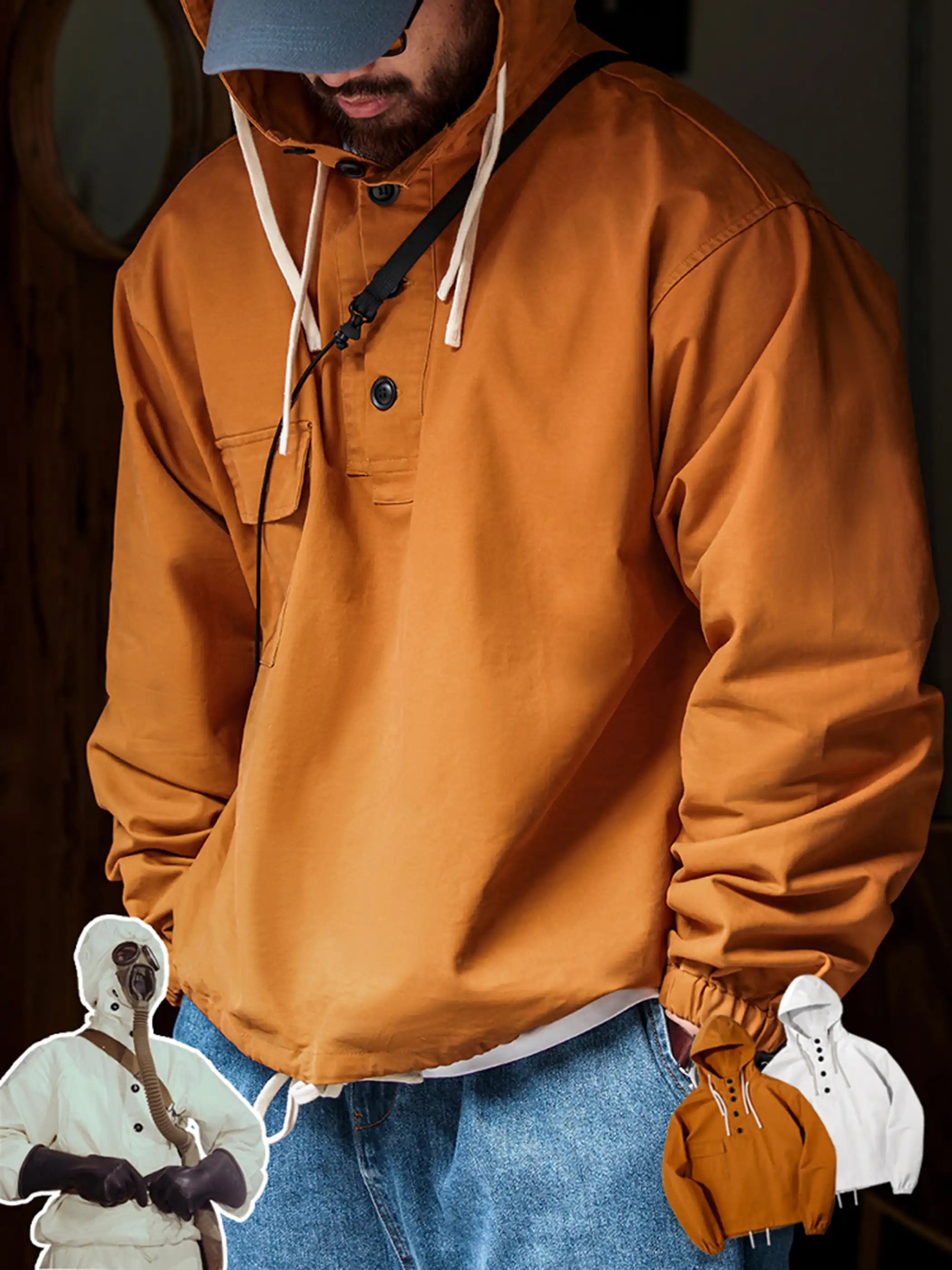 本アイテムは、1940年代の軍用ガス防護服「Gas-Protect Smock」をベースに、現代的な衣装として再構築。310gのダブルワープツイル生地(コットンベース)を使用し、しっかりとした耐久性と程よいハリ感を実現。フロントは半開襟デザインでボタンとドローコードがアクセントとなり、広めのフードや大きめポケットがミリタリーテイストを強調。袖口と裾にはドローコードとゴム仕様を採用し、フィット感を自由に調整可能。オーバーサイズ寄りのシルエットはストリートやアウトドアの着こなしに最適で、機能性とヴィンテージ感を両立させたユニセックスなプルオーバーです。