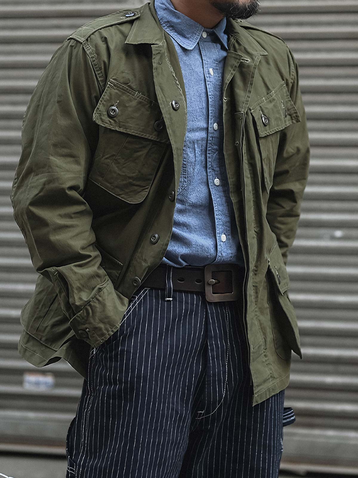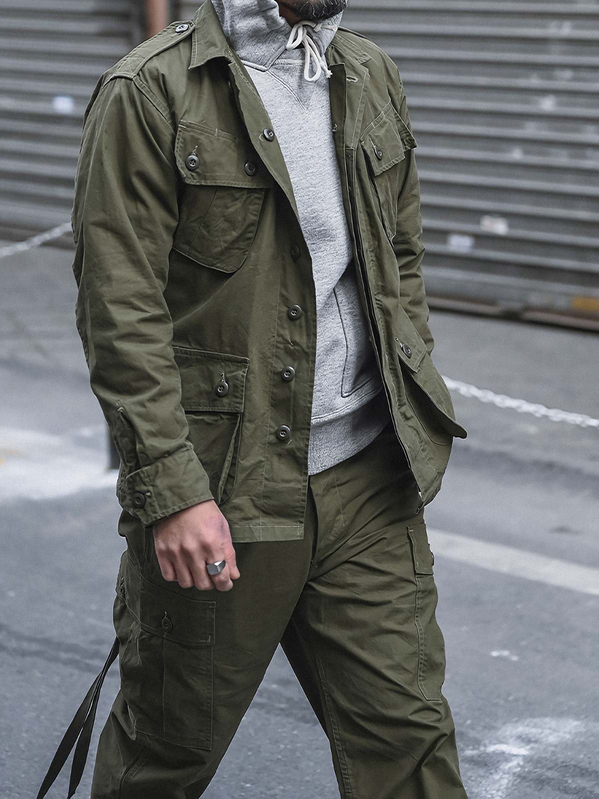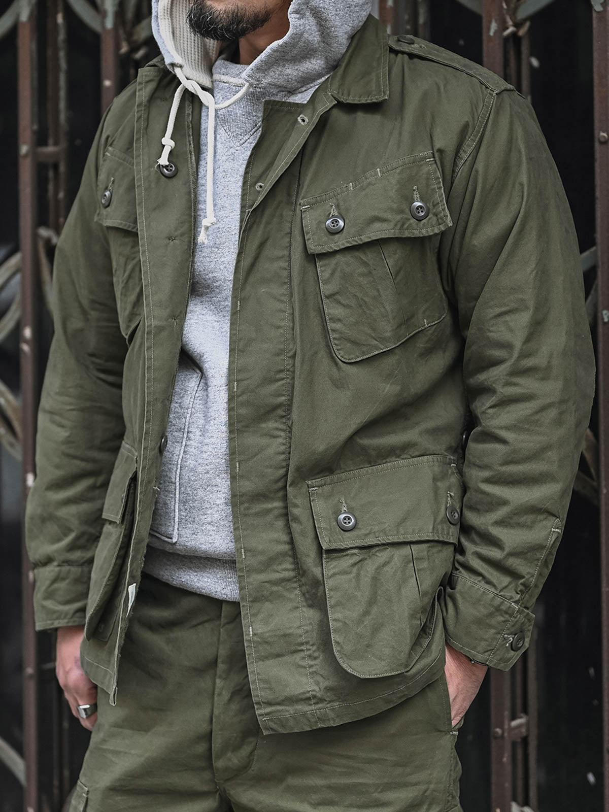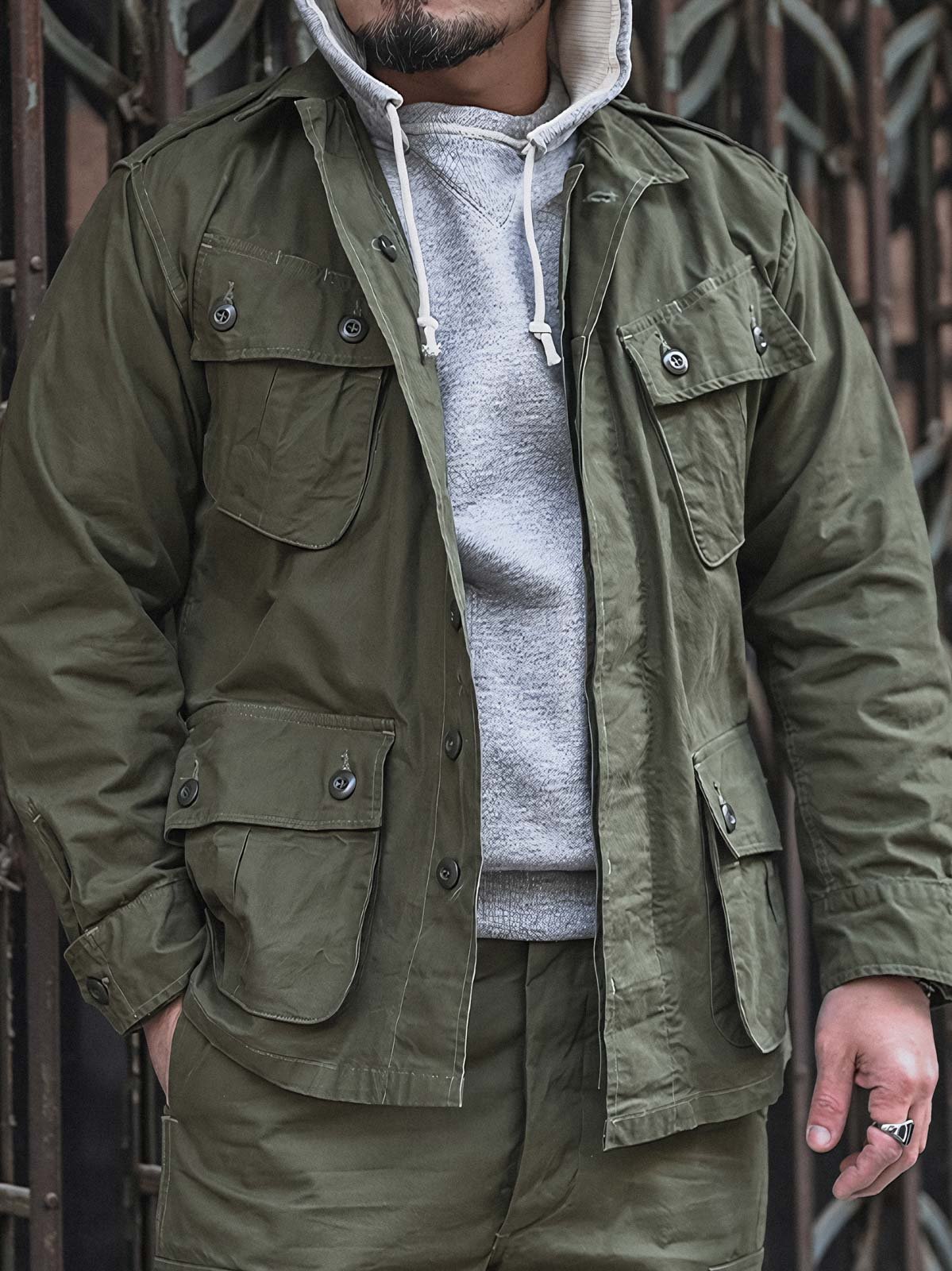 このフィールドジャケットは、軍用衣料に触発された実用的なデザインです。歴史的には、兵士の機能性と快適性を高めるために開発されました。多機能ポケットは、必需品を携帯するための軍の要件から生まれたものです。