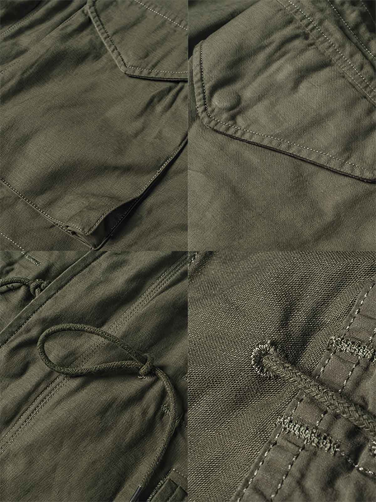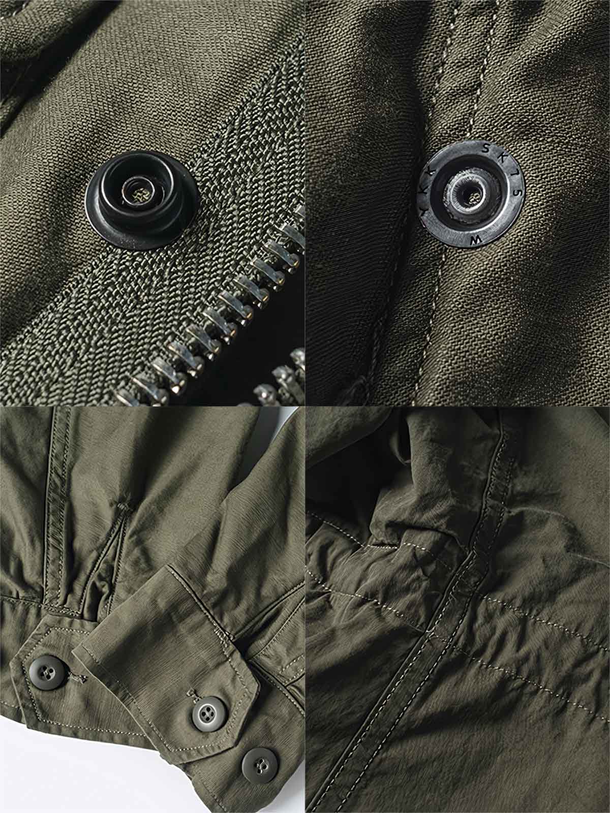 M-51ジャケットは時代の軍服に影響を受けたデザインで、耐久性と実用性を兼ね備えています。ジャケットのフロントには多数のポケットが配置され、機能性とスタイルが考慮されています。引き締められたウエストと隠しフードは、オリジナルの野戦服の要素を反映しています。