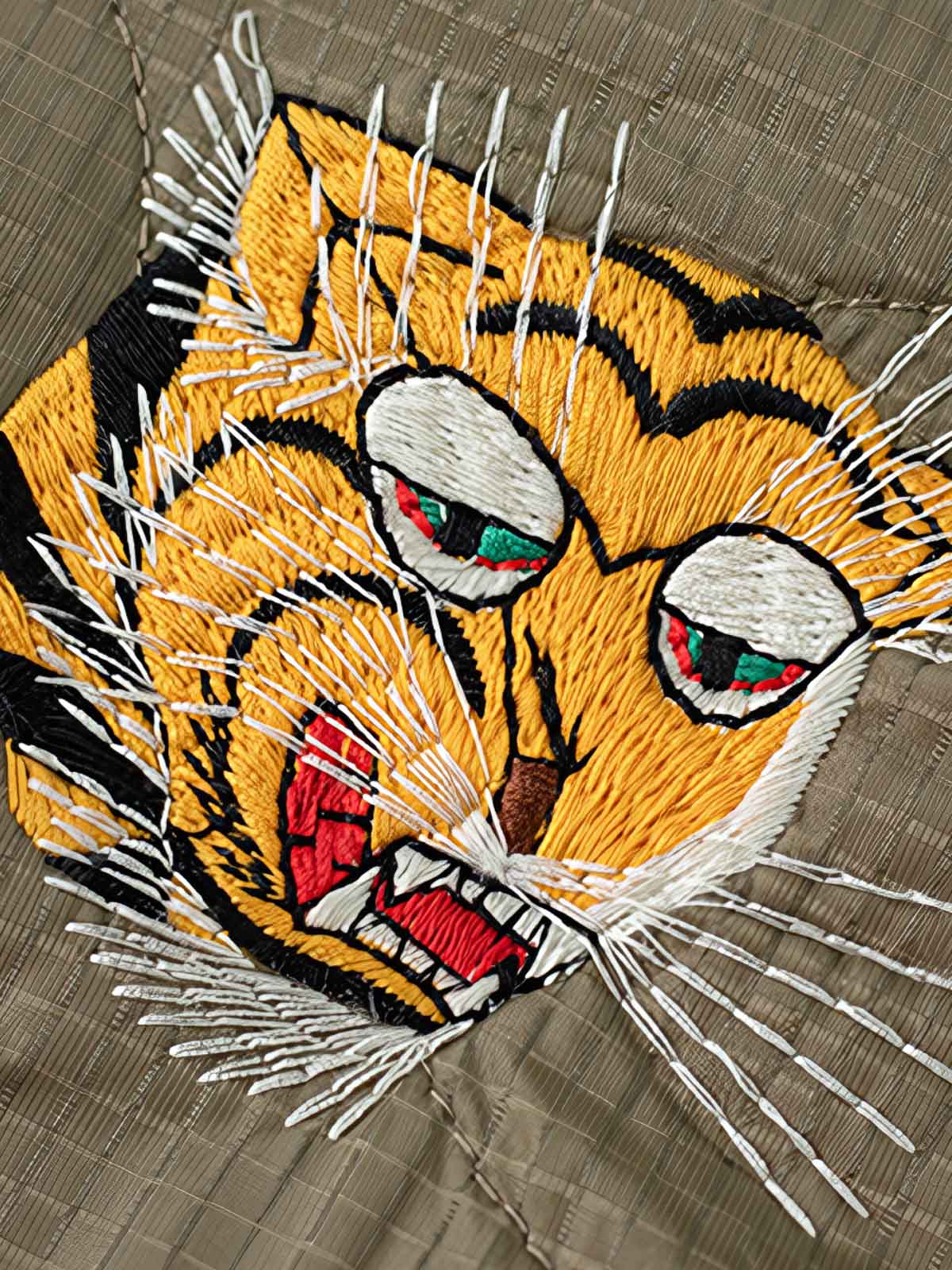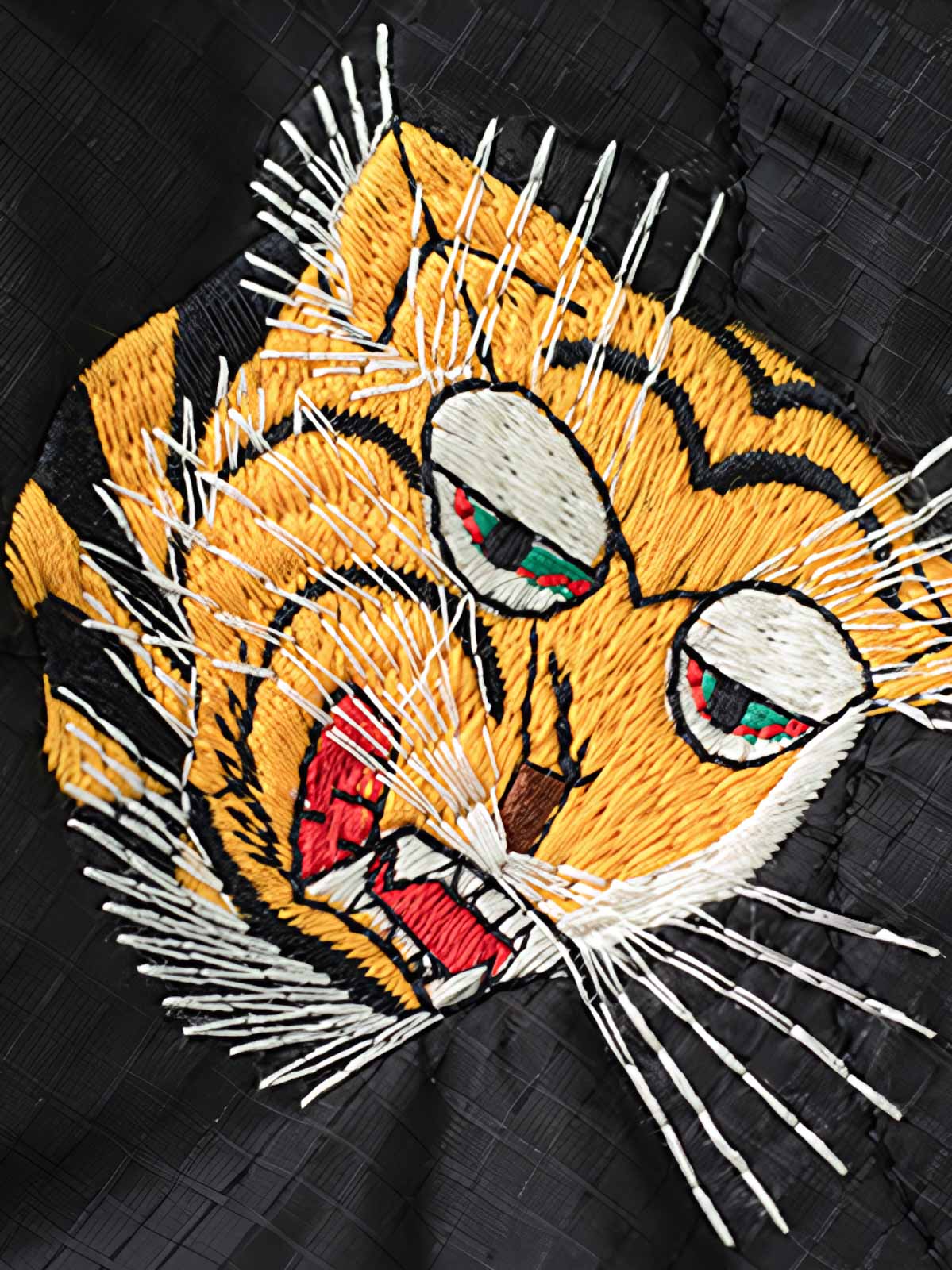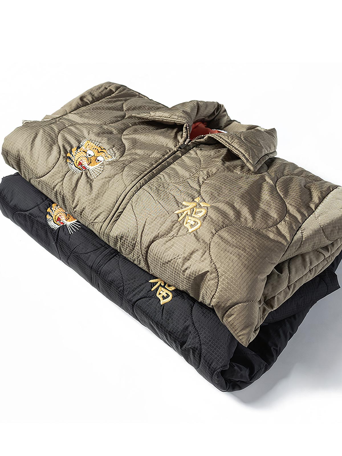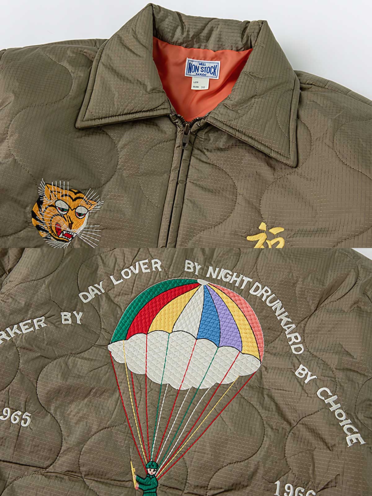 このジャケットは、ベトナム戦争時代のスーベニアジャケットをモチーフに、虎頭と福字のフロント刺繍が護りと縁起を象徴。袖には色鮮やかな龍の刺繍、背面には兵士の格言が施され、当時の文化的シンボルを凝縮しています。表地にはメッシュ状のナイロン素材を採用し、軽量かつ耐久性を確保。中綿にはシルクコットン(ポリエステル)を使用し、程よい保温性を実現。酵磨水洗加工による自然なユーズド感と立体的な風合いが特徴で、黄銅製のYKKジッパーや樹脂ボタンが全体の質感を引き立てます。ゆとりのあるレギュラーフィットで、カジュアルなデイリースタイルからワークパンツやブーツを合わせたヴィンテージコーデまで、幅広く着こなせる一着です。