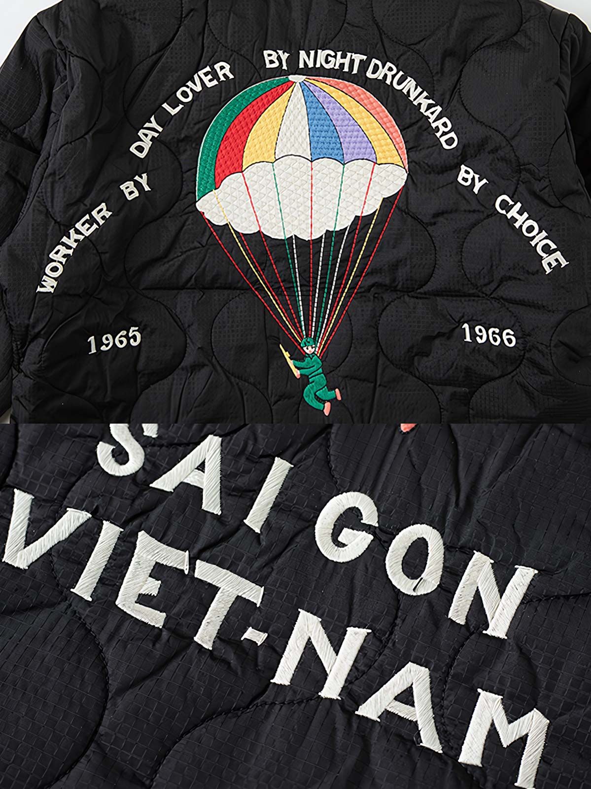 ベトナム戦争期の文化をインスパイアし、刺繍とキルト加工を融合した独自のレトロスタイル。
