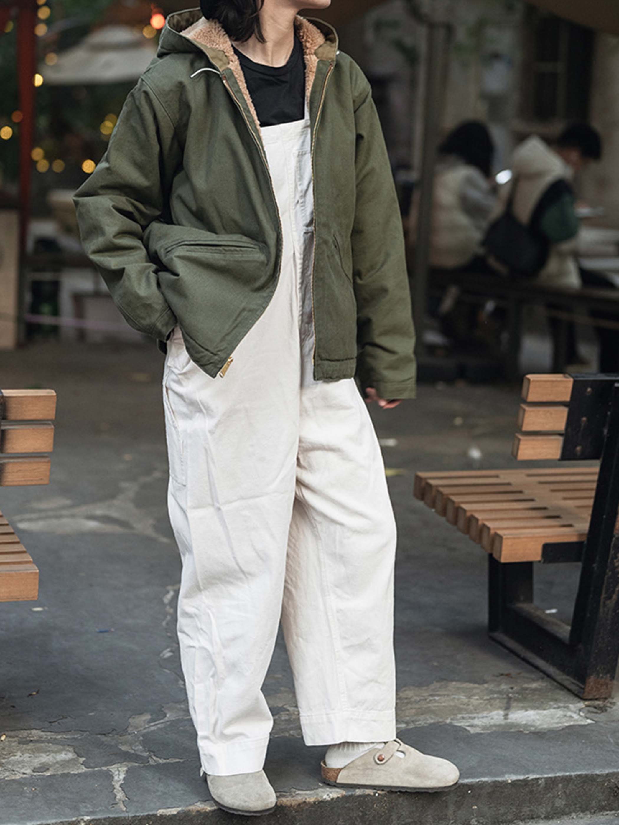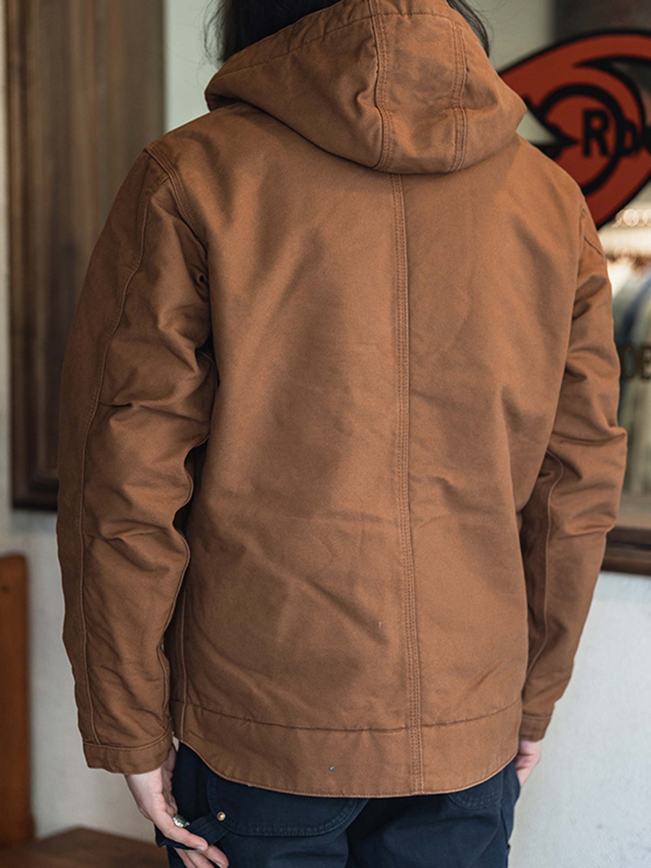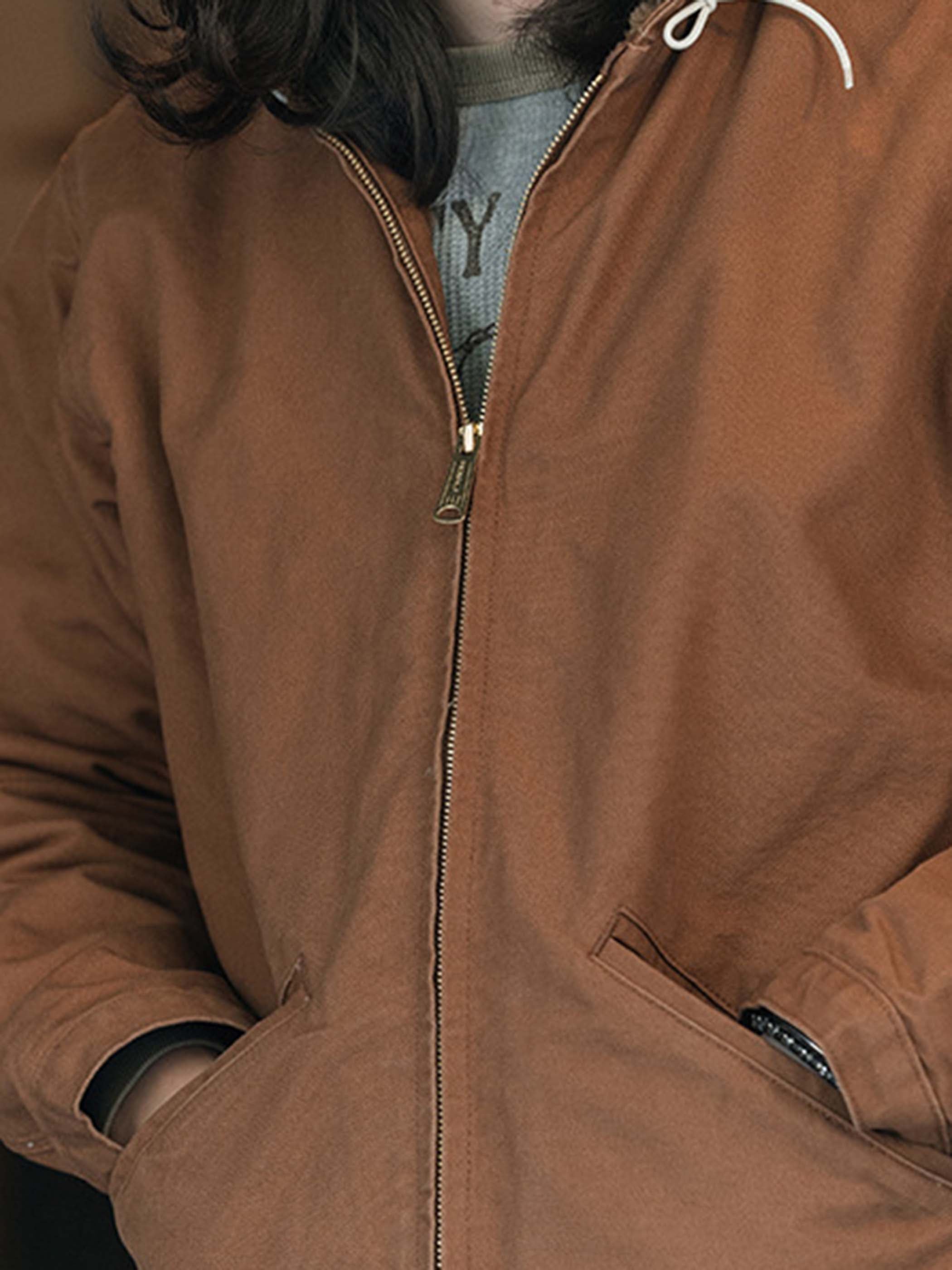 このフーデッドジャケットは、丈夫で風を通しにくい高密度コットンキャンバス生地を採用し、外側はしっかりとした作りで耐久性を実現しています。裏地には、柔らかなシープボア(ポリエステル)を使用しており、肌触りが良く保温性にも優れているため、気温が0度近くまで下がる環境でも、スウェットや保温インナーとレイヤードすることで快適に過ごせます。フロントは使いやすいジッパー開閉仕様で、シンプルながらも洗練されたデザインとなっており、ワークシーンからタウンユースまで幅広く対応。適度なゆとりのあるシルエットが、アウトドアやカジュアルなファッションに取り入れやすく、日常のあらゆるシーンで活躍する一着です。