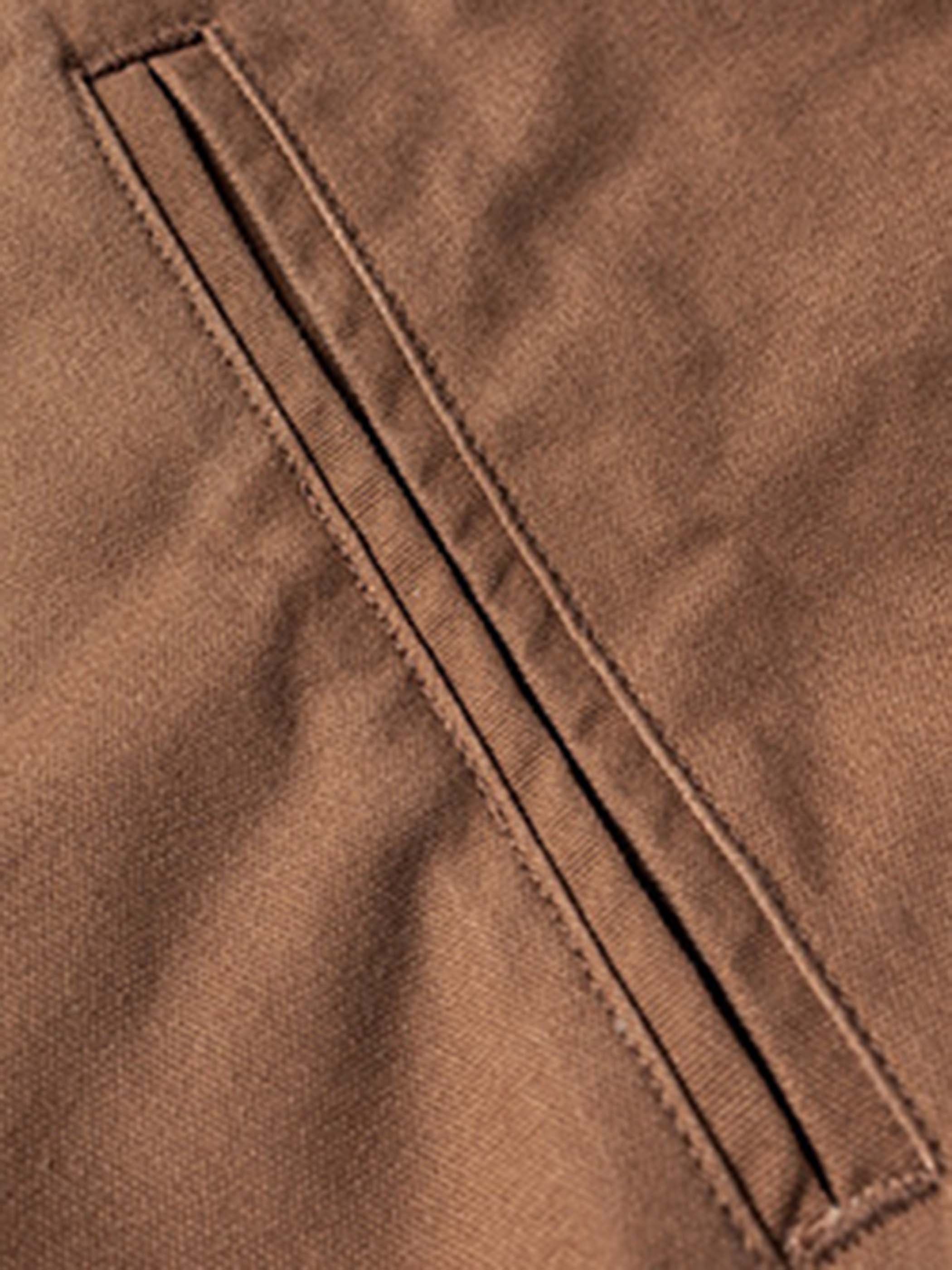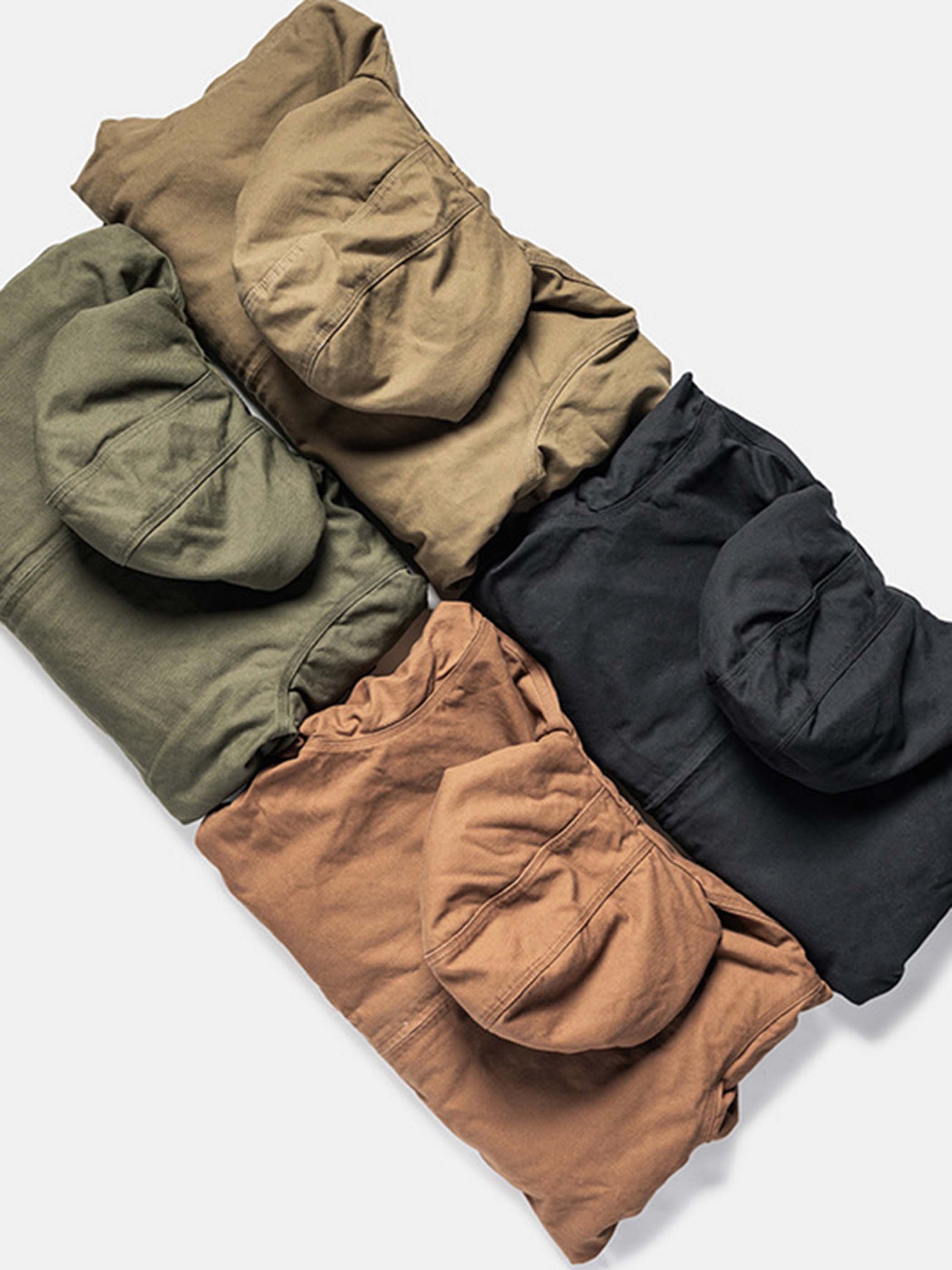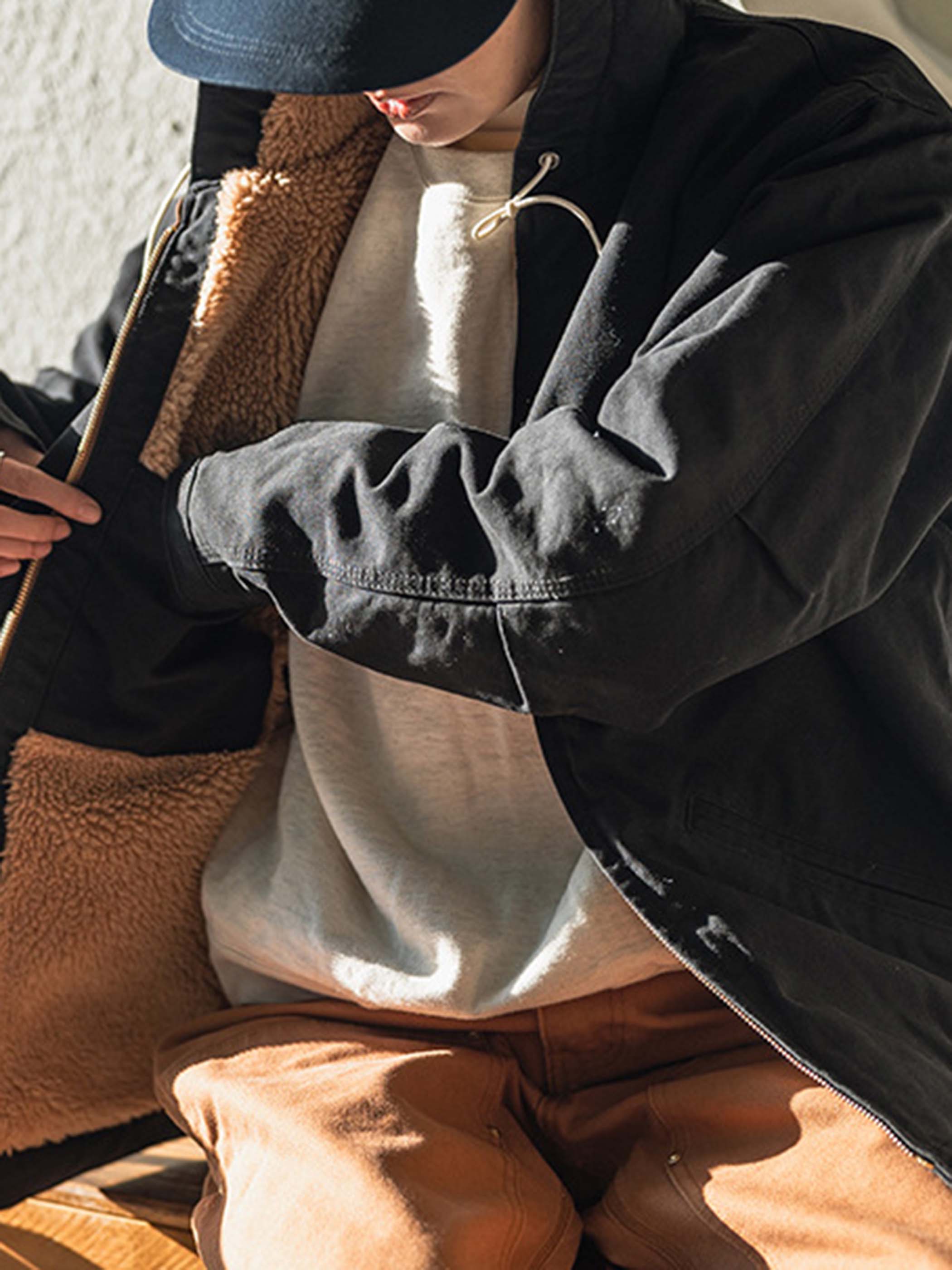 このフーデッドジャケットは、丈夫で風を通しにくい高密度コットンキャンバス生地を採用し、外側はしっかりとした作りで耐久性を実現しています。裏地には、柔らかなシープボア(ポリエステル)を使用しており、肌触りが良く保温性にも優れているため、気温が0度近くまで下がる環境でも、スウェットや保温インナーとレイヤードすることで快適に過ごせます。フロントは使いやすいジッパー開閉仕様で、シンプルながらも洗練されたデザインとなっており、ワークシーンからタウンユースまで幅広く対応。適度なゆとりのあるシルエットが、アウトドアやカジュアルなファッションに取り入れやすく、日常のあらゆるシーンで活躍する一着です。