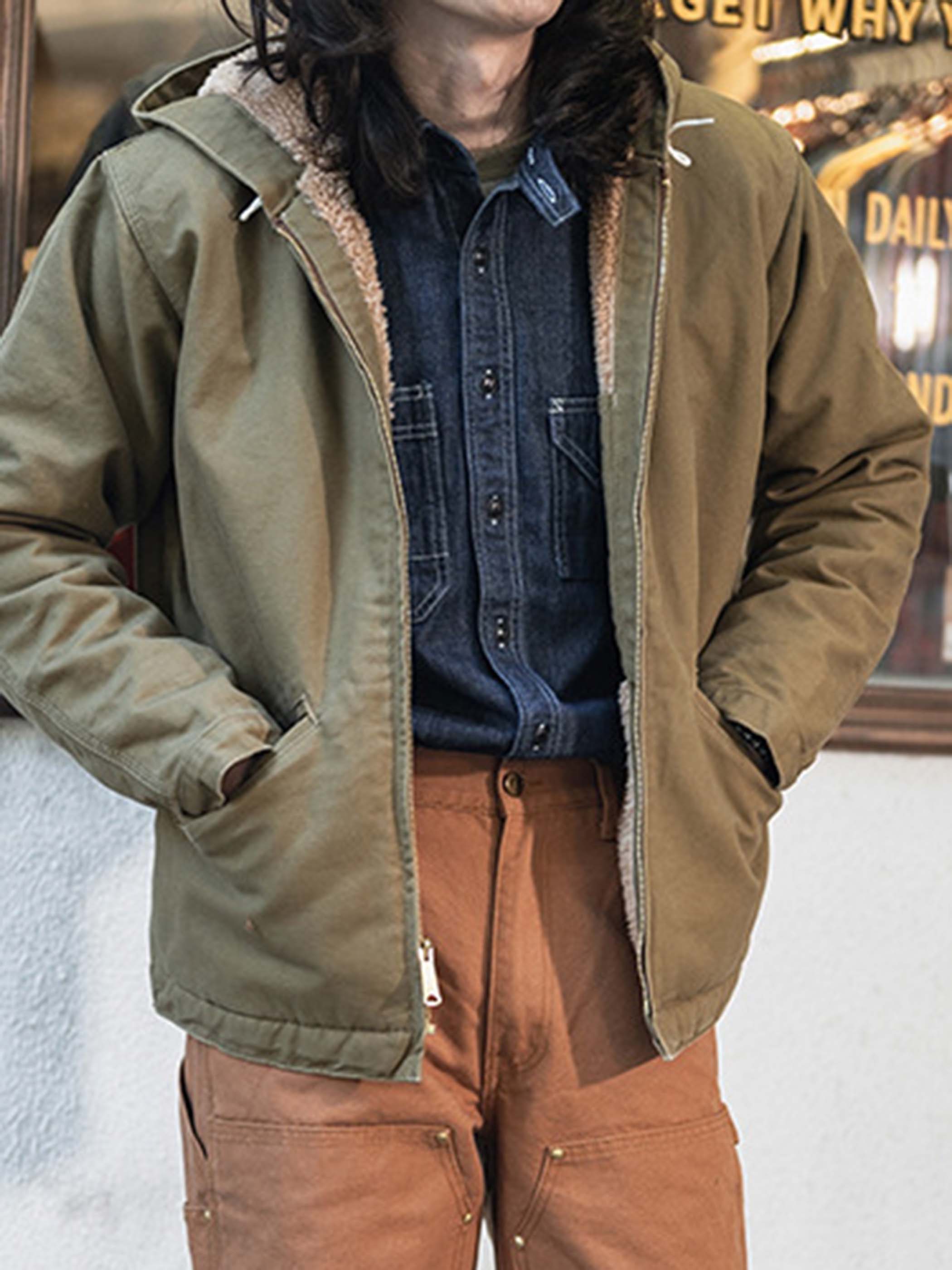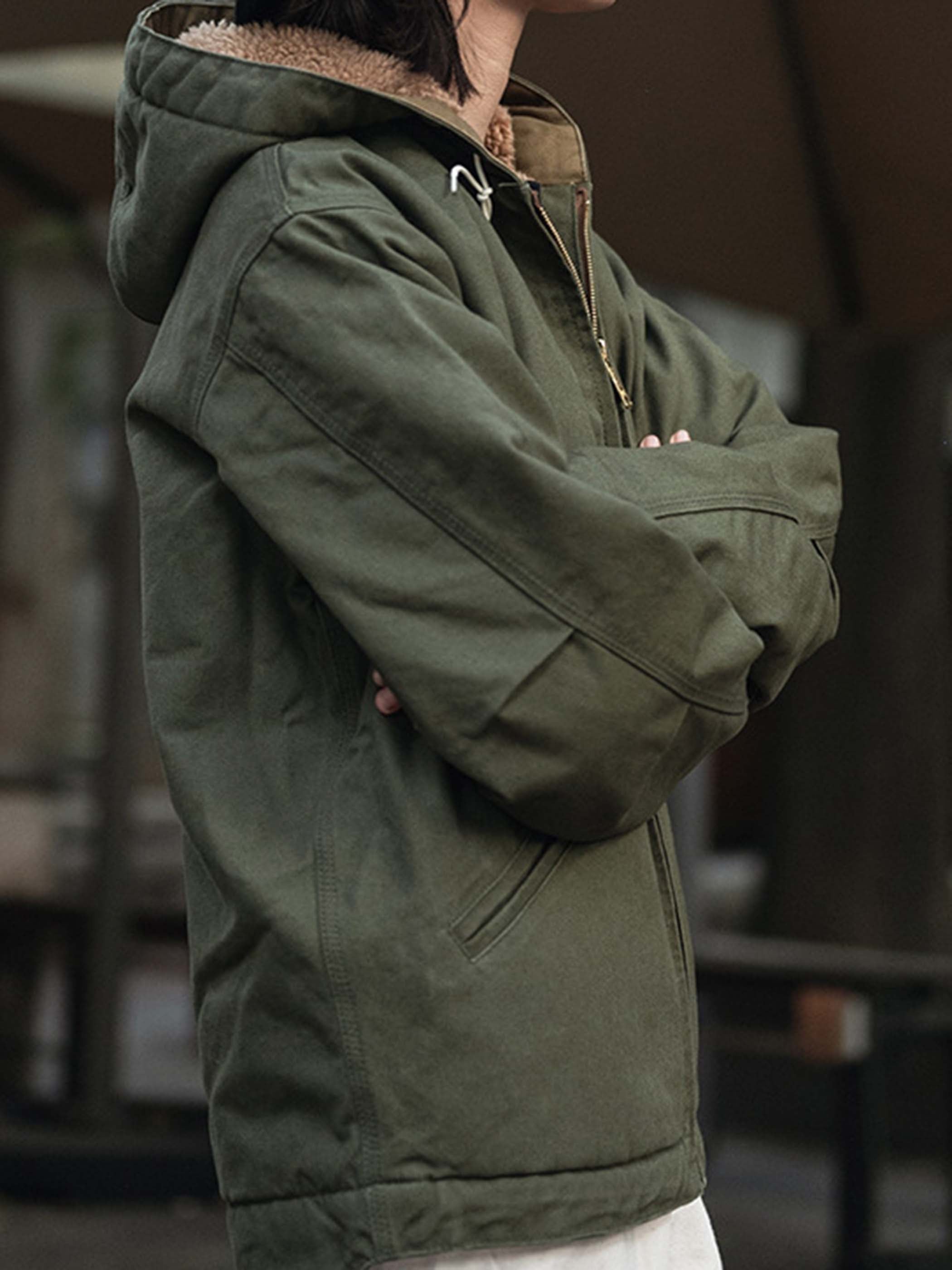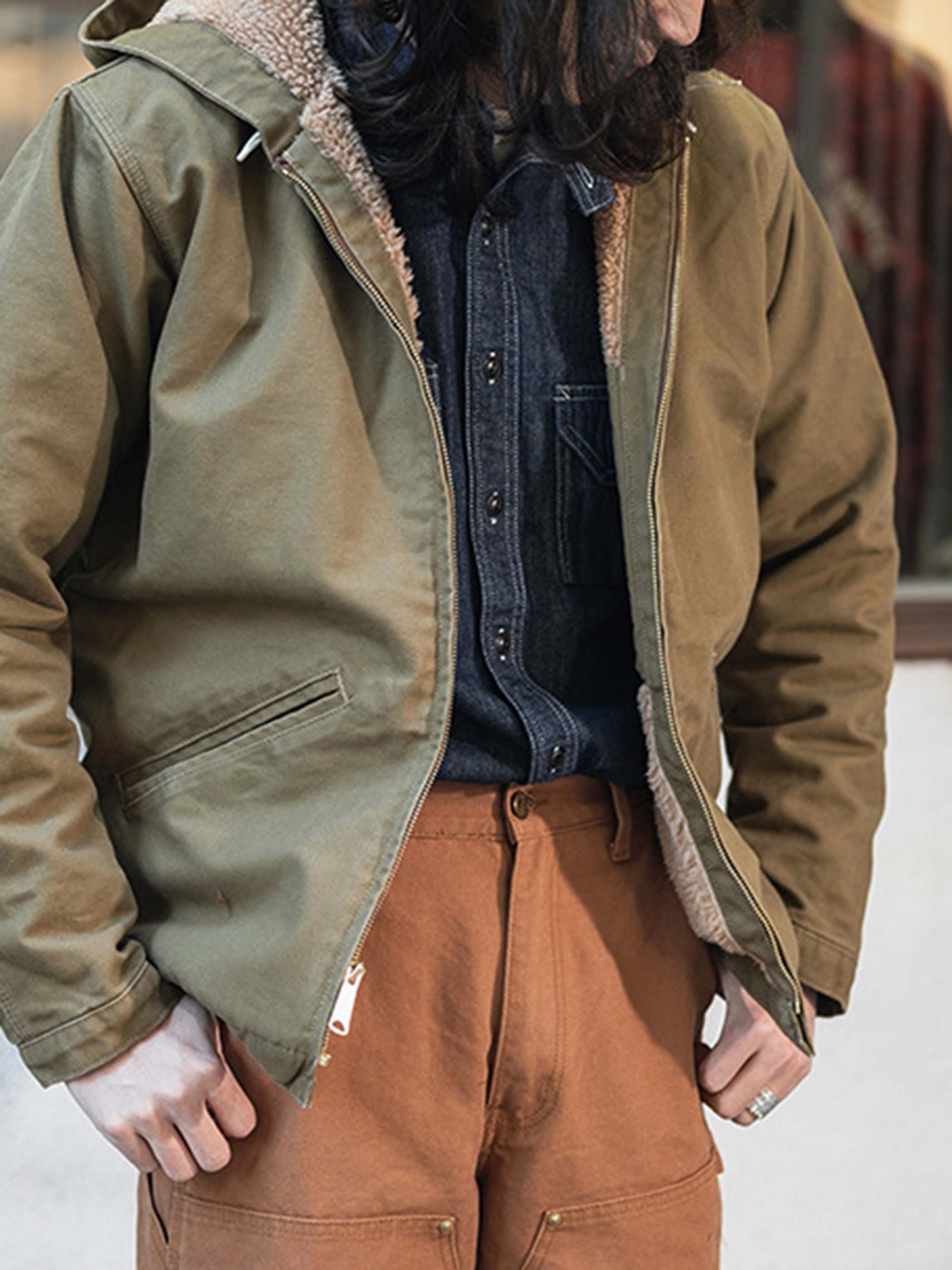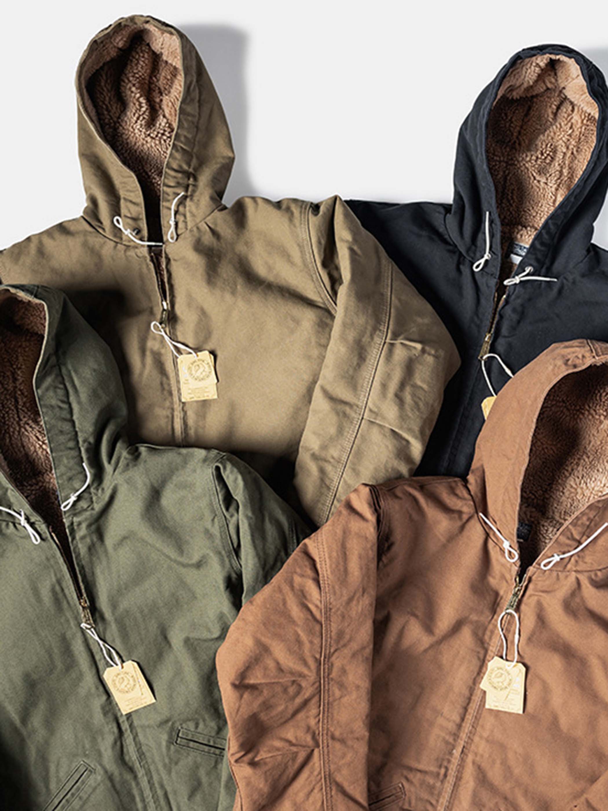 高密度コットンキャンバスと柔らかなシープボア裏地を組み合わせた、耐久性・防風・保温性に優れたアウトドア向けフーデッドジャケットです。