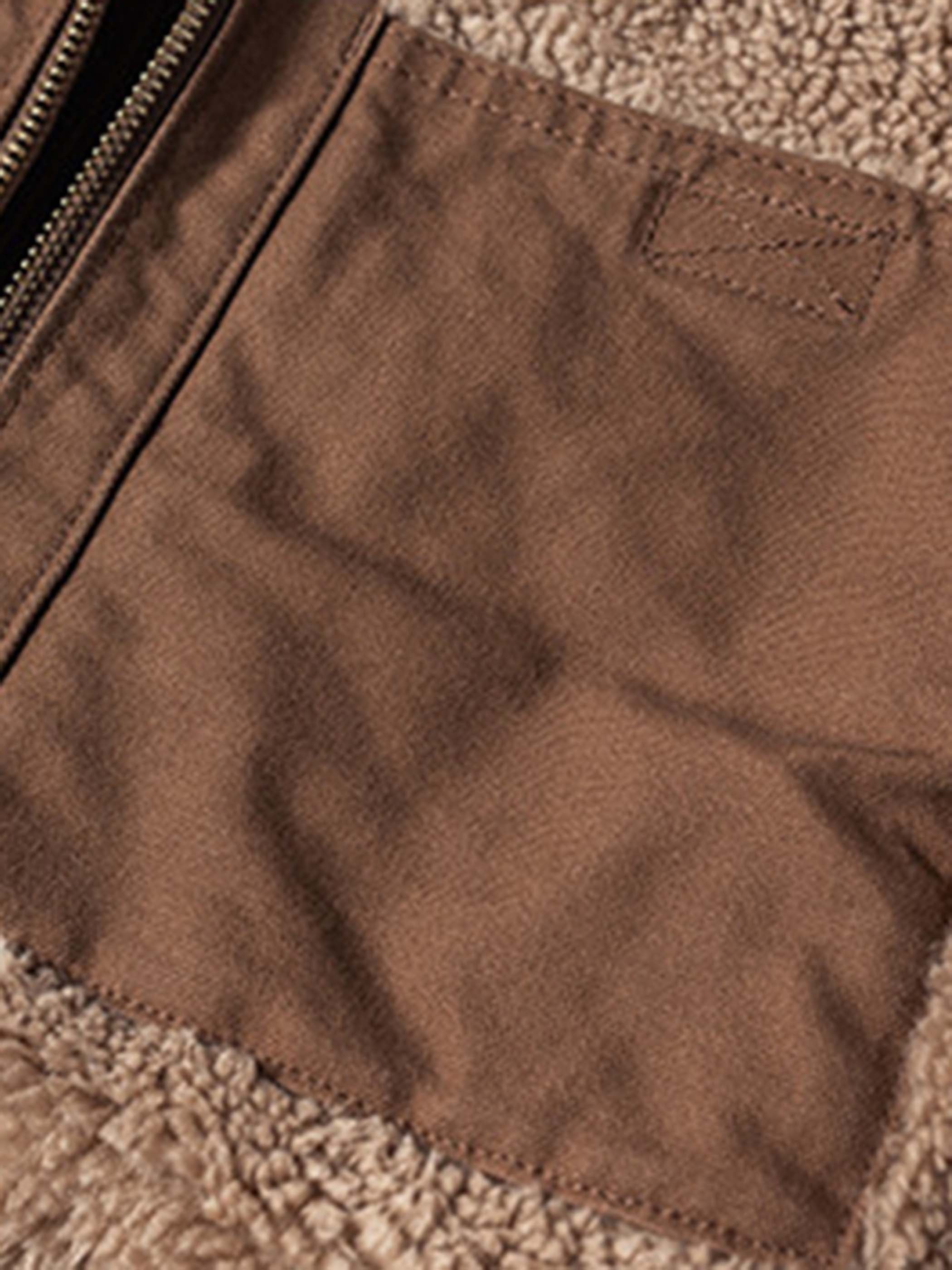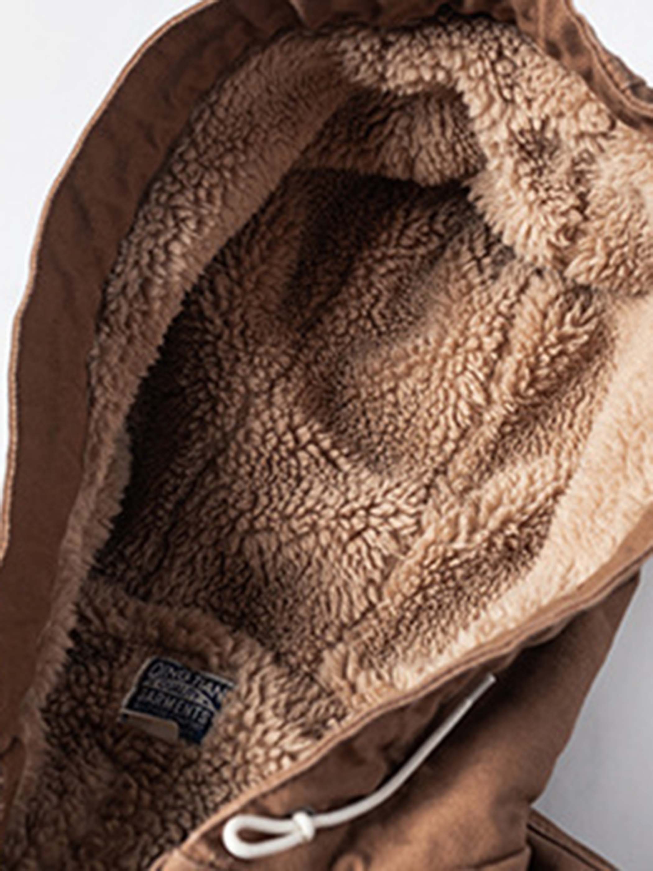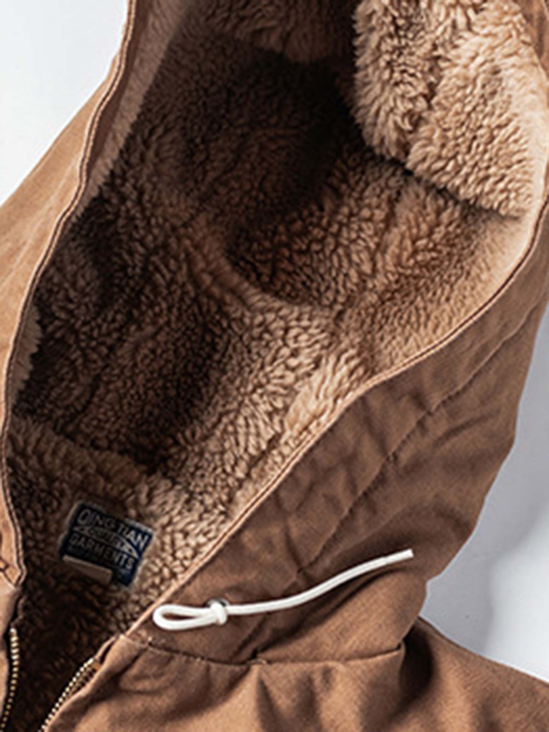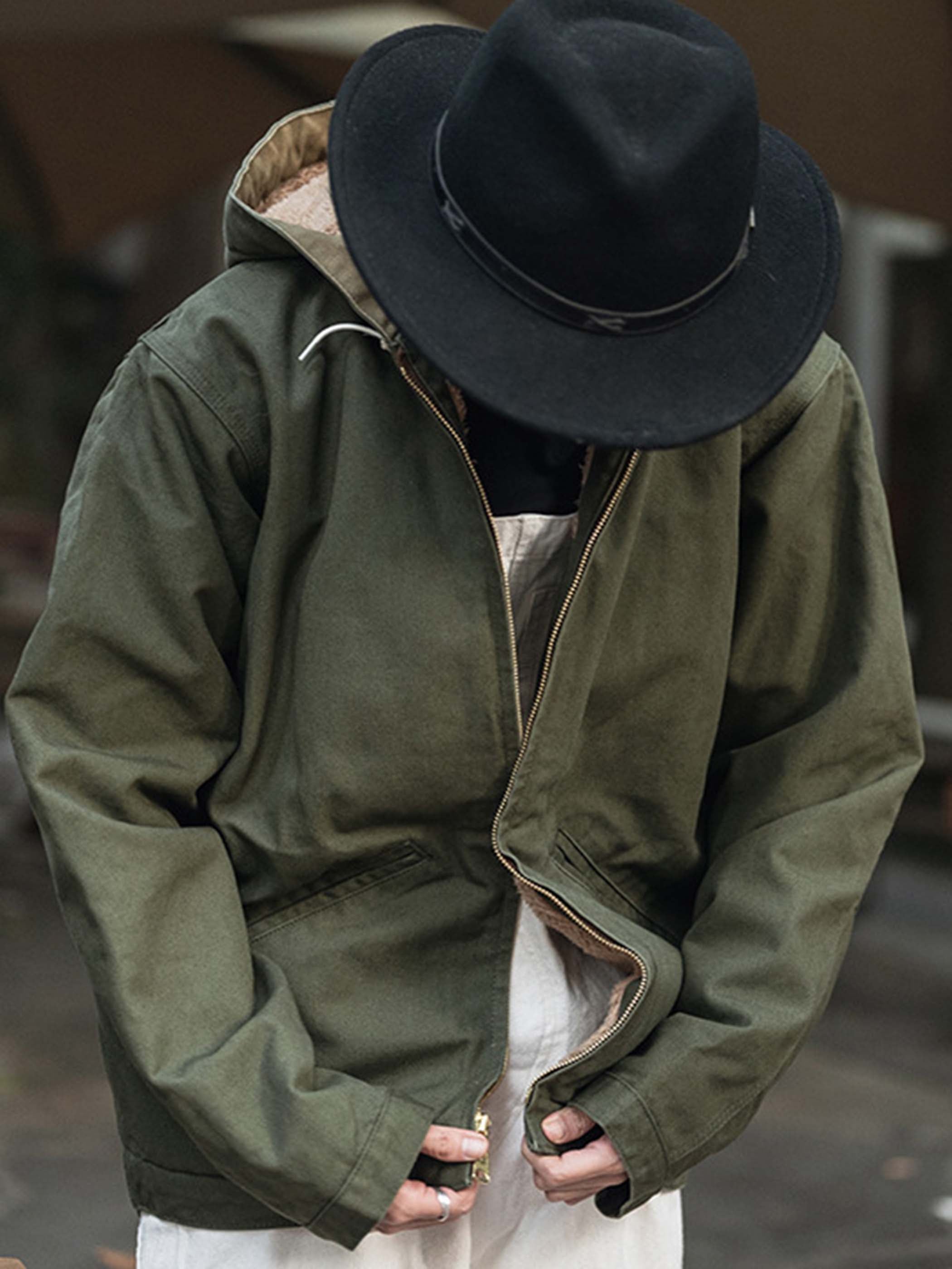 高密度コットンキャンバスと柔らかなシープボア裏地を組み合わせた、耐久性・防風・保温性に優れたアウトドア向けフーデッドジャケットです。