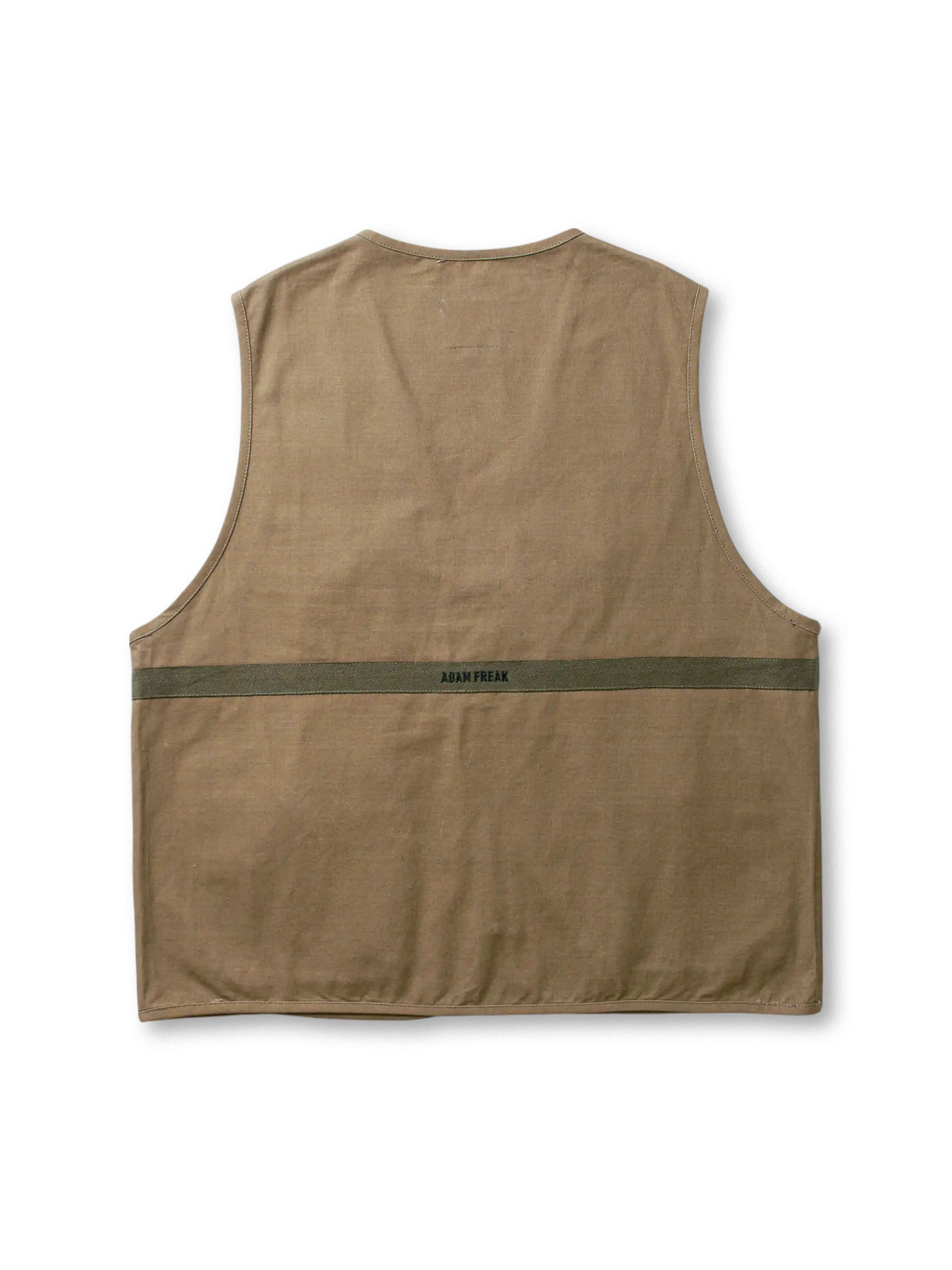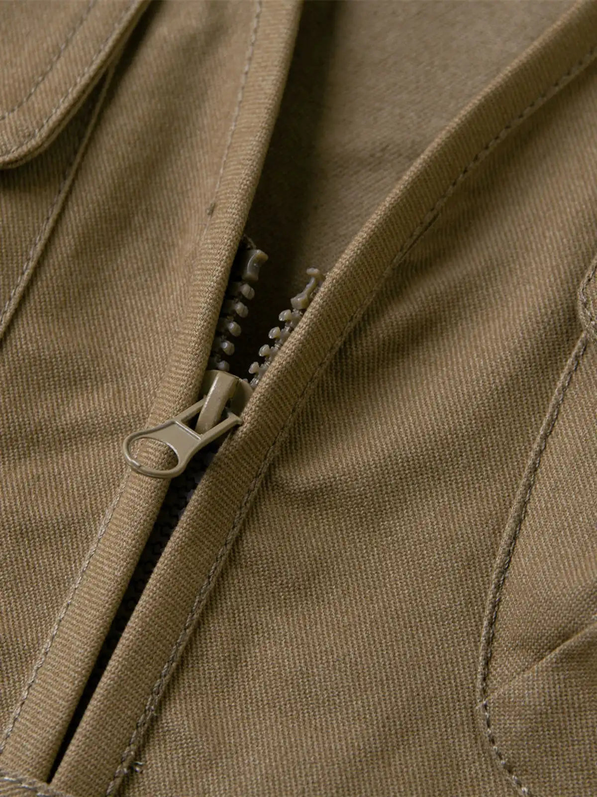 厚手のコットン素材を使用したミリタリー由来のワークベストで、フロントに大小6つの立体ポケットを配し、機能性とビジュアルを両立。YKK製ジップ&スナップボタンの開閉で着脱がスムーズに行え、タフな縫製と自然なマット感の生地がヴィンテージライクな風合いを演出します。アクティブなシーンからタウンユースまで、レイヤードスタイルに最適です。