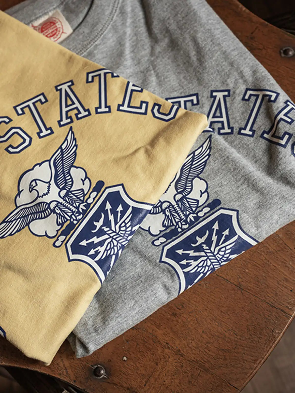 オリジナルは1980年代に米空軍基地で支給されたトレーニングTシャツで、胸に配された象徴的な鷲のエンブレムがミリタリーテイストを強調。米国から輸入した熱転写インクを使用し、伝統的なシルクスクリーン印刷でプリントしたロゴは、洗い込むほどに程良いクラシックなアタリが生まれ、一枚で存在感を放つ。良質なコットン100%素材は適度な厚みを持ちつつも通気性が高く、無地ショーツやデニムパンツと合わせるだけで、ゆるやかなミリタリーカジュアルスタイルを完成させる。