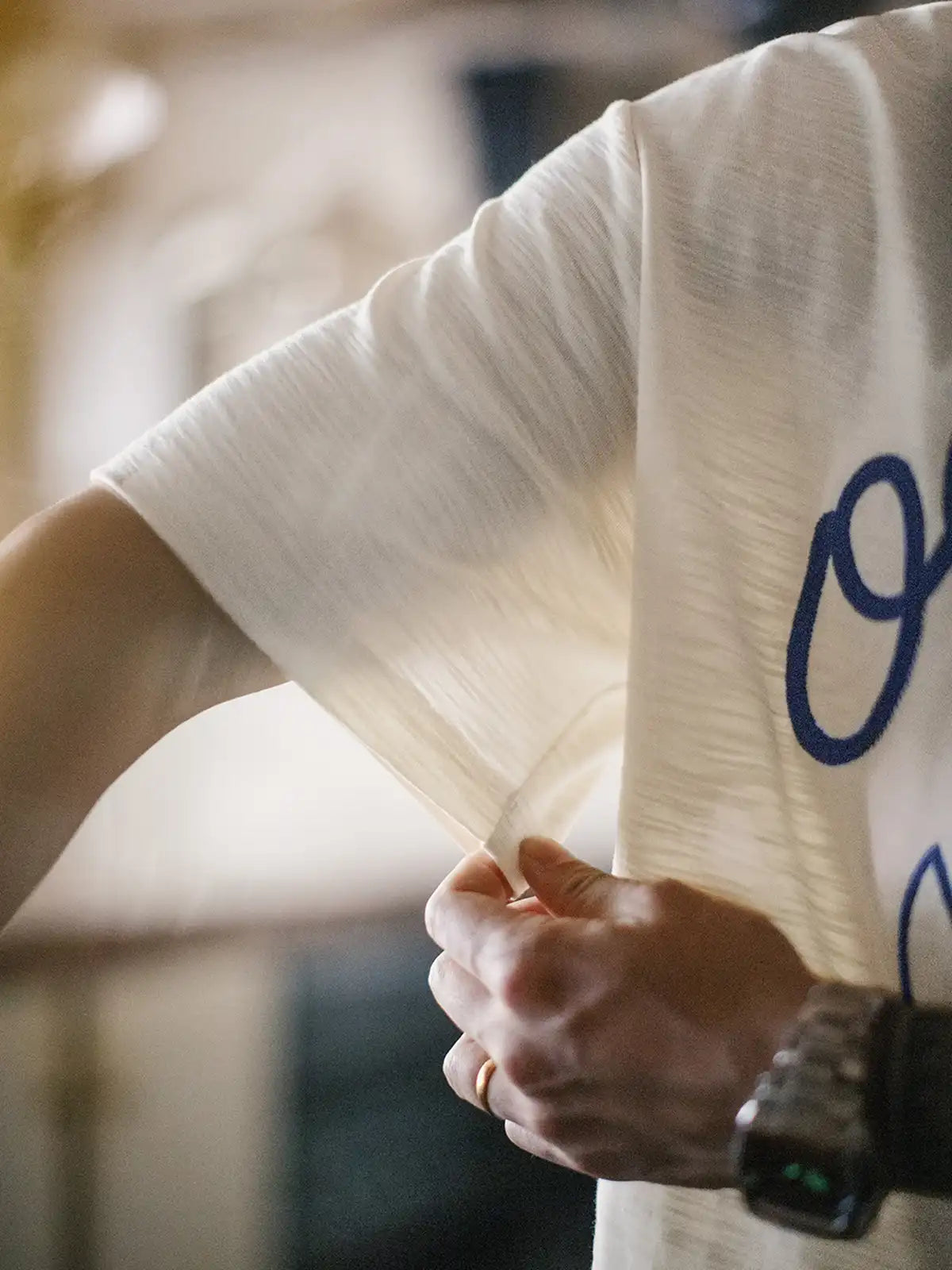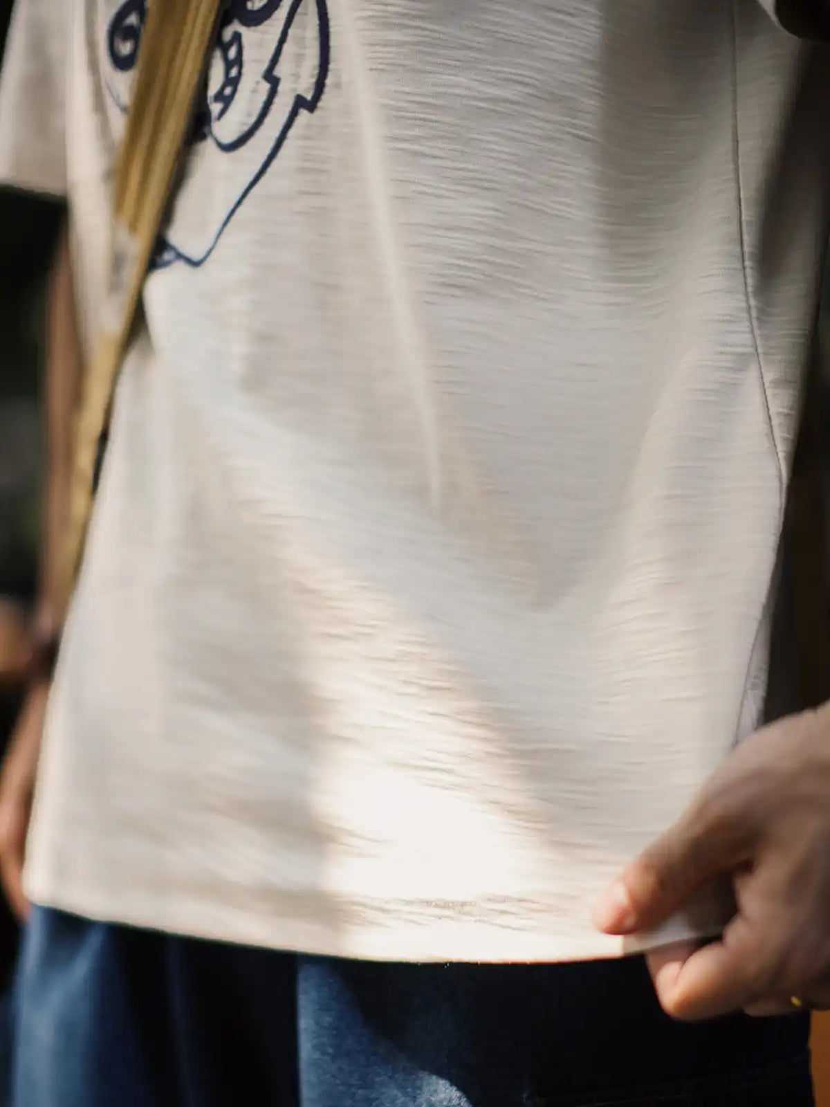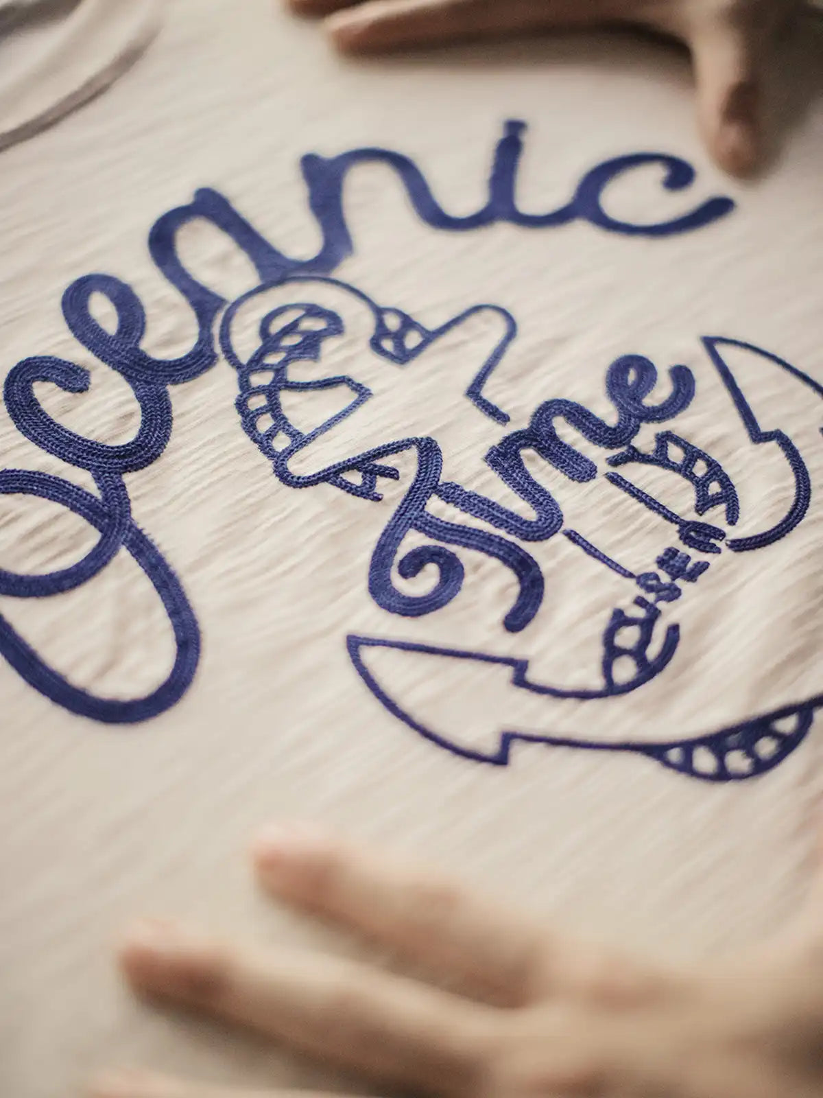 航海シリーズのシンボルである船錨アイコンを鎖状のチェーンステッチで大胆に配したデザインが、自由と冒険心を夏の装いに強く訴求し、竹節糸特有の凹凸感と米ベージュ×ディープネイビーのコントラストがヴィンテージの風合いを醸し出す一方、240g/m²の重厚生地は透湿性に優れシワになりにくく、シンプルなショーツやデニムと合わせるだけで夏のマリンスタイルを完成させる。