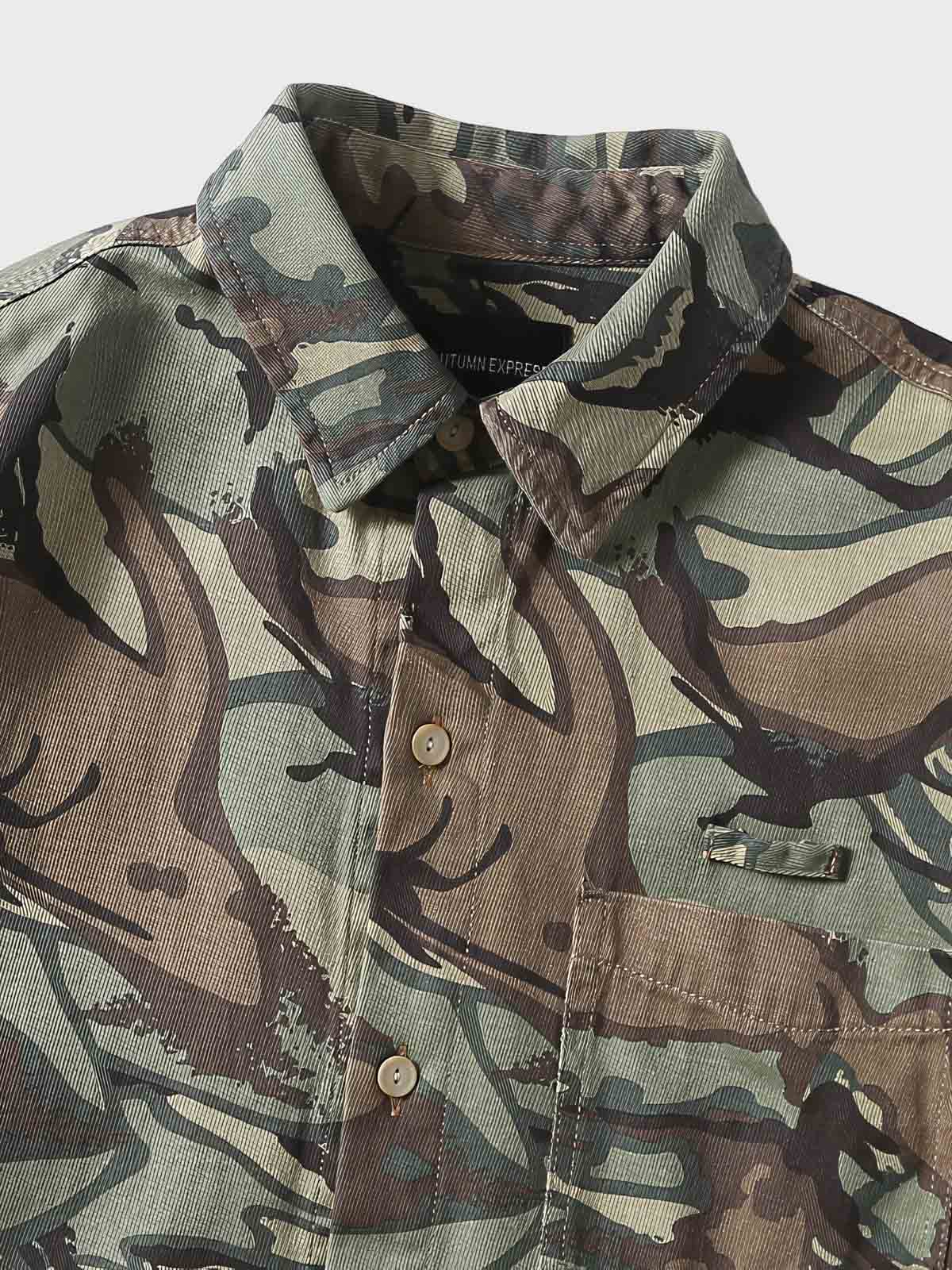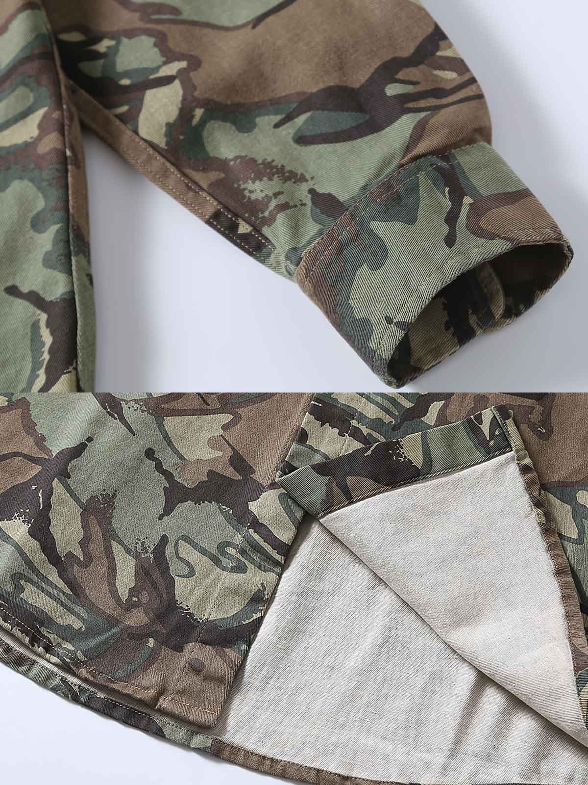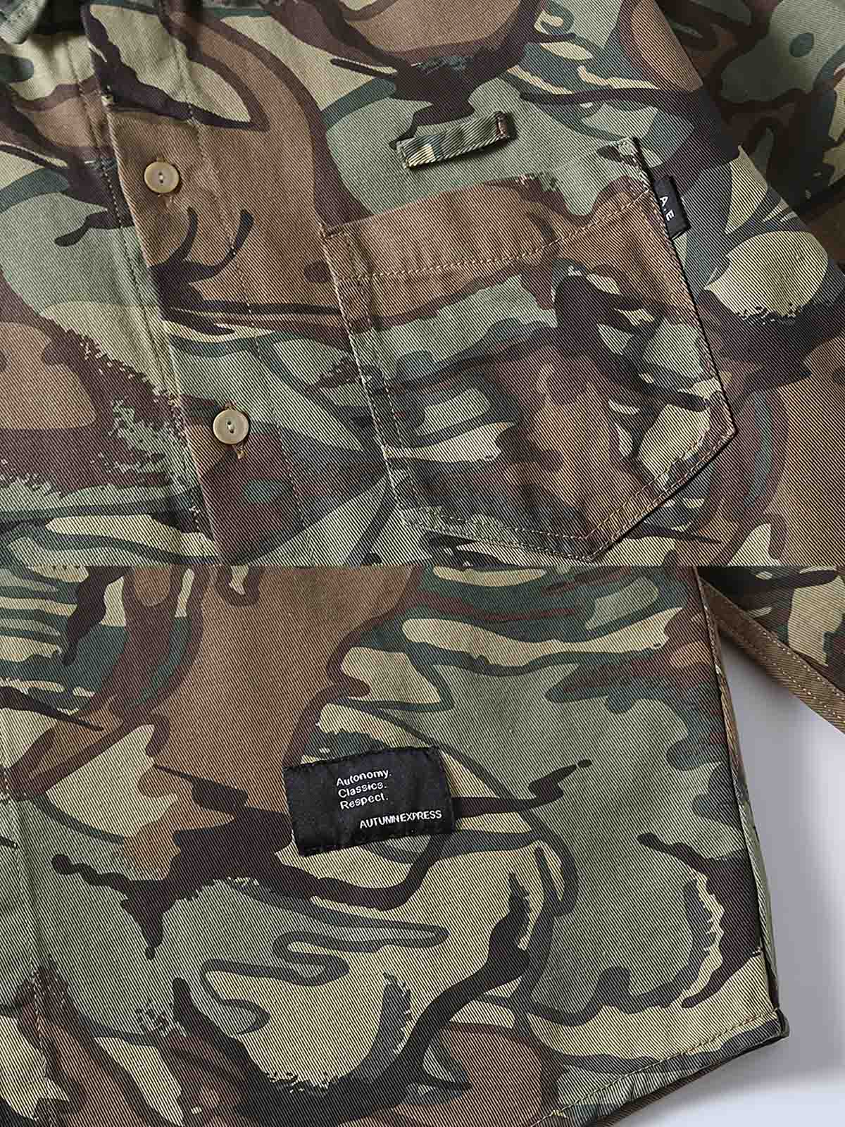素材は柔らかなコットンを使用し、肌に優しく日常着に適しています。カモフラージュパターンのプリントは精密で、鮮やかな色合いでありながらレトロ感を損なっていません。ディテールにおいて、シャツの各ボタンや縫い目は厳選され、衣服の耐久性と実用性を確保しています。