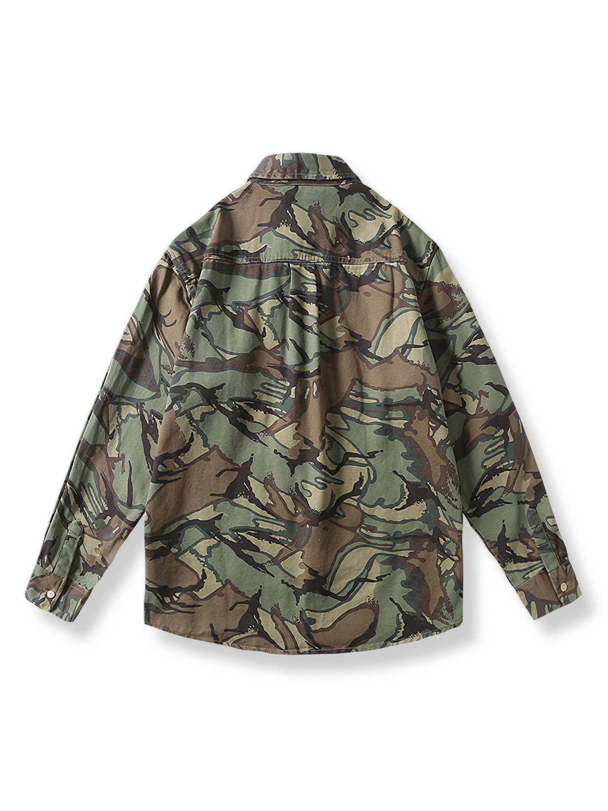このシャツは、レトロな迷彩柄パターンを中心としたデザインです。迷彩柄は、20世紀中期の軍服スタイルを反映し、歴史的な軍事文化への敬意と自由奔放なライフスタイルへの追求を表現しています。
