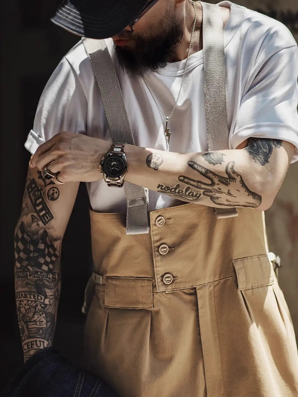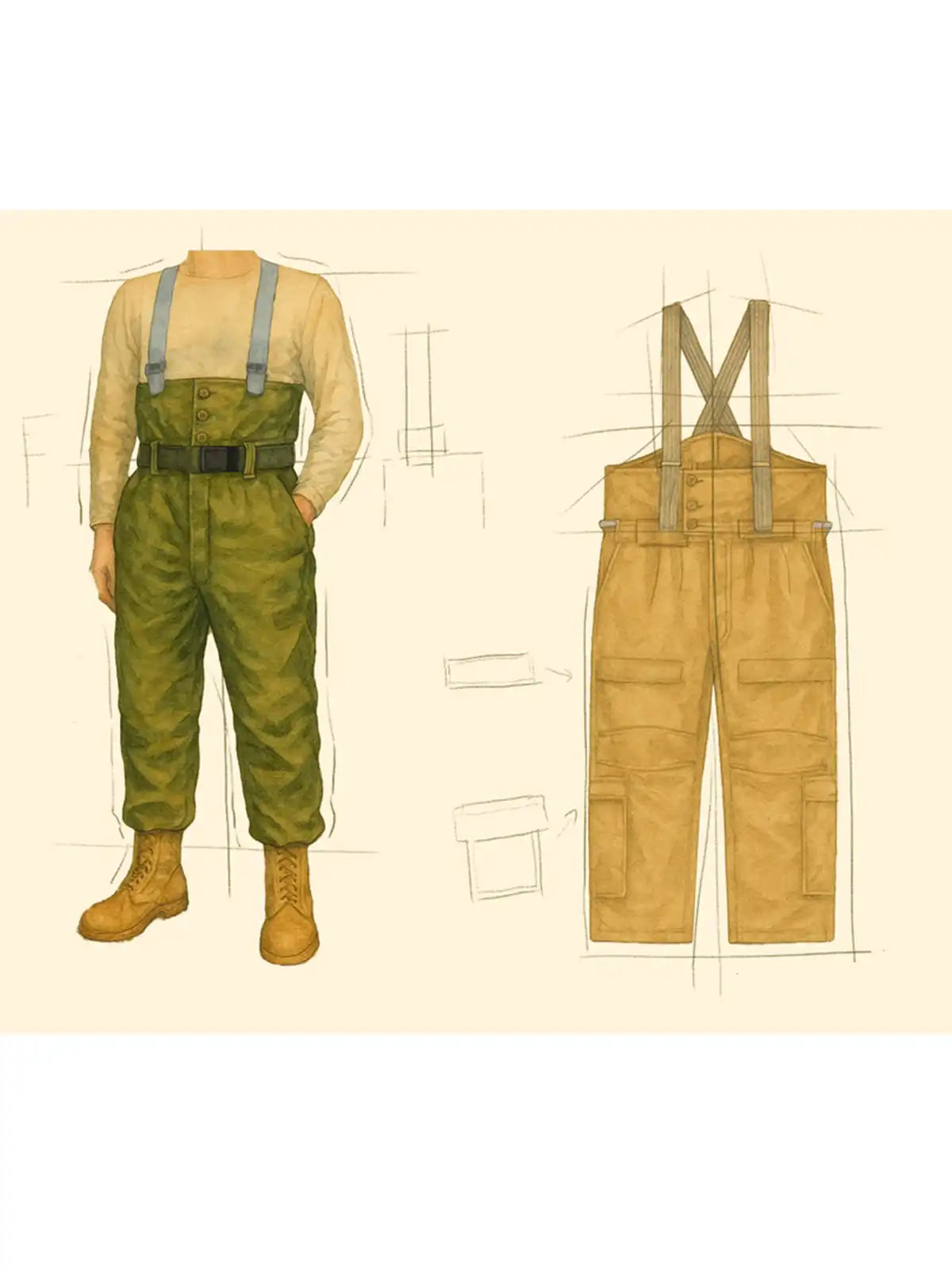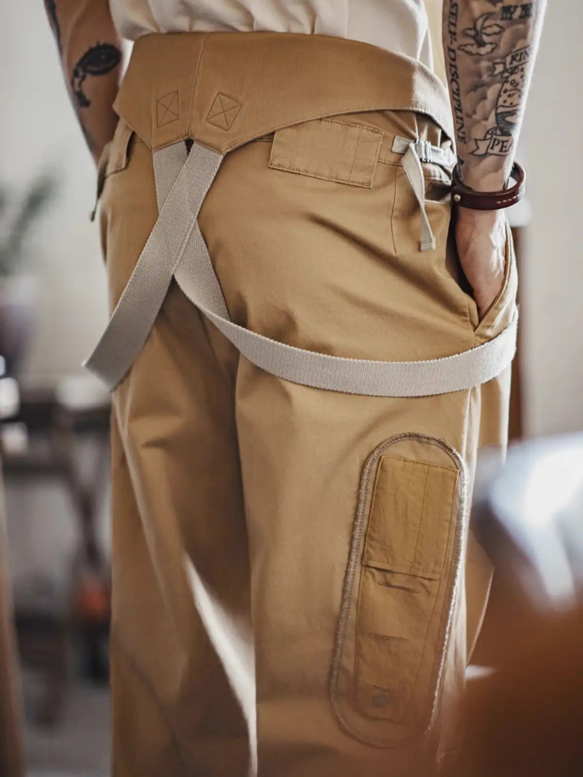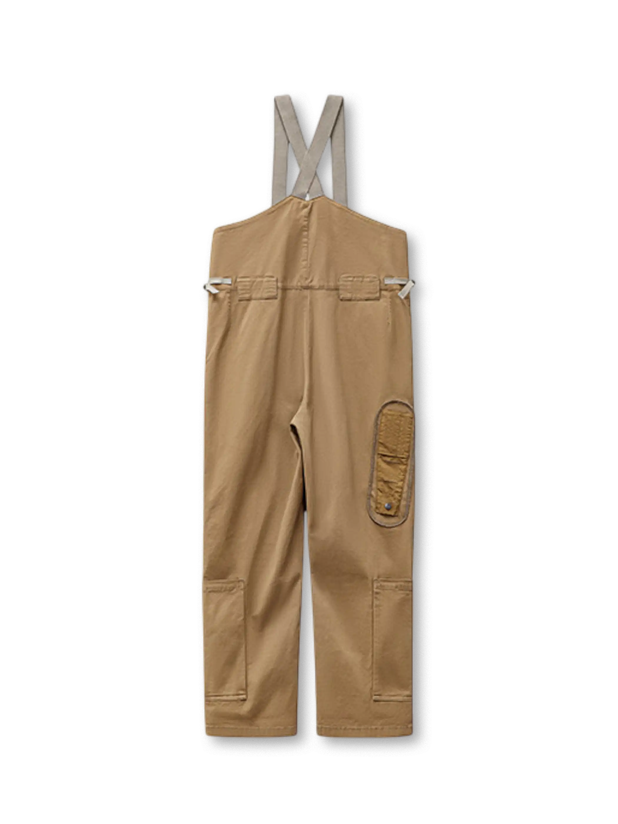 90年代フライトパンツをベースに改良した、多ポケット仕様のヴィンテージワイドサスペンダーパンツ。