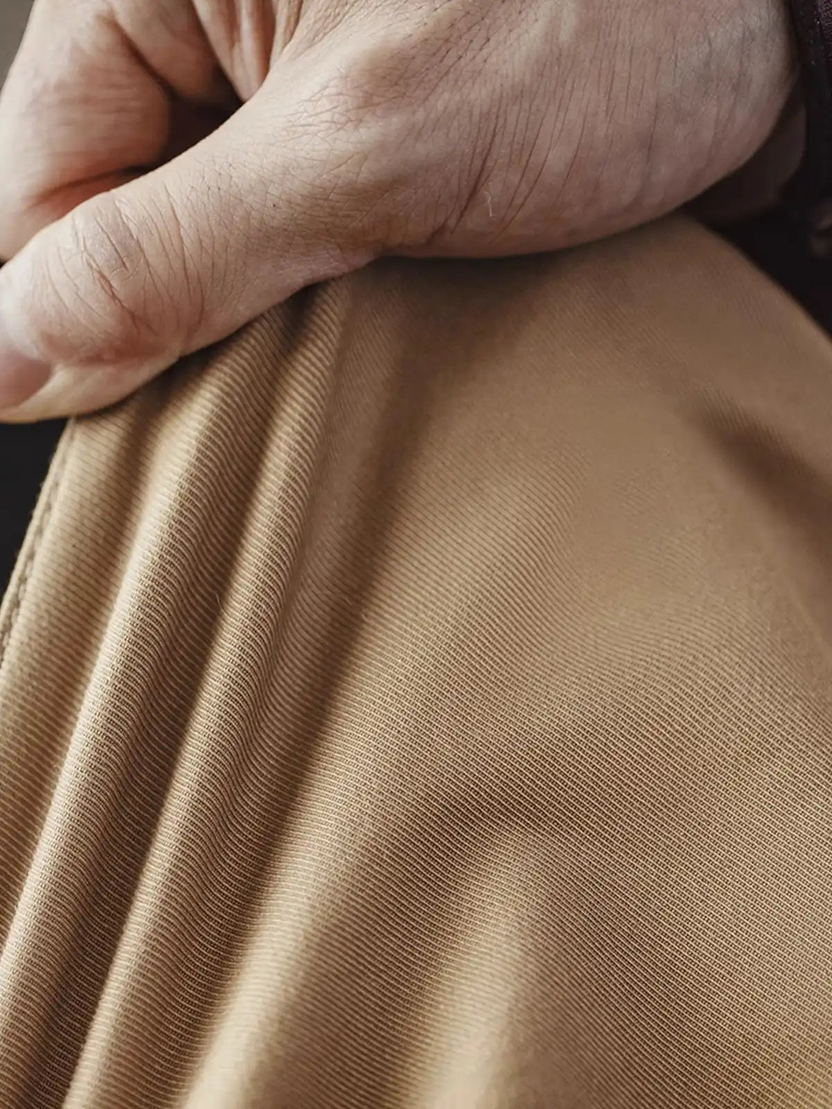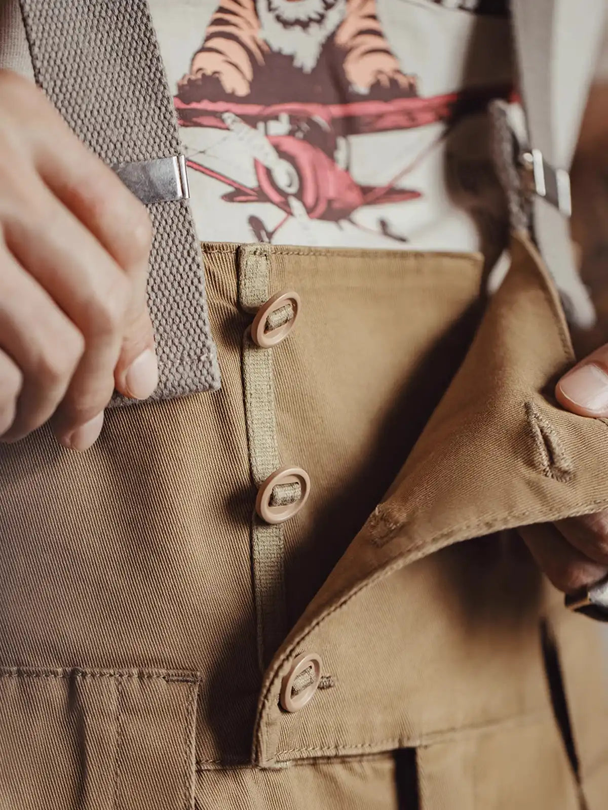 本作は90Cフライトパンツをモチーフに、アメカジの要素を加えて再構築したサスペンダーパンツ。高めのウエストガード、クロスしたサスペンダー、立体裁断など当時の機能性ディテールを継承しつつ、全体のシルエットを見直し、パンツ丈と幅を程よく調整。吊りベルトと腰ベルトの併用で、ショルダー掛けまたはフロントを垂らすアレンジが可能。生地にはカバーツイルを採用し、コットン高混率にスパンデックスをわずかに加えて適度なストレッチ性を付与。厚手のリブ織りストラップとマット仕上げのメタルバックルは、堅牢さと安定感を両立させている。ヴィンテージ感と実用性を兼ね備えた一本。