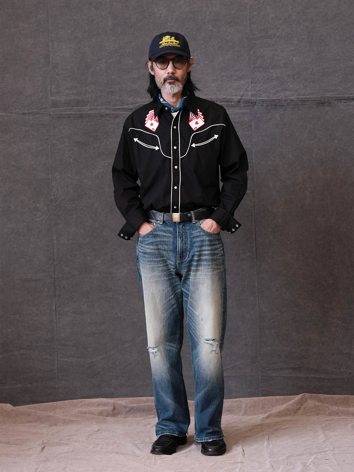 ヴィンテージのウエスタンスタイルと精巧な刺繍が融合し、タフさとアートが共存する独特な魅力を放つシャツ。