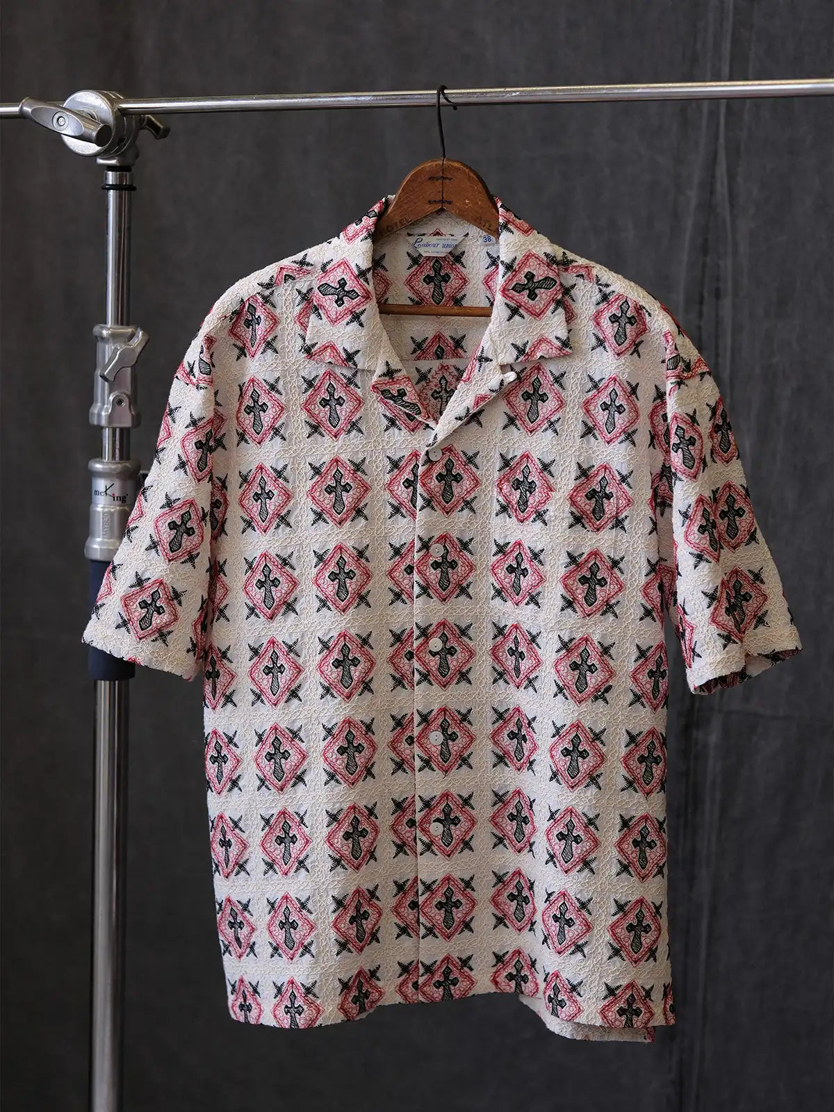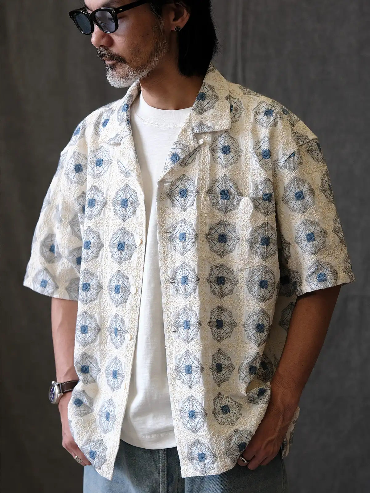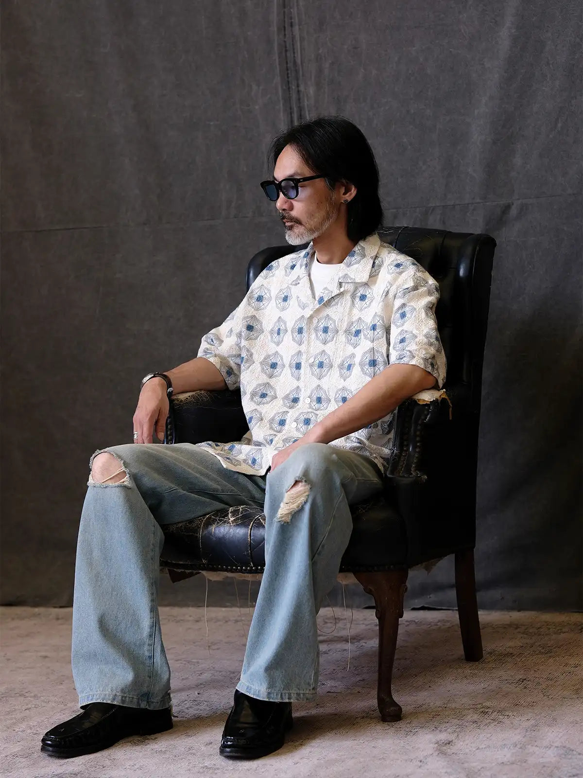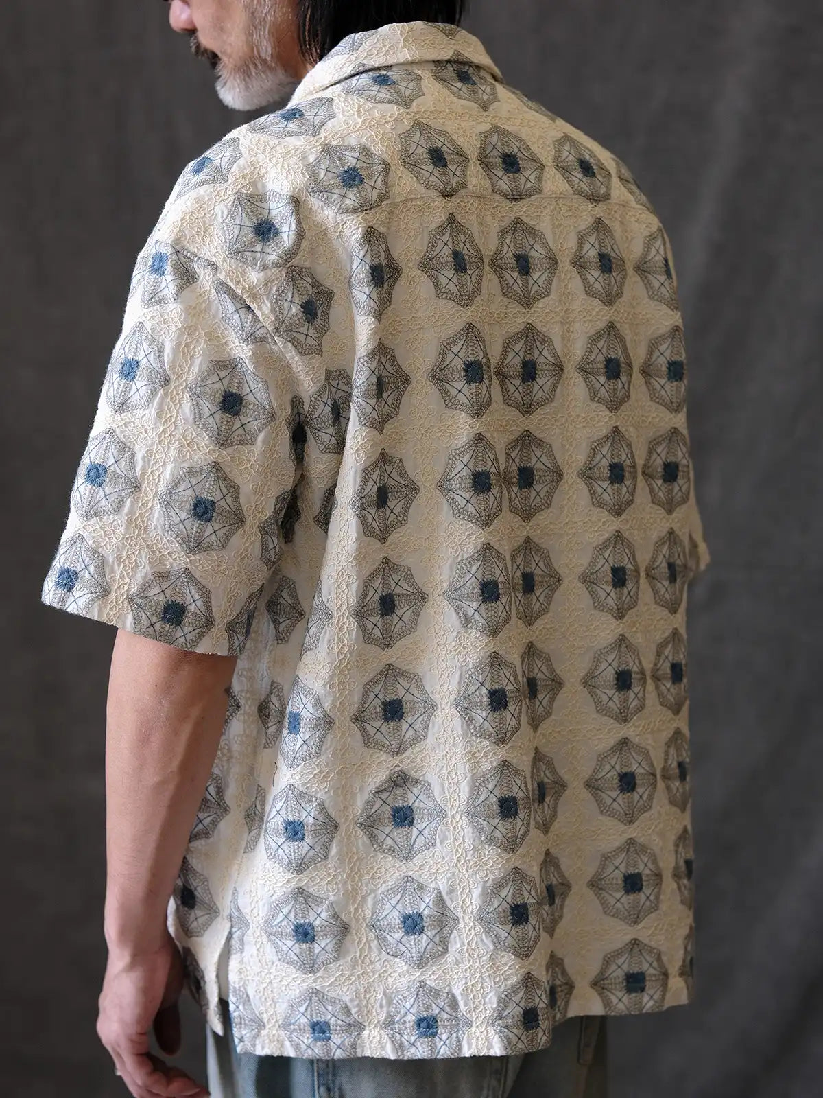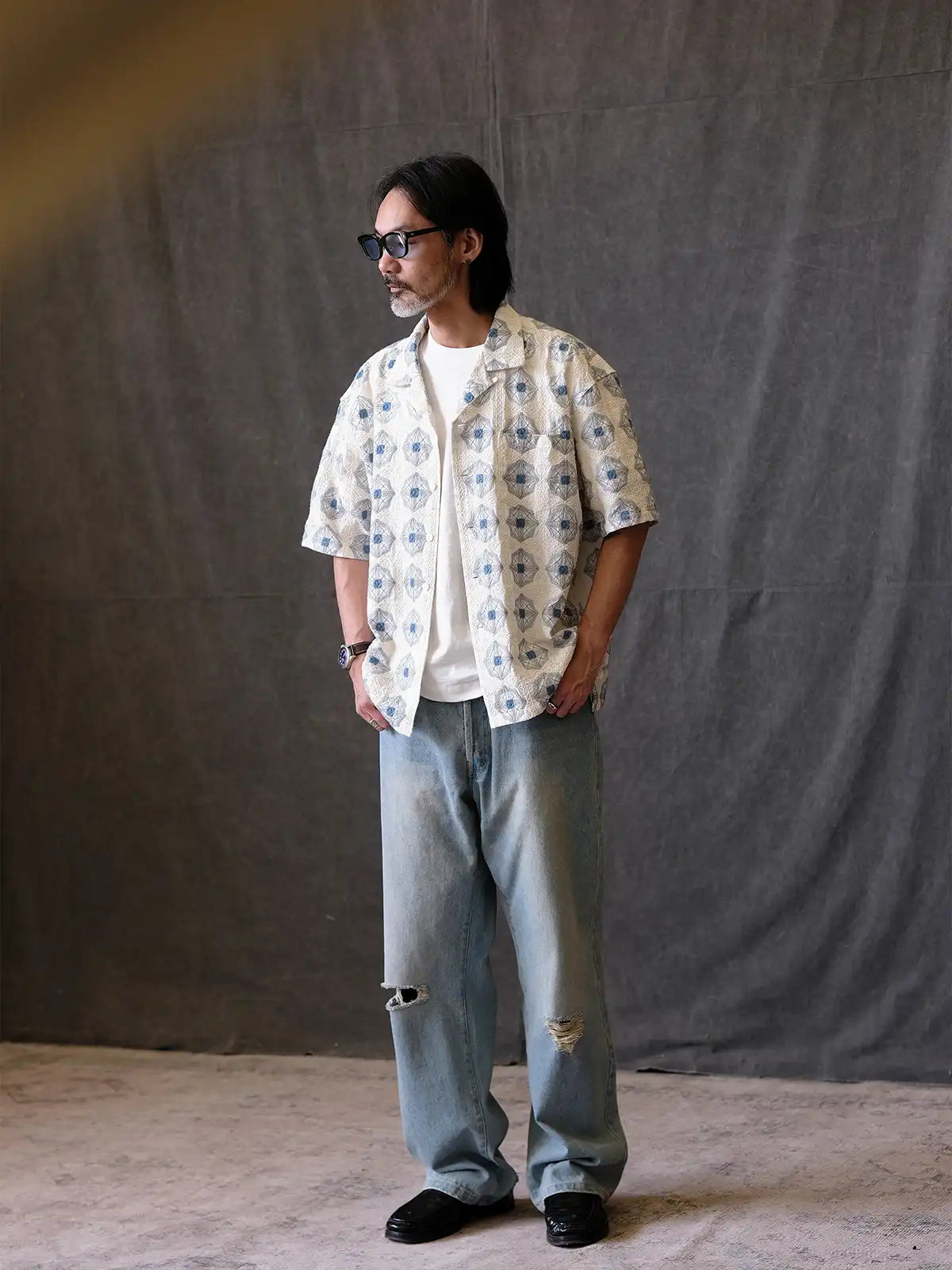 18世紀に発明されたジャカード織りを継承し、緻密な打ち抜きカードで経緯を操作することで柄を織り上げた生地は、印刷では得られない立体的な風合いと永続的な色あせ防止を実現。しっかりと打ち込まれたコットン100%の中厚ツイルは、着込むほどに味わいを増し、デニムやリネンショーツと合わせることでクラシックなワークウェアの趣を維持しつつ、洗練されたキューバ襟がリラックスシルエットを引き締めます。