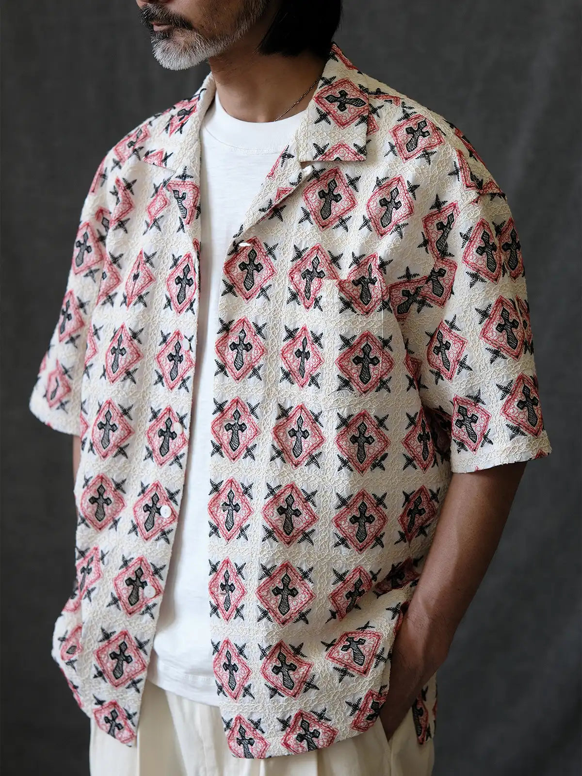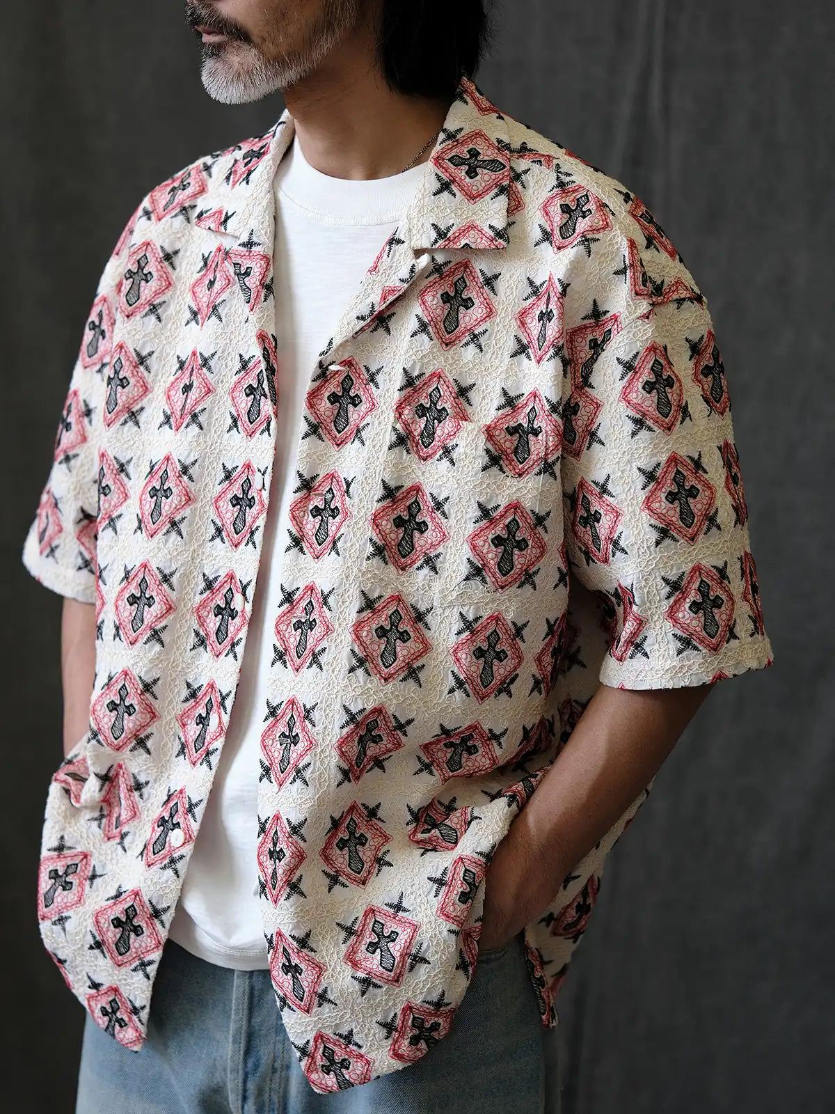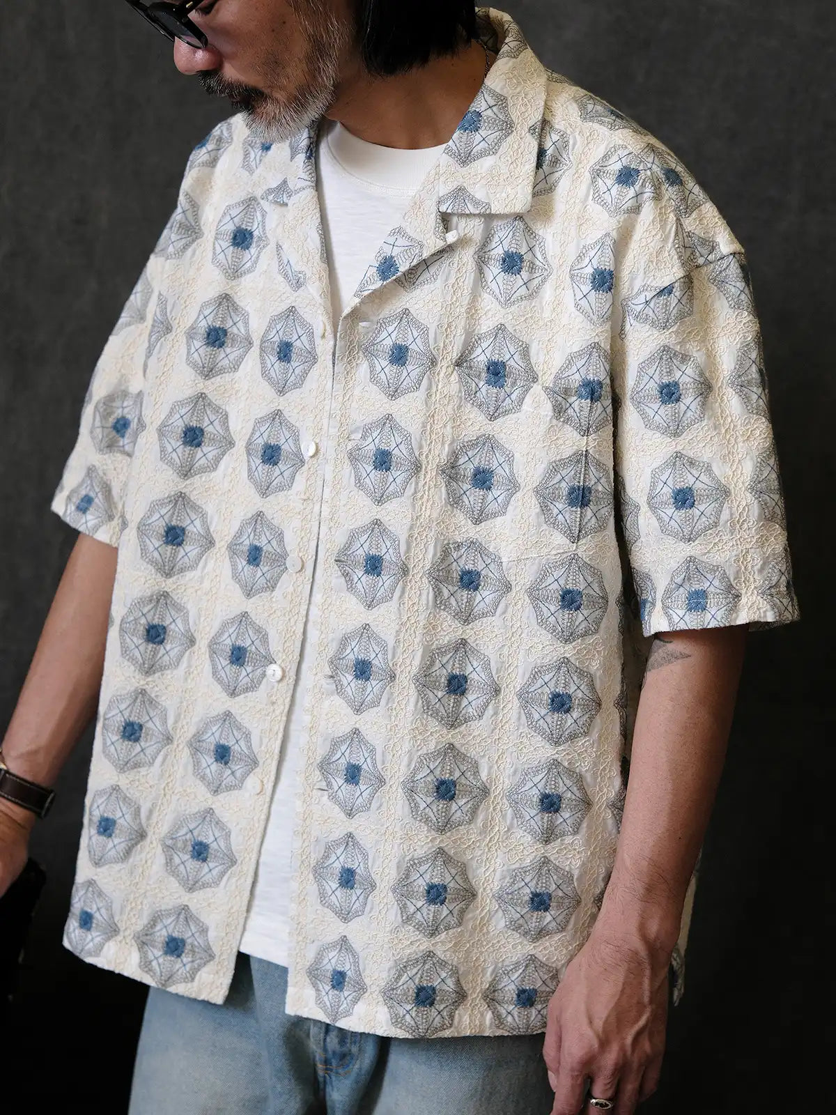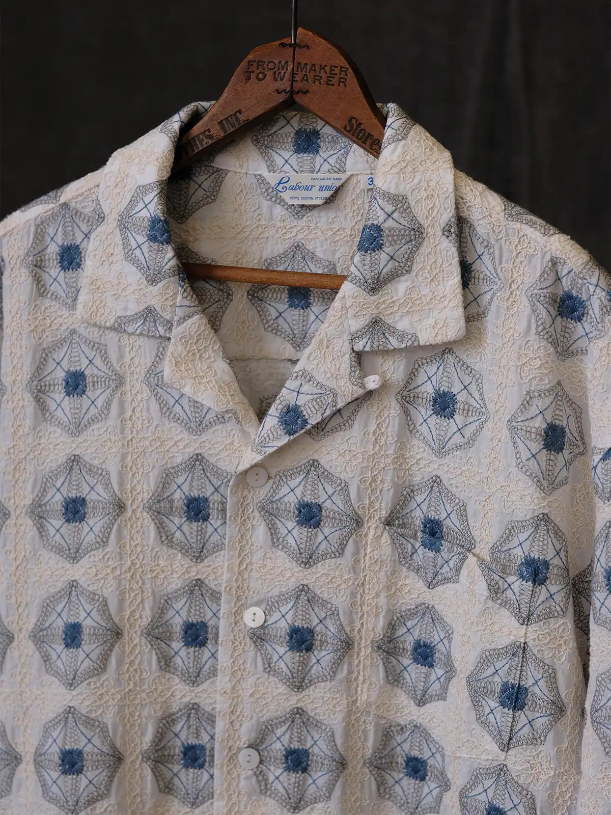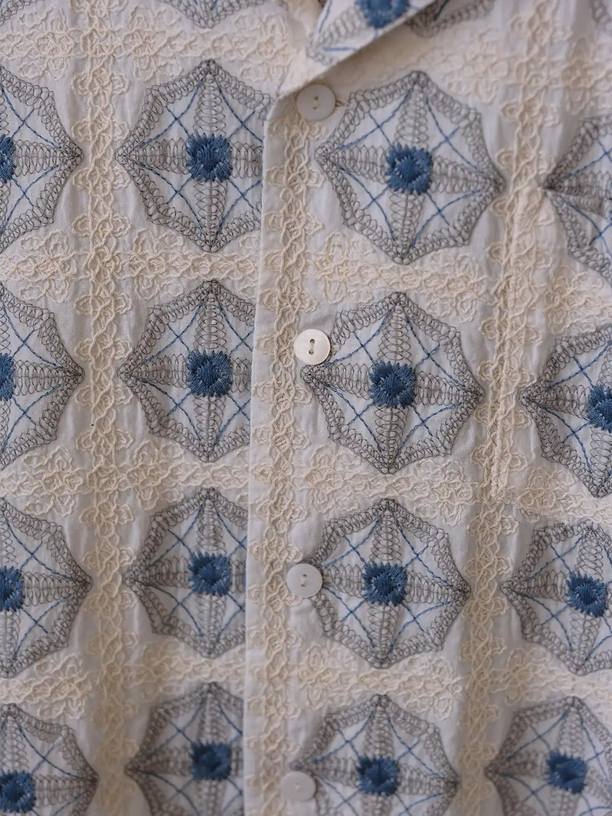 18世紀に発明されたジャカード織りを継承し、緻密な打ち抜きカードで経緯を操作することで柄を織り上げた生地は、印刷では得られない立体的な風合いと永続的な色あせ防止を実現。しっかりと打ち込まれたコットン100%の中厚ツイルは、着込むほどに味わいを増し、デニムやリネンショーツと合わせることでクラシックなワークウェアの趣を維持しつつ、洗練されたキューバ襟がリラックスシルエットを引き締めます。