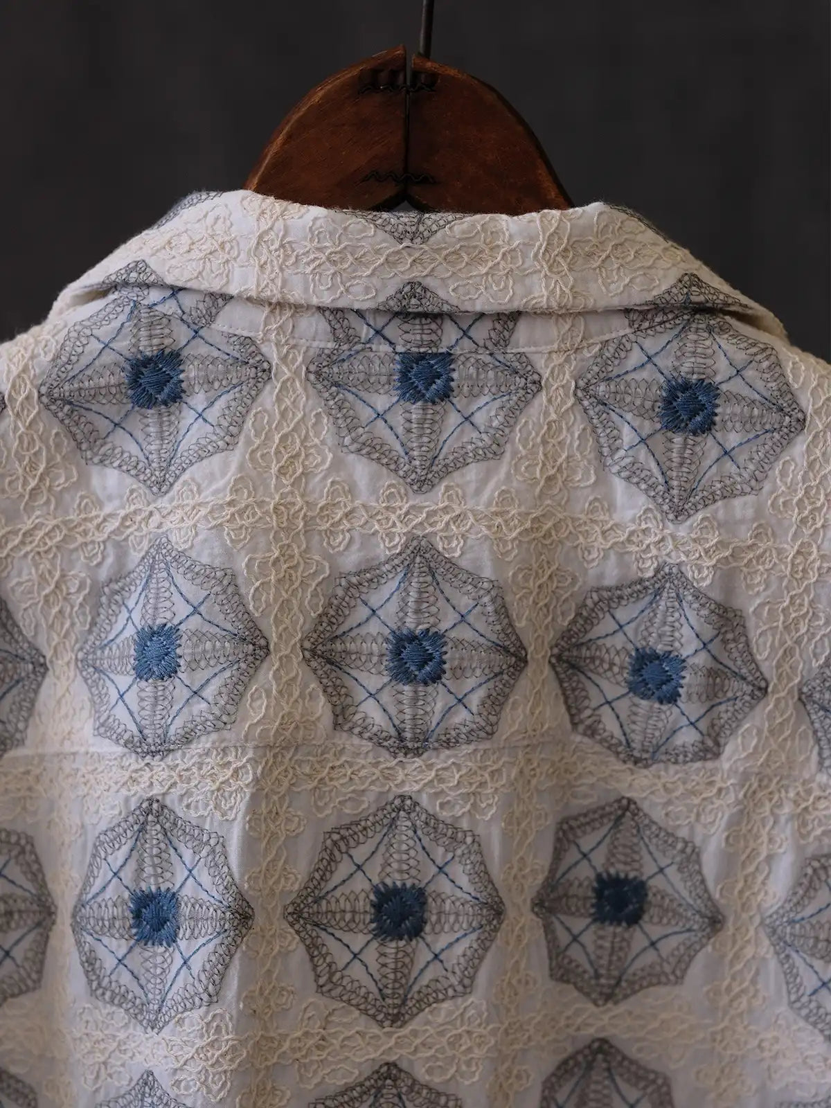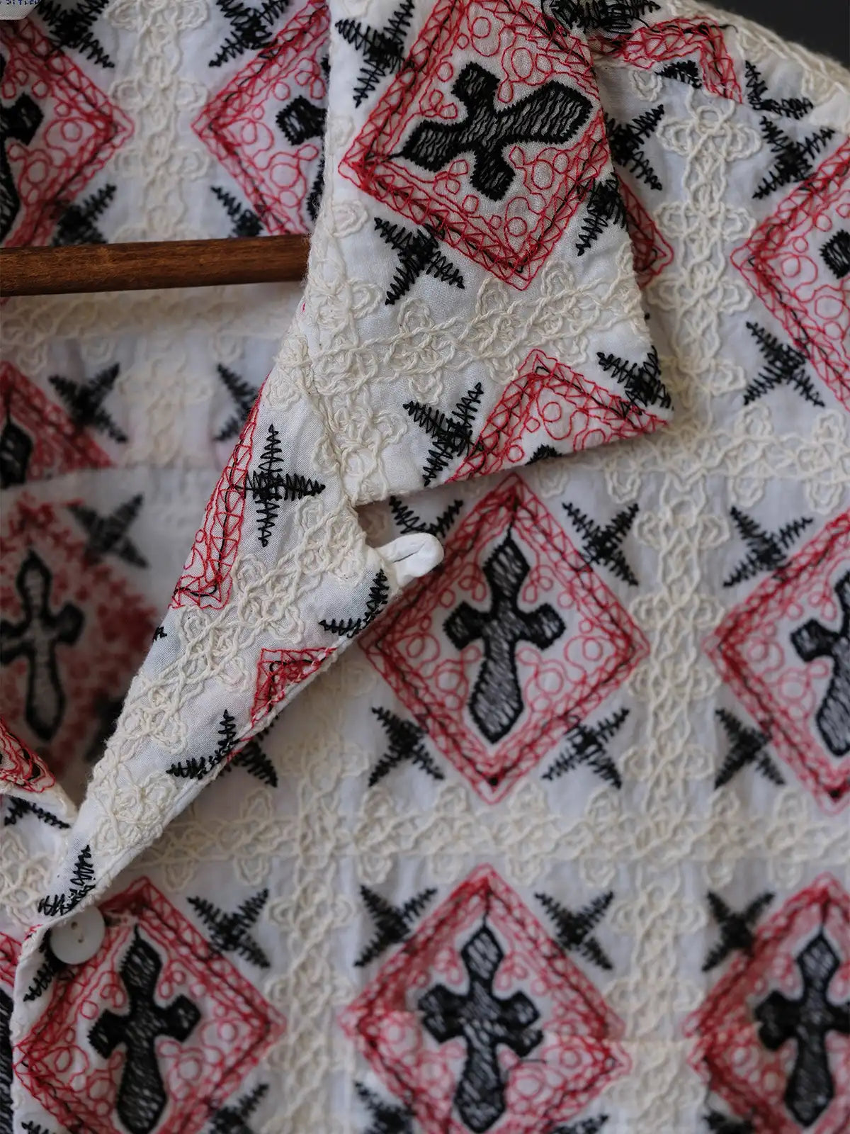 立体的なジャカード織りがアートのように浮かび上がる、伝統技術と現代的なキューバカラーが融合した一着。