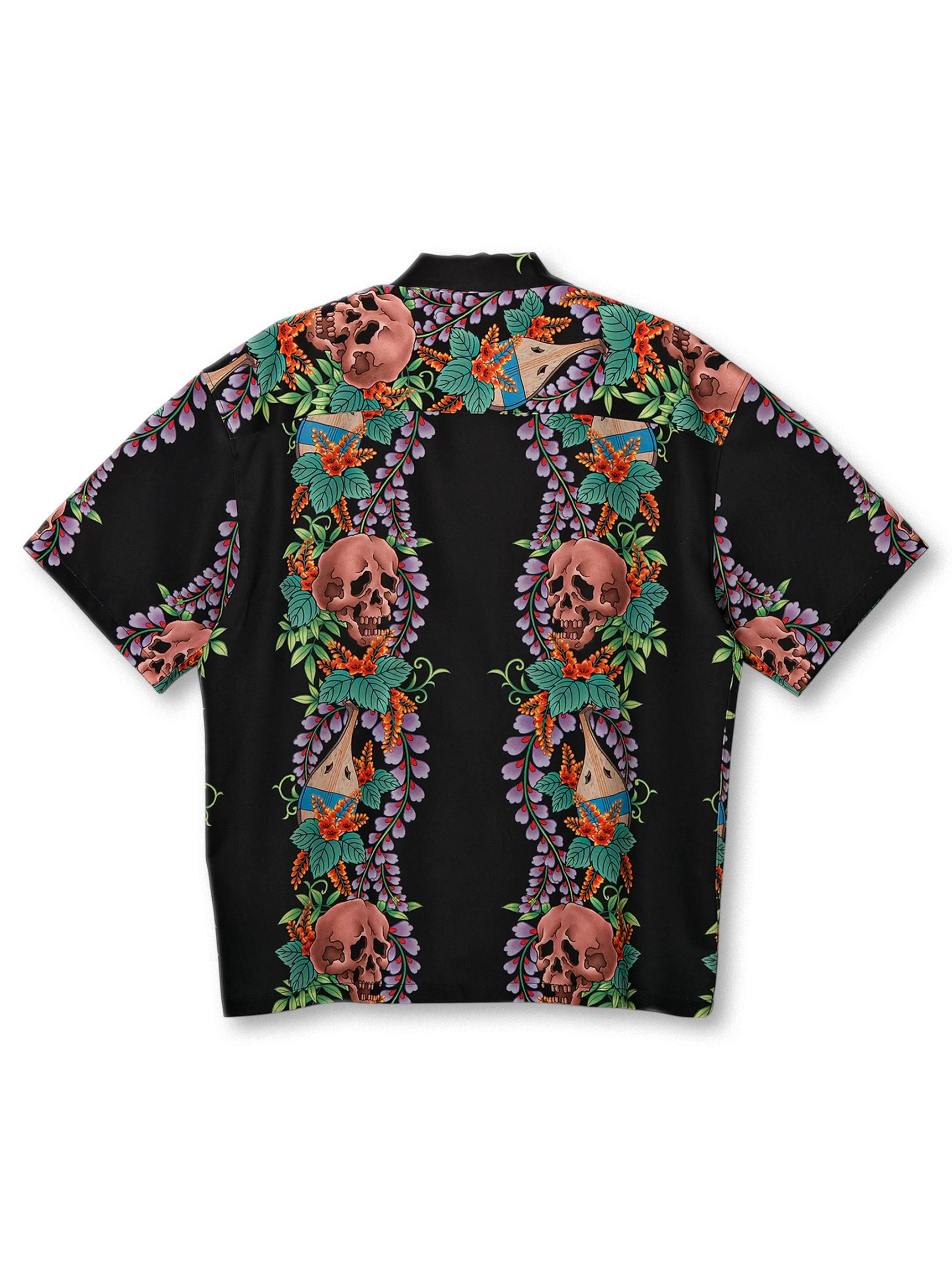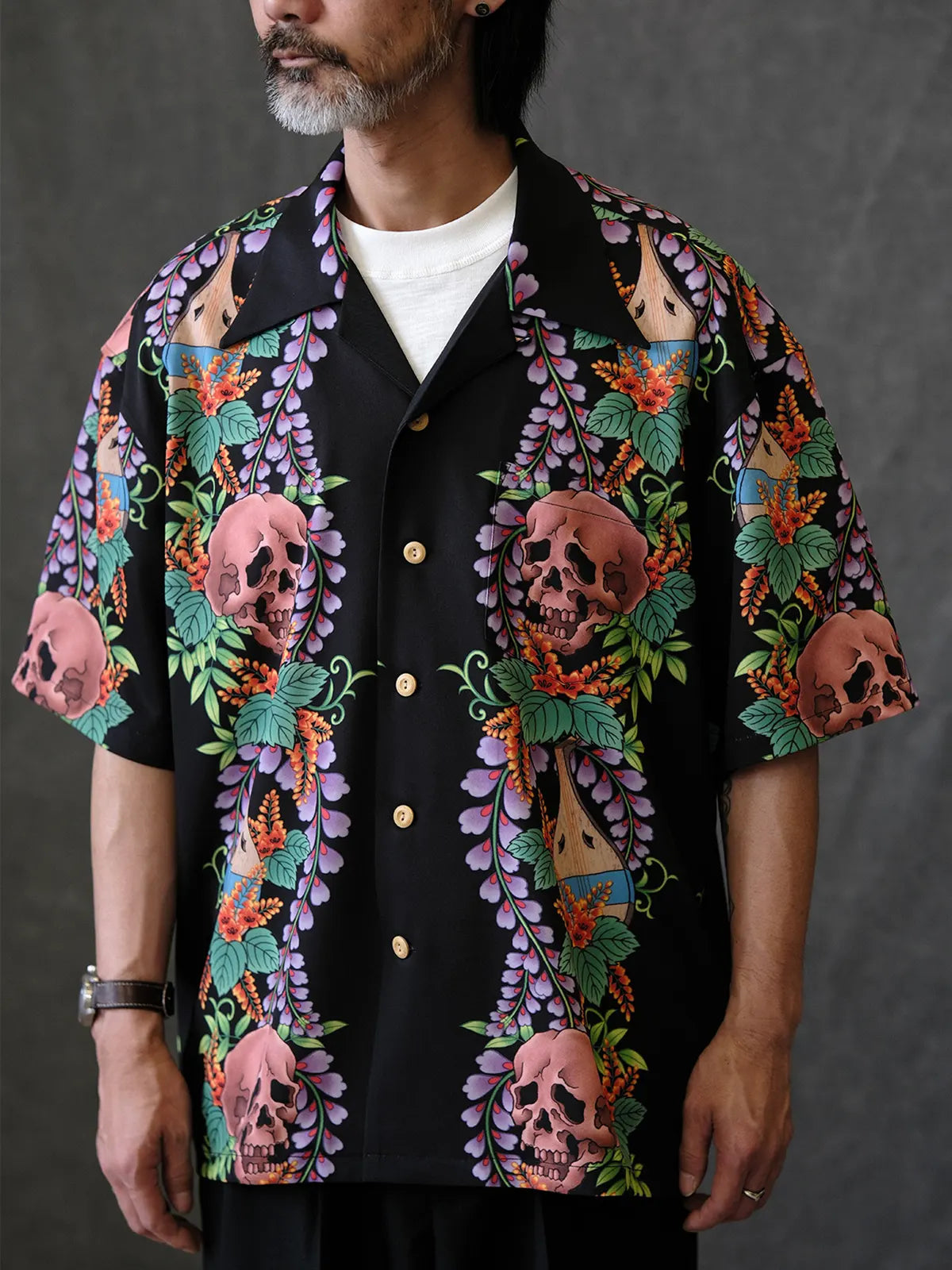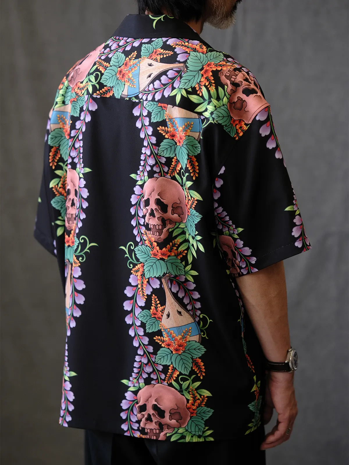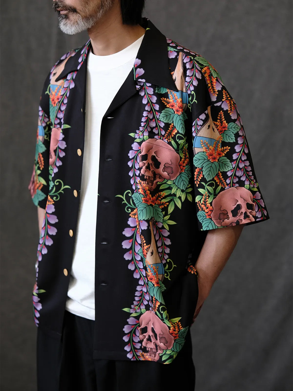 伝統的なオープンカラー&ボックスシルエットをアジアンフィットに最適化しつつ、黒地に浮かぶ骸骨モチーフと鮮やかなトロピカルフラワーの縦パネルプリントがストリート×リゾートの雰囲気を融合。ヴィンテージ感ある竹ボタンをあしらい、前立てもすっきりと見せる比翼仕立て。厳密な対柄裁断により、左右対称の美しい絵柄連続が楽しめ、羽織るだけで強烈な印象を与える一着。
