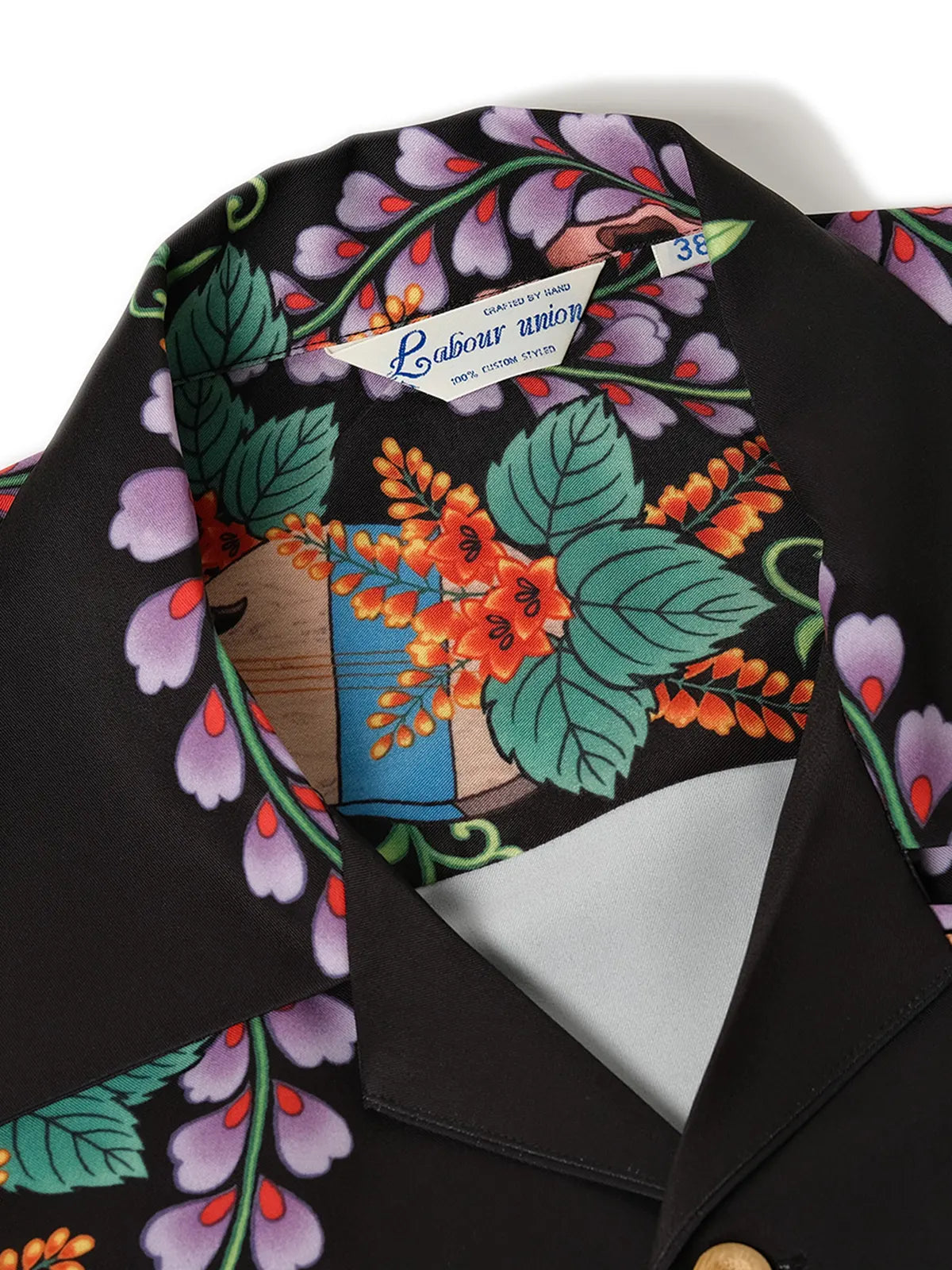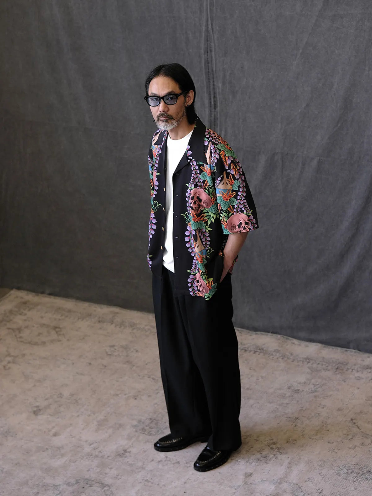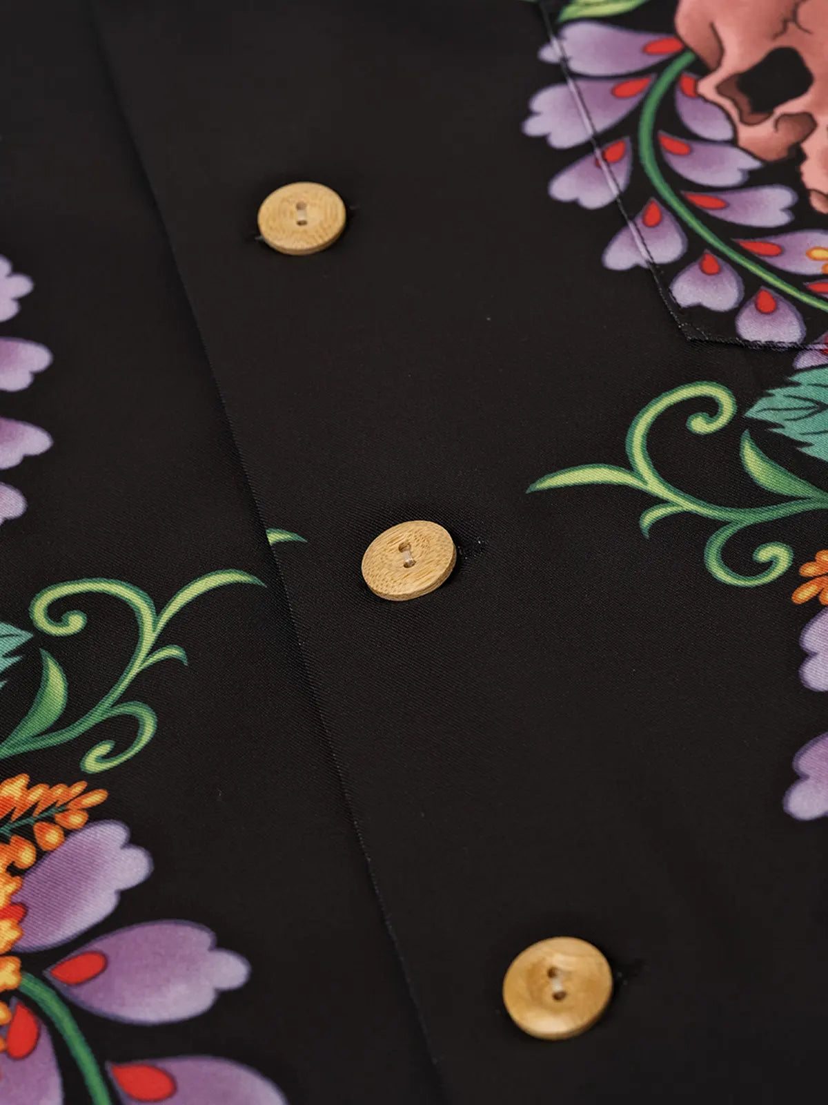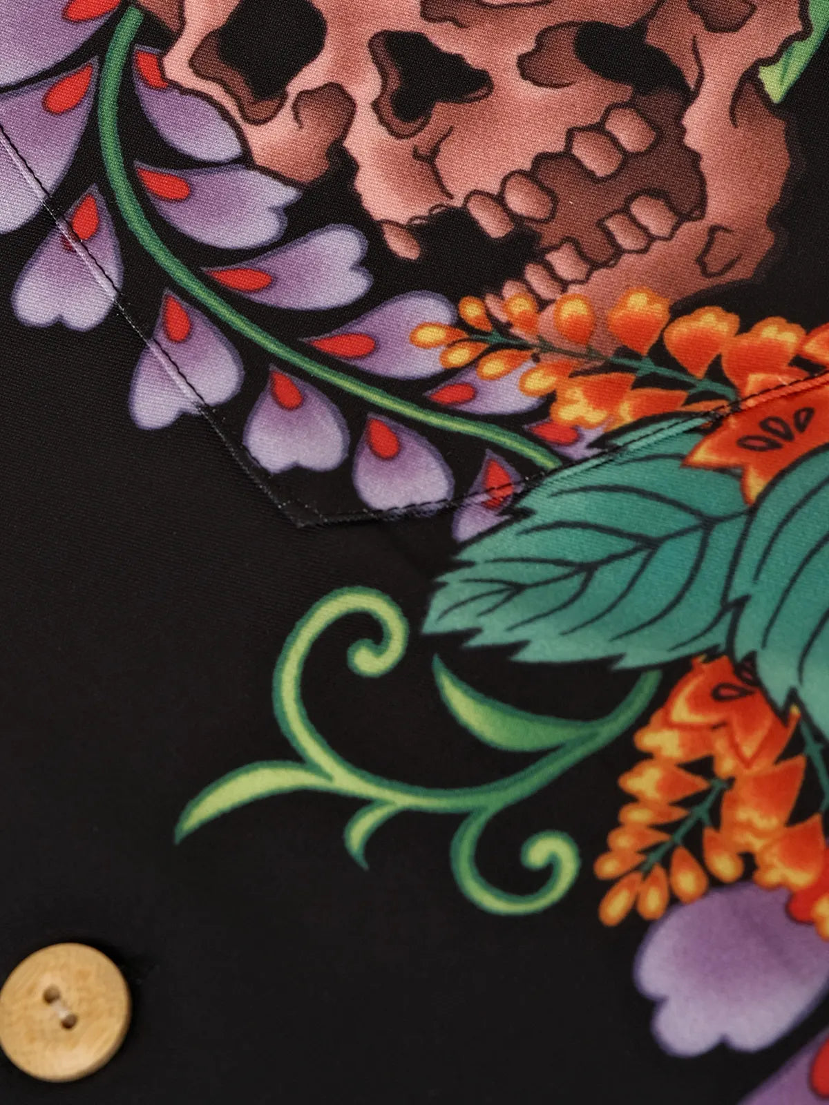 伝統的なオープンカラー&ボックスシルエットをアジアンフィットに最適化しつつ、黒地に浮かぶ骸骨モチーフと鮮やかなトロピカルフラワーの縦パネルプリントがストリート×リゾートの雰囲気を融合。ヴィンテージ感ある竹ボタンをあしらい、前立てもすっきりと見せる比翼仕立て。厳密な対柄裁断により、左右対称の美しい絵柄連続が楽しめ、羽織るだけで強烈な印象を与える一着。