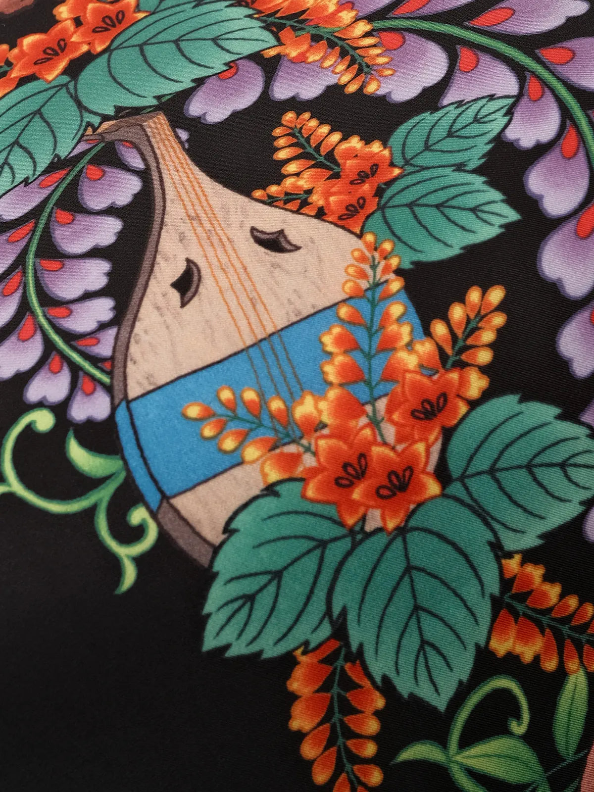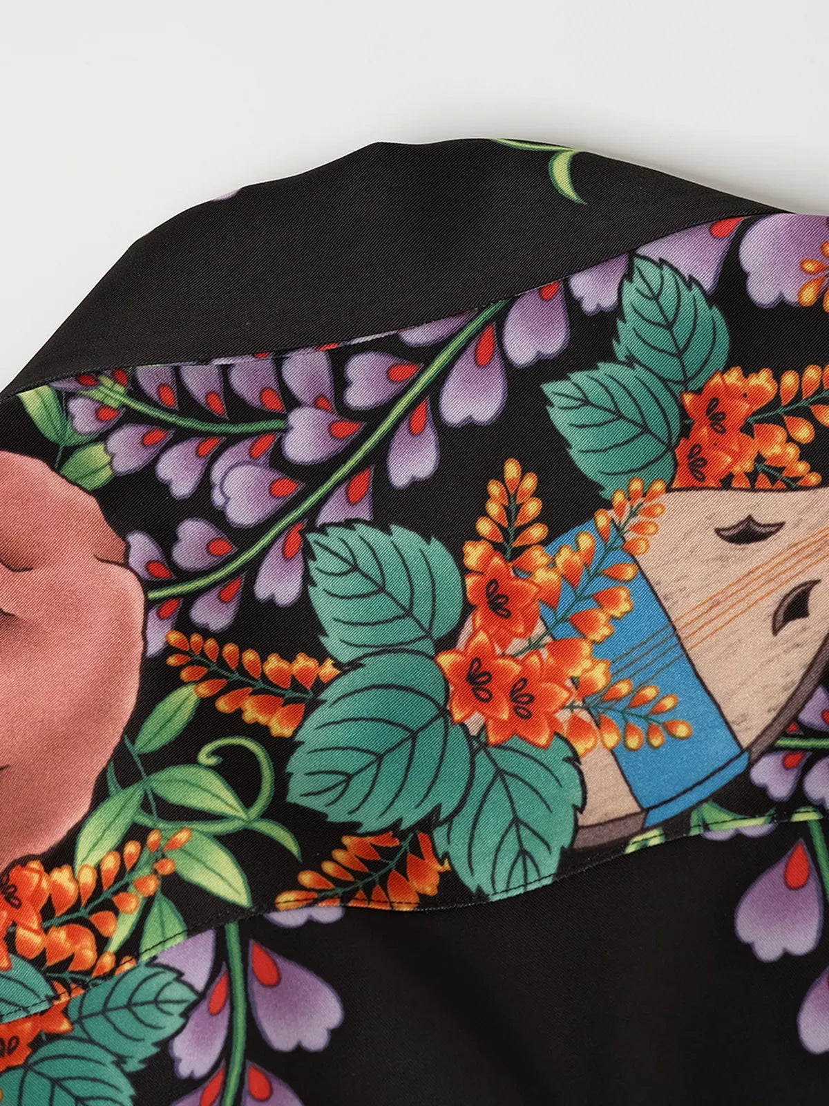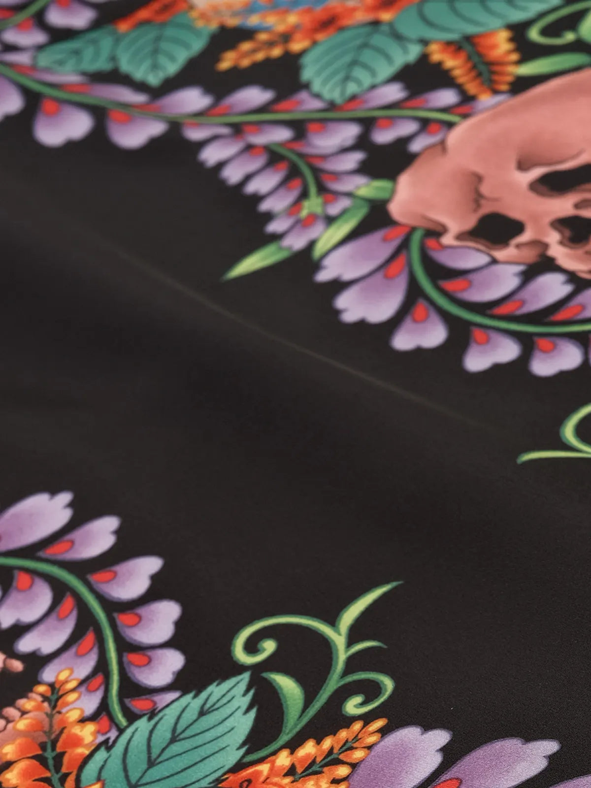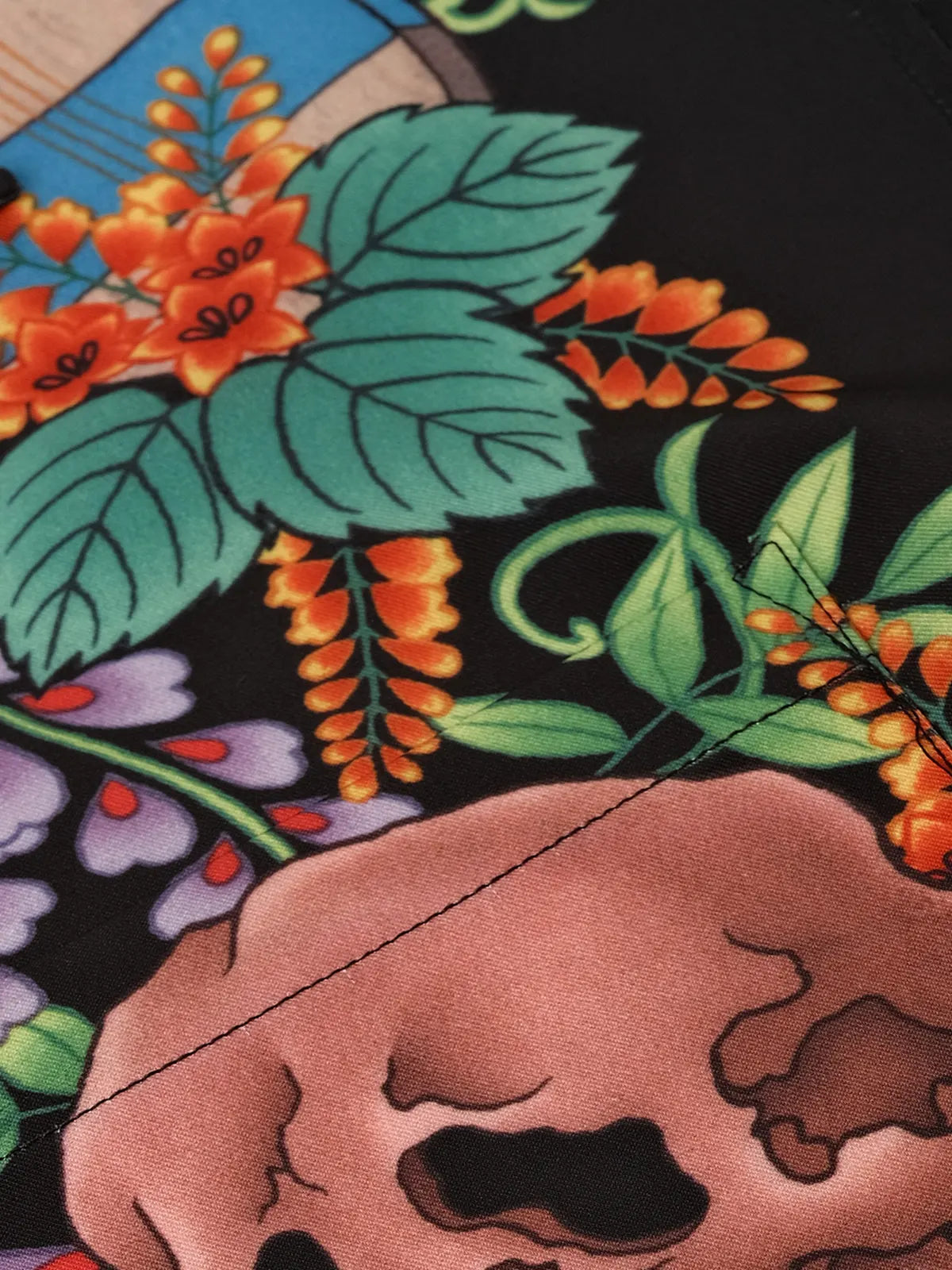 伝統的なオープンカラー&ボックスシルエットをアジアンフィットに最適化しつつ、黒地に浮かぶ骸骨モチーフと鮮やかなトロピカルフラワーの縦パネルプリントがストリート×リゾートの雰囲気を融合。ヴィンテージ感ある竹ボタンをあしらい、前立てもすっきりと見せる比翼仕立て。厳密な対柄裁断により、左右対称の美しい絵柄連続が楽しめ、羽織るだけで強烈な印象を与える一着。