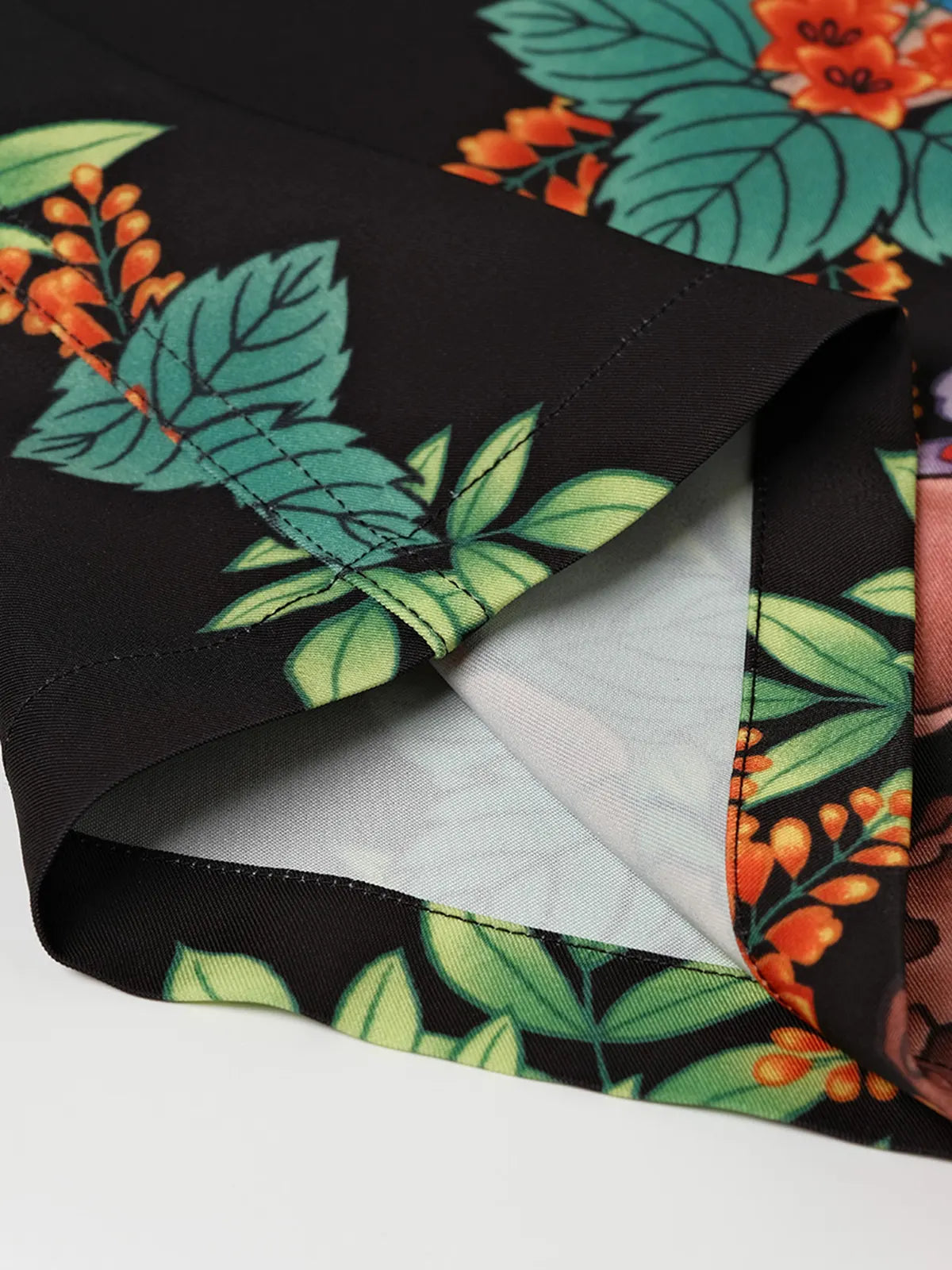 大胆な骸骨×トロピカルフラワープリントを施した、リラックスシルエットのアロハシャツ。