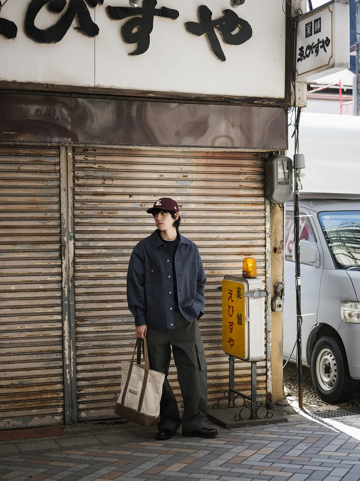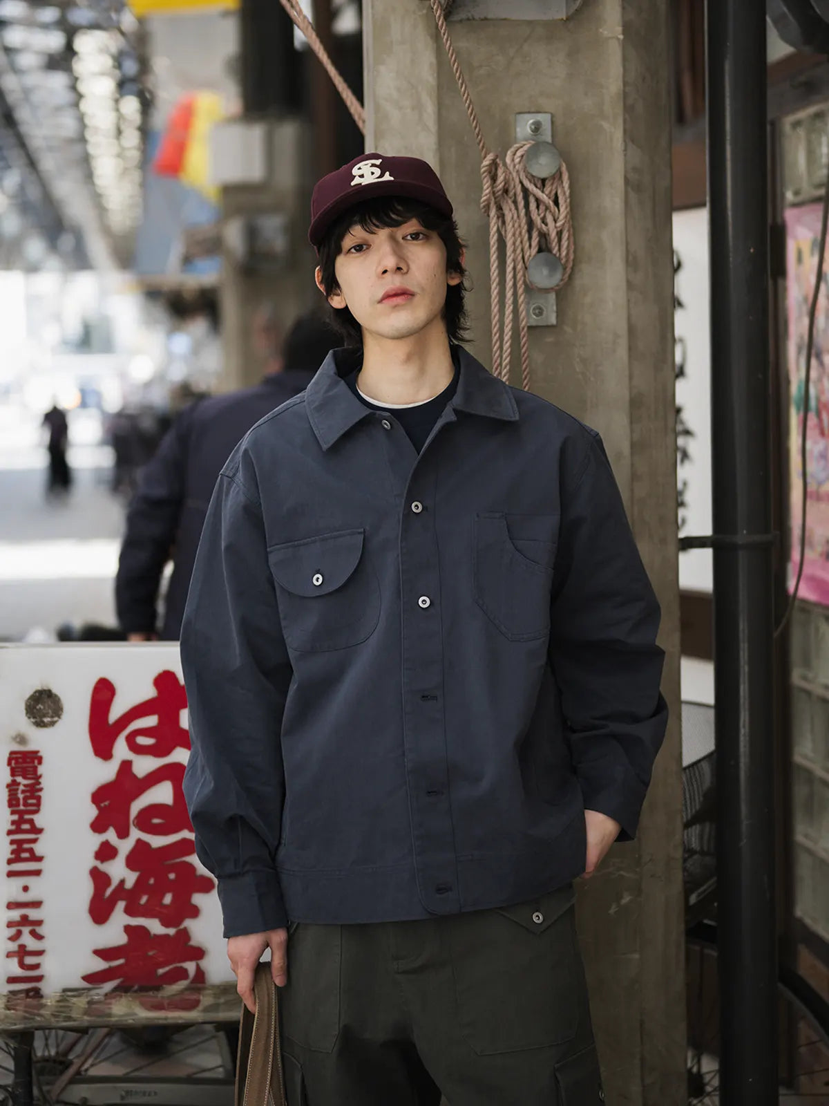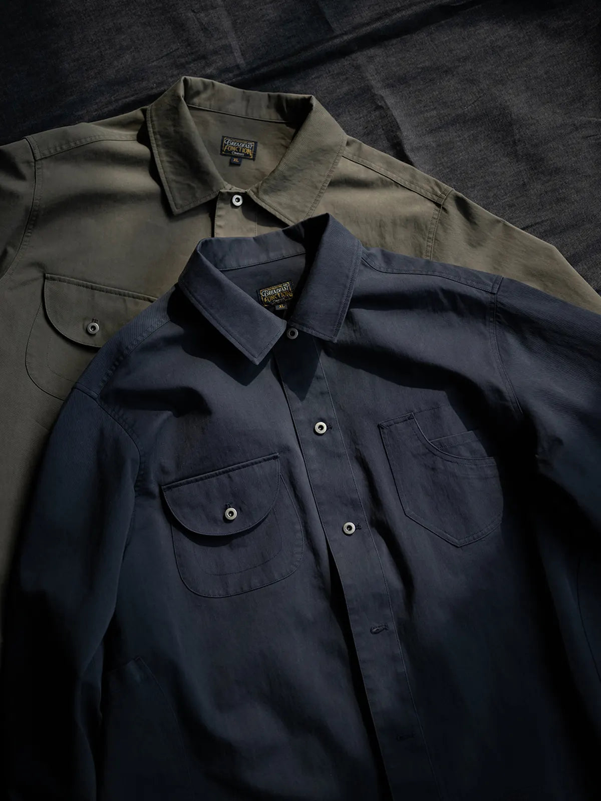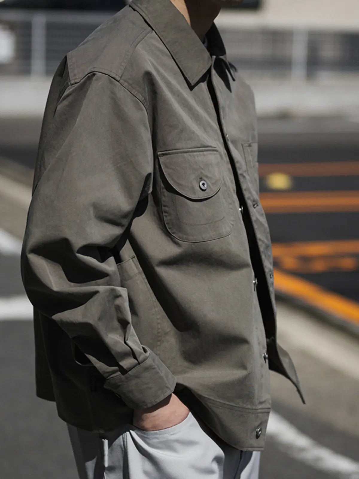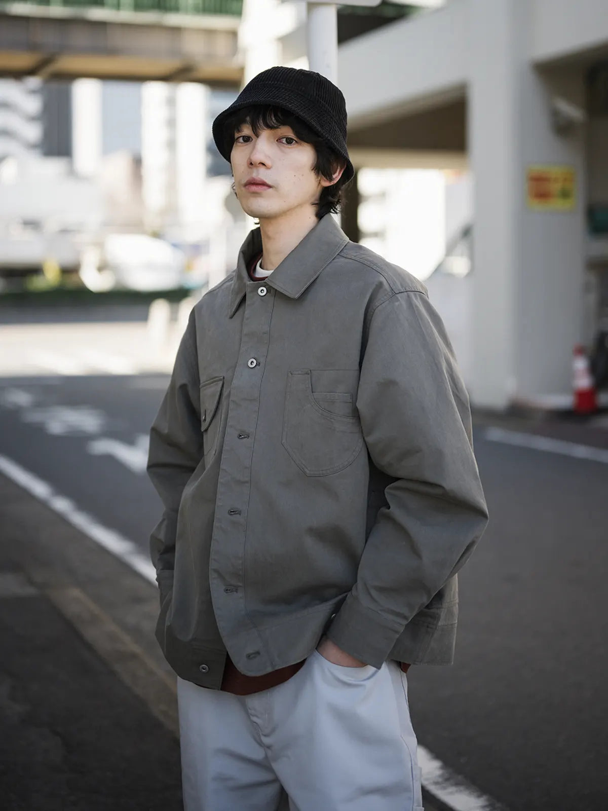 ハンティングジャケットのデザインロジックをもとに、短くワイドなシルエットに再構築したシャツアウター。
