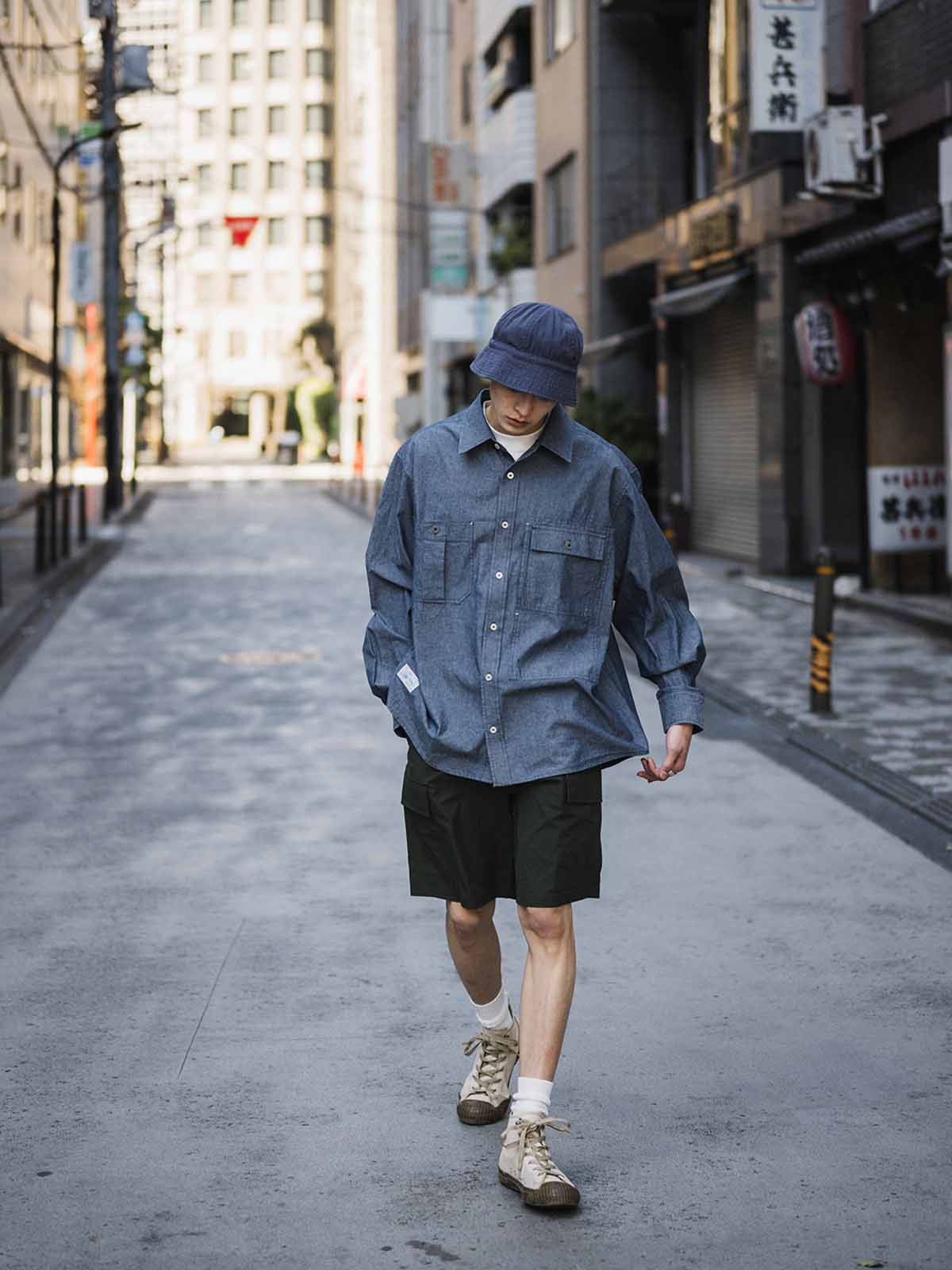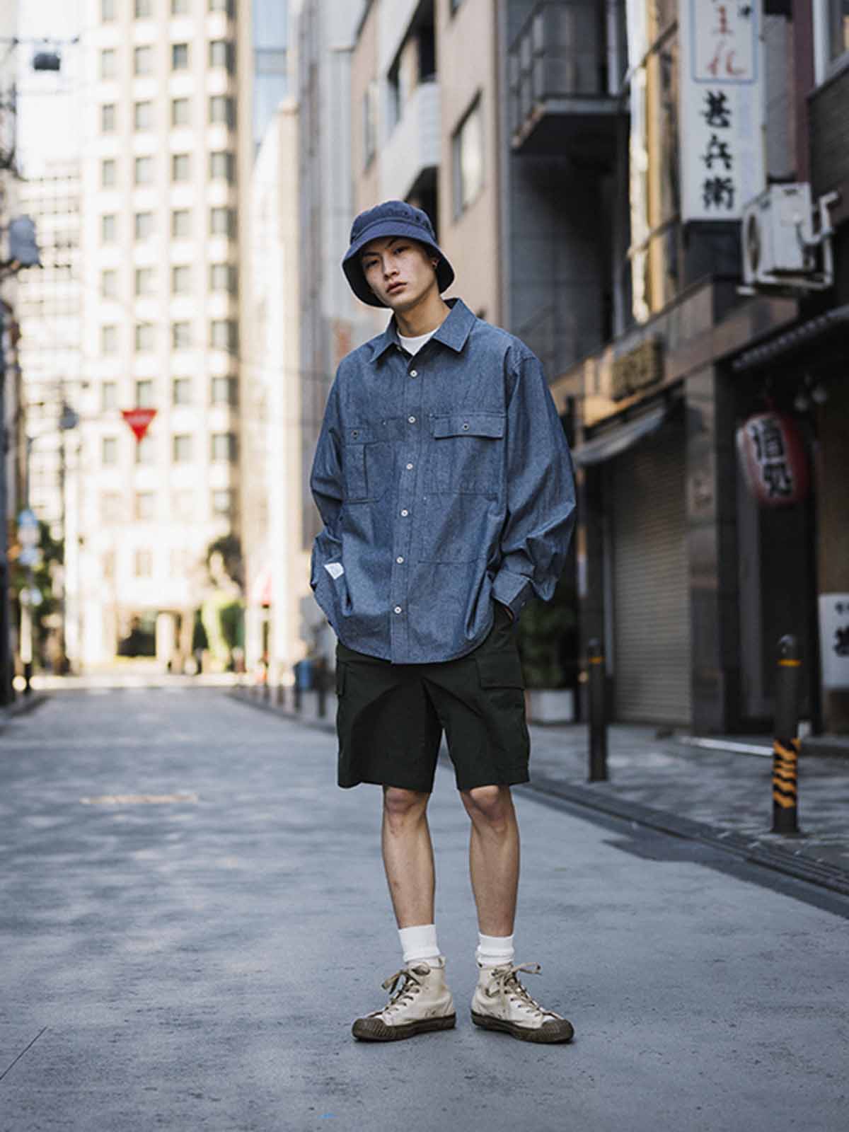 このシャツは、1940年代のUSN Chambray Shirtのエッセンスを受け継ぎ、日本製155gコットン靛青青年布を使用。布面は色糸と白糸が交じり合い、靛青の中に浅い白のラインが浮かび上がる独特なテクスチャーを実現。酵素洗い加工により、自然なシワと色落ちが現れ、旧化したヴィンテージ感を醸し出します。Boxyカットのルーズフィットで、胸周りは広めながら肩幅と丈は適度に保たれ、実用的な両胸ポケットと側面ポケットが付いています。