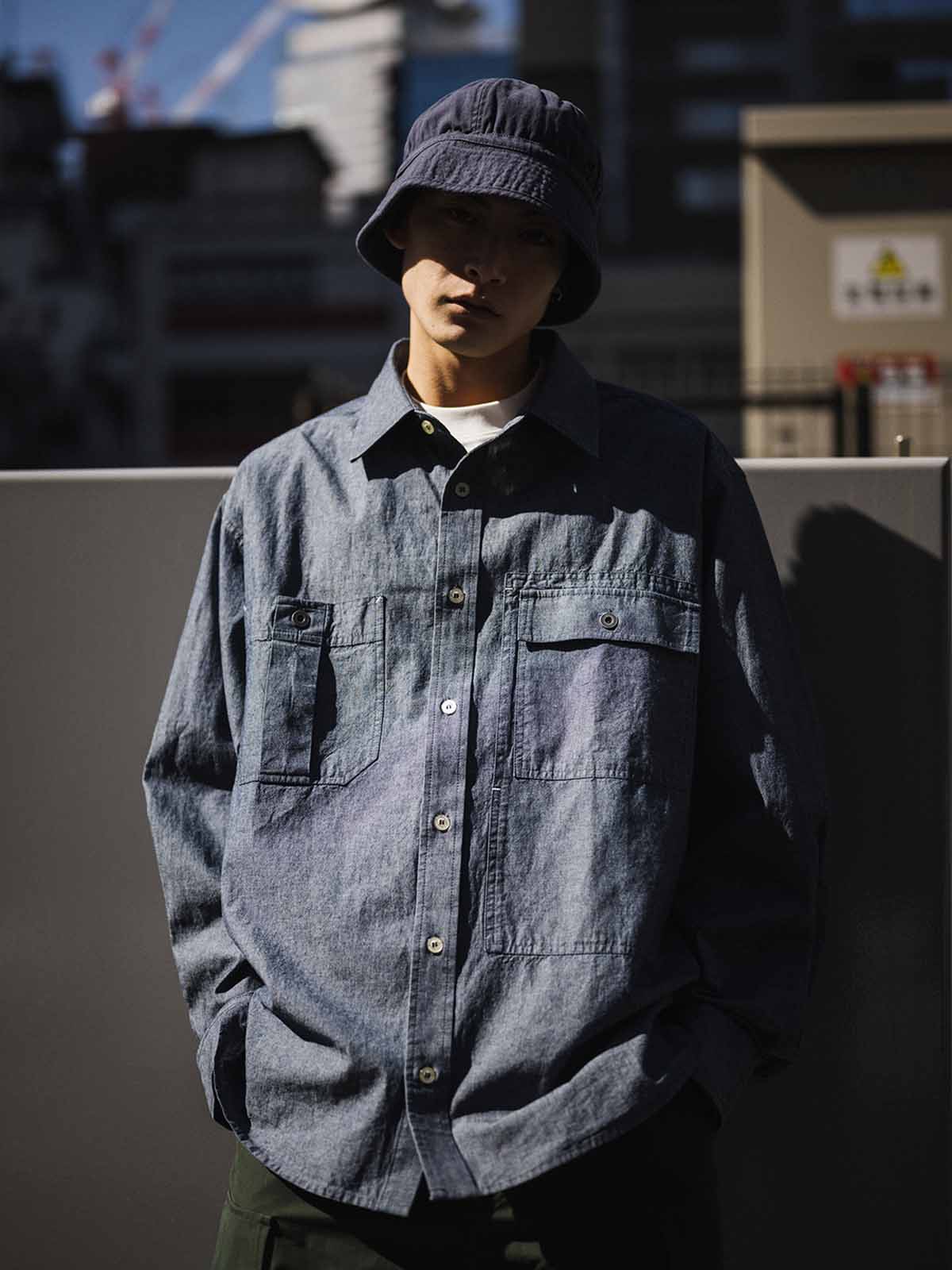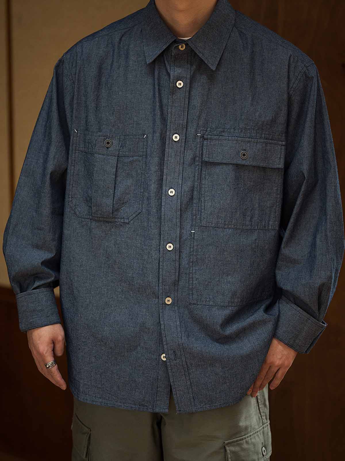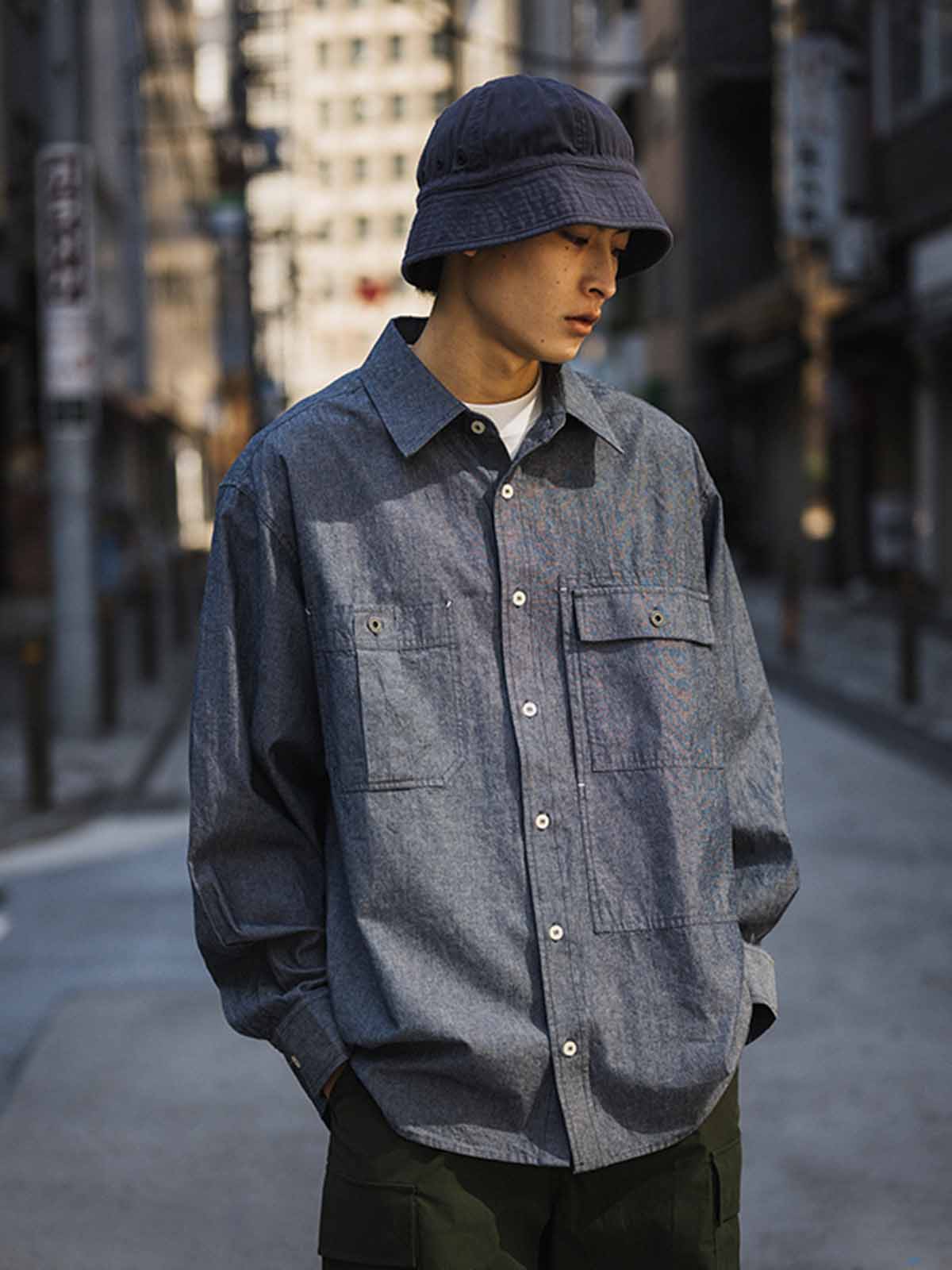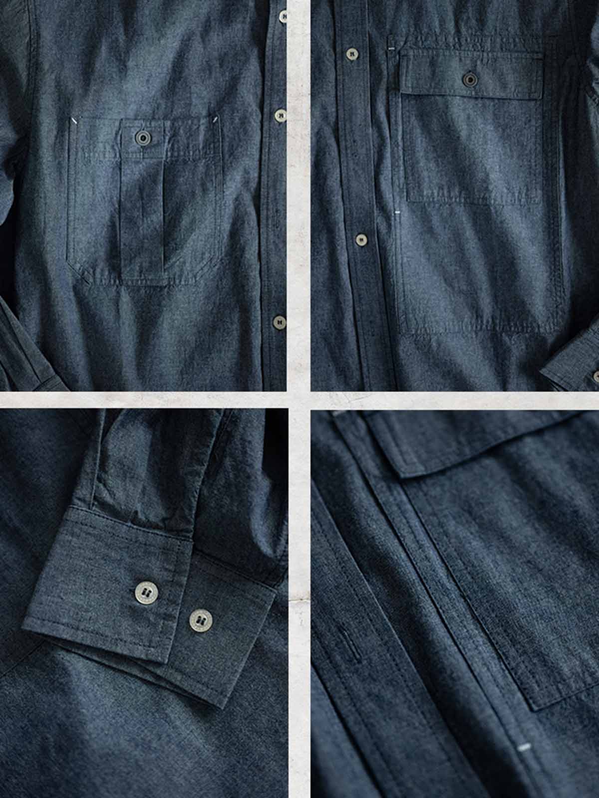 1940年代のUSN Chambray Shirtにインスパイアされた、日本製の軽量靛青生地を使用した、耐摩耗性と通気性を兼ね備えたヴィンテージ風ルーズフィットシャツ。