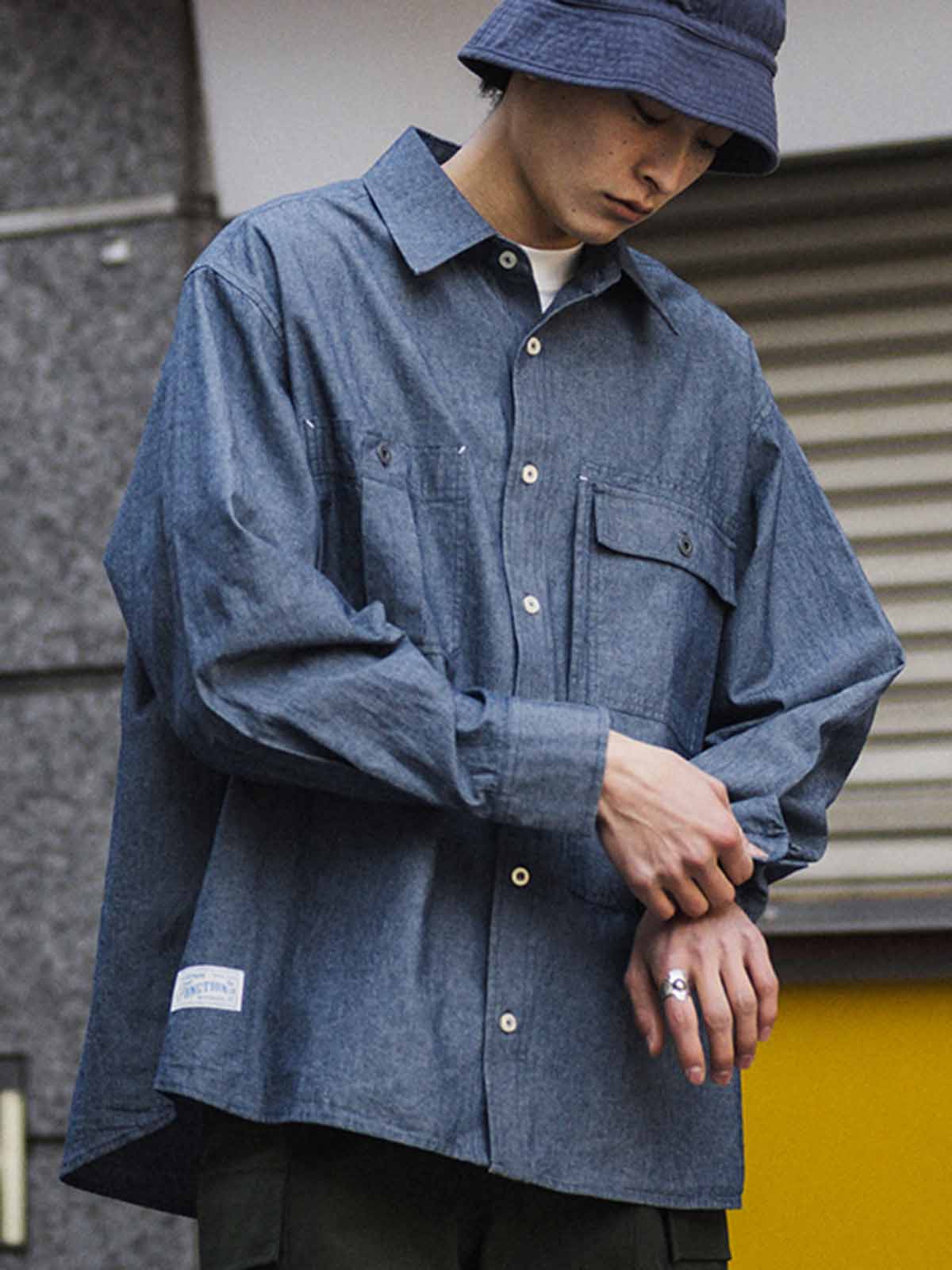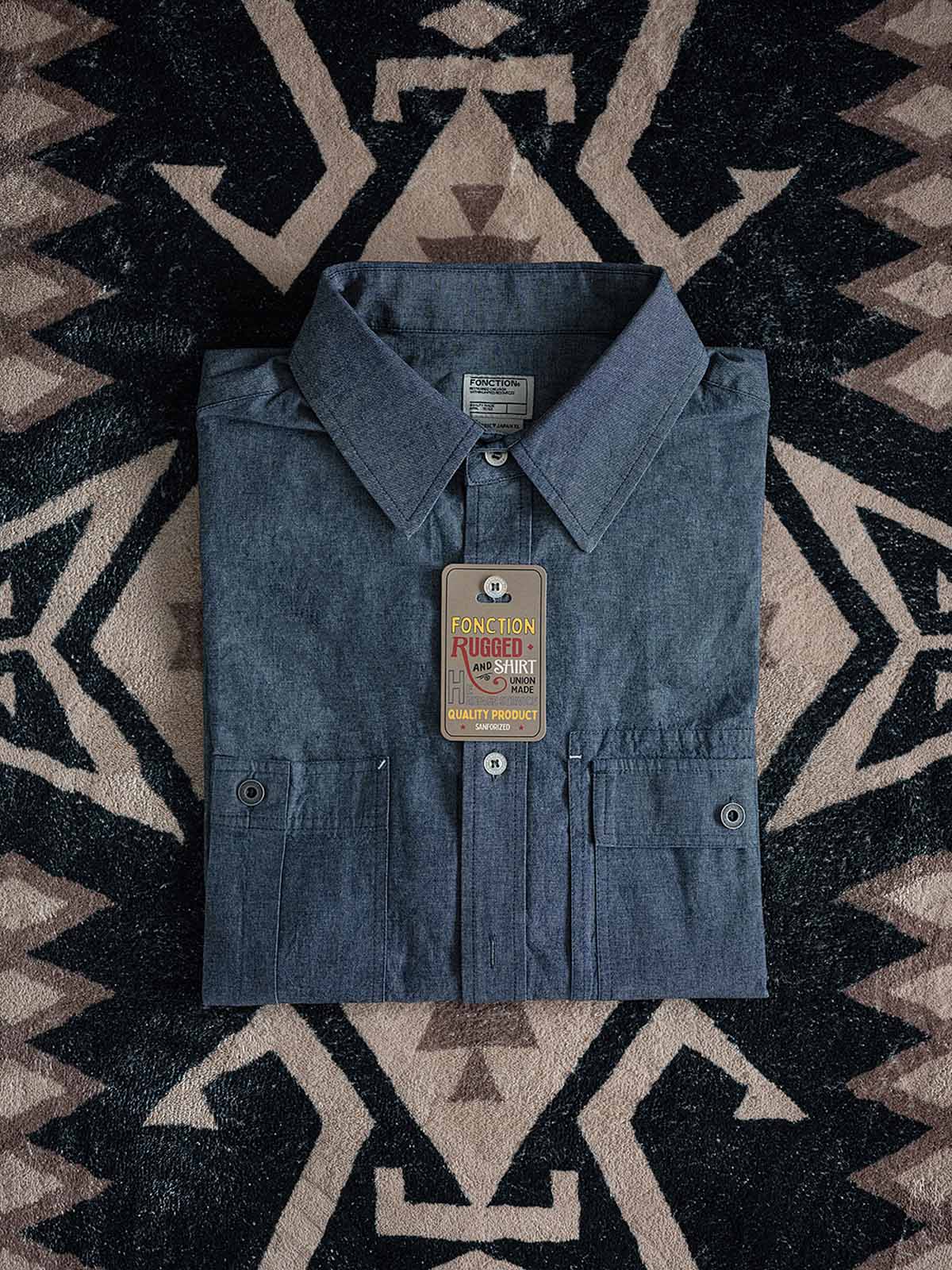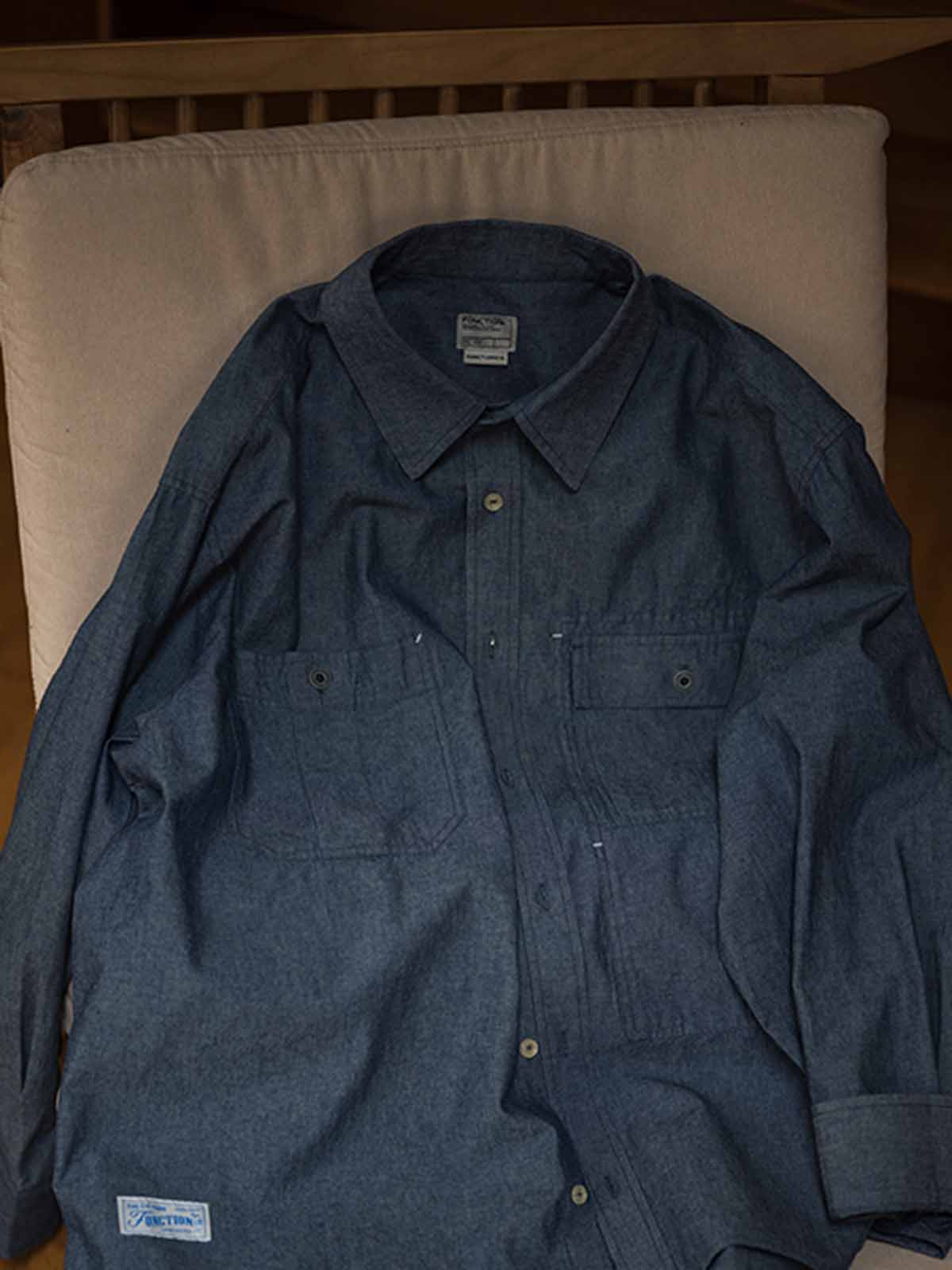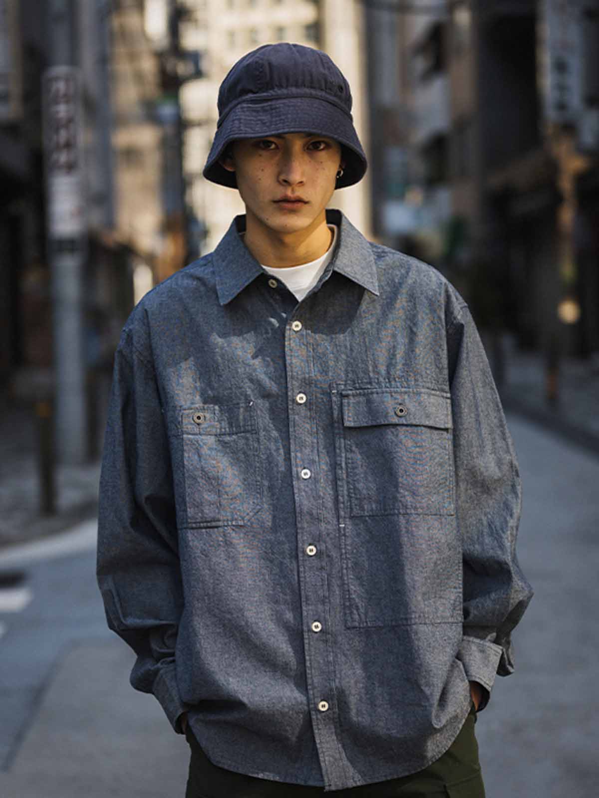 1940年代のUSN Chambray Shirtにインスパイアされた、日本製の軽量靛青生地を使用した、耐摩耗性と通気性を兼ね備えたヴィンテージ風ルーズフィットシャツ。