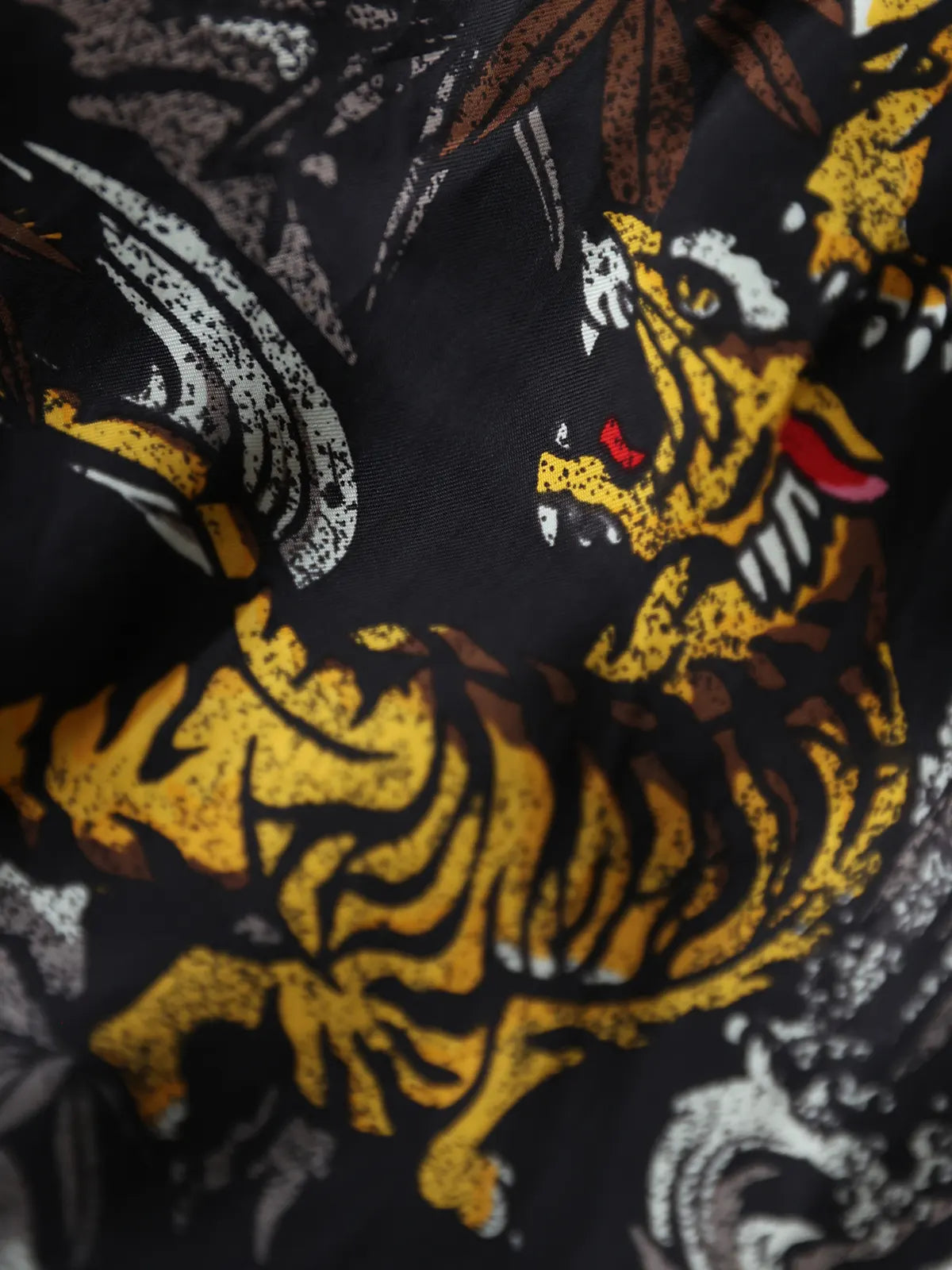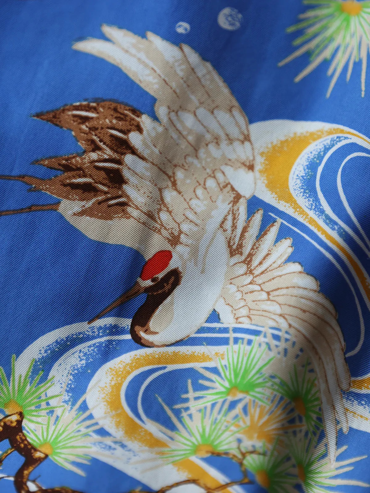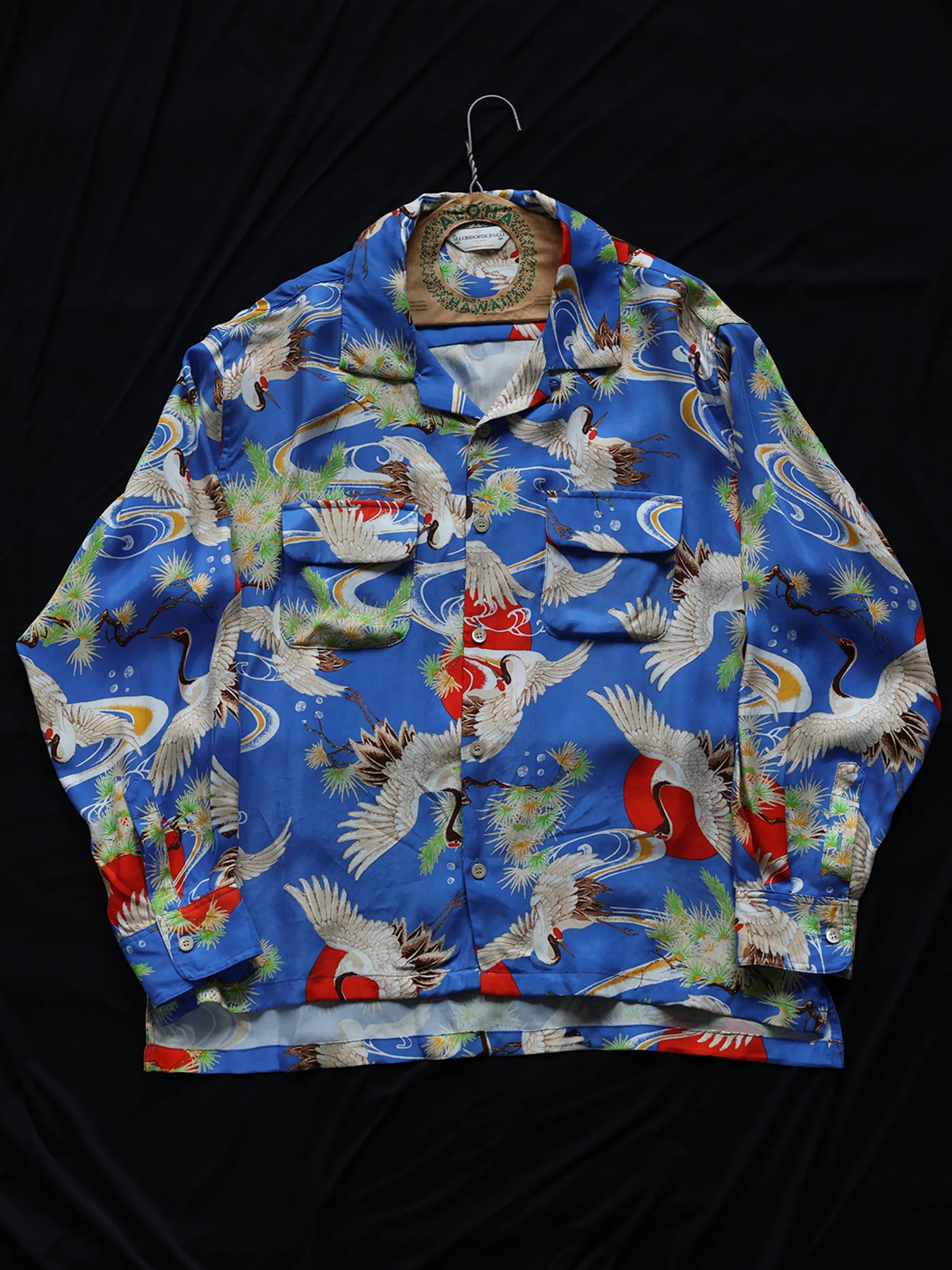 銅アンモニアレーヨン100%のなめらかな光沢感と、老虎・仙鶴・錦鯉をあしらった鮮やかなプリントが映える、オーバーサイズのアロハシャツです。