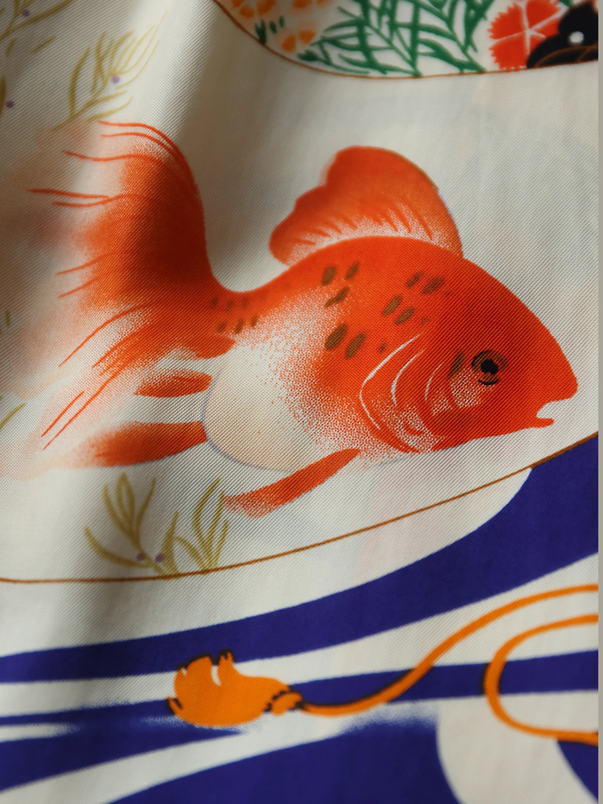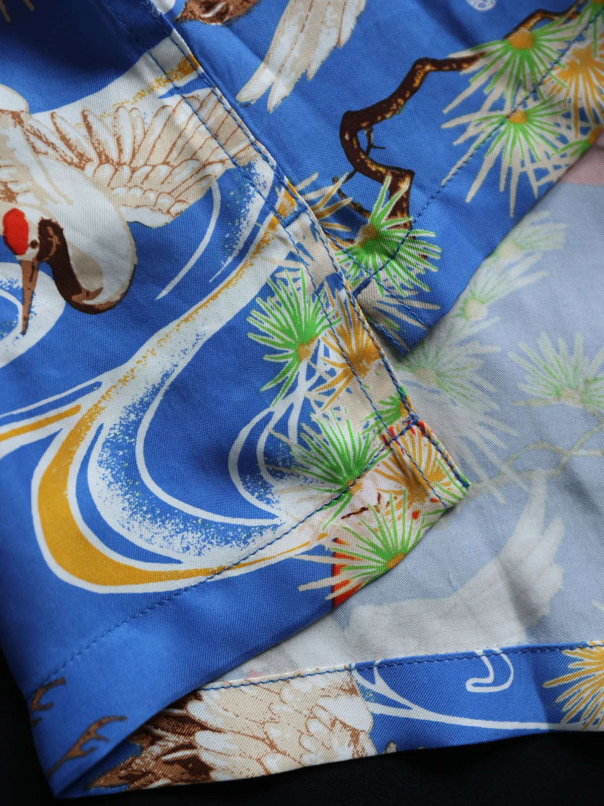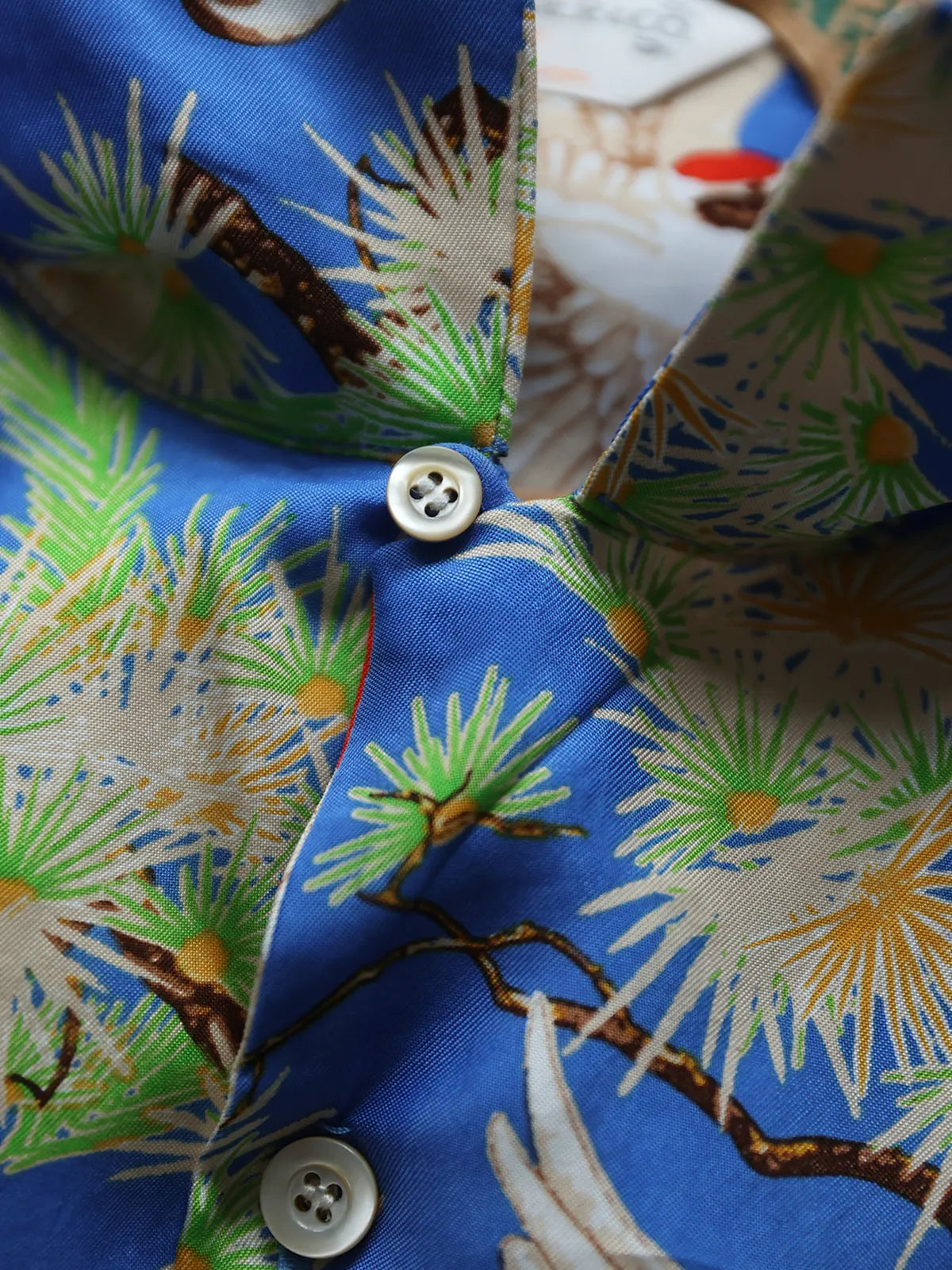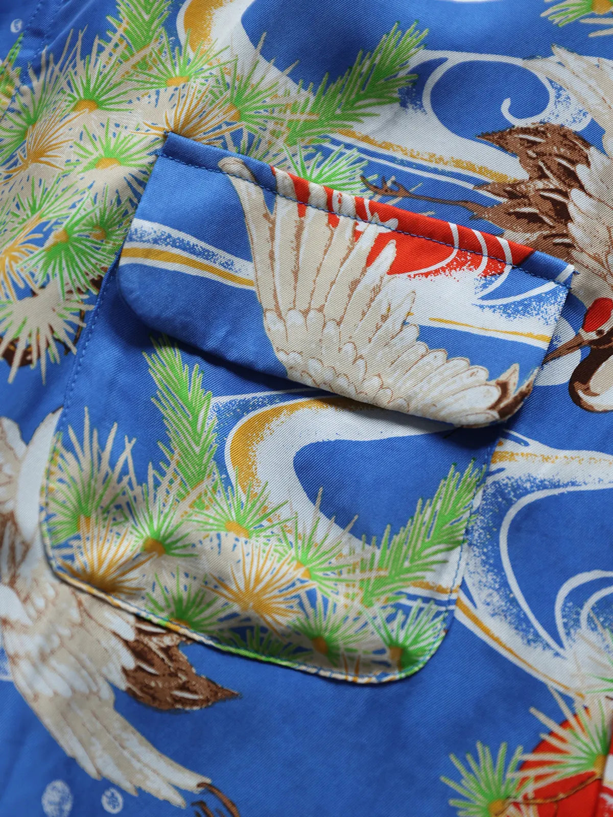 銅アンモニアレーヨン100%のなめらかな光沢感と、老虎・仙鶴・錦鯉をあしらった鮮やかなプリントが映える、オーバーサイズのアロハシャツです。