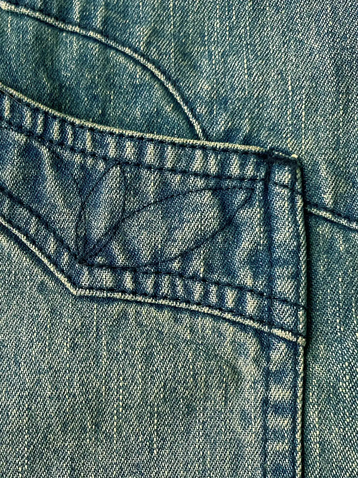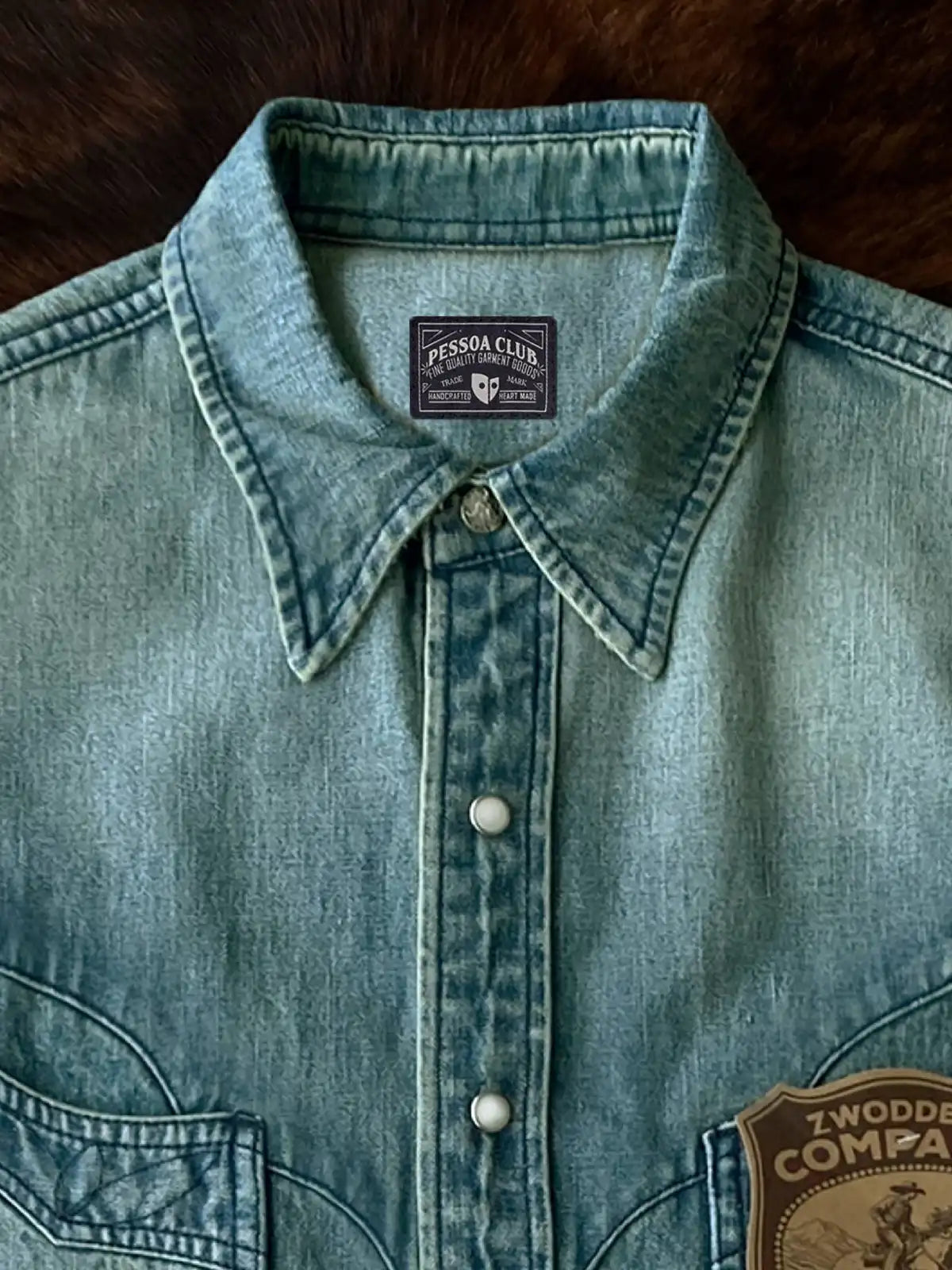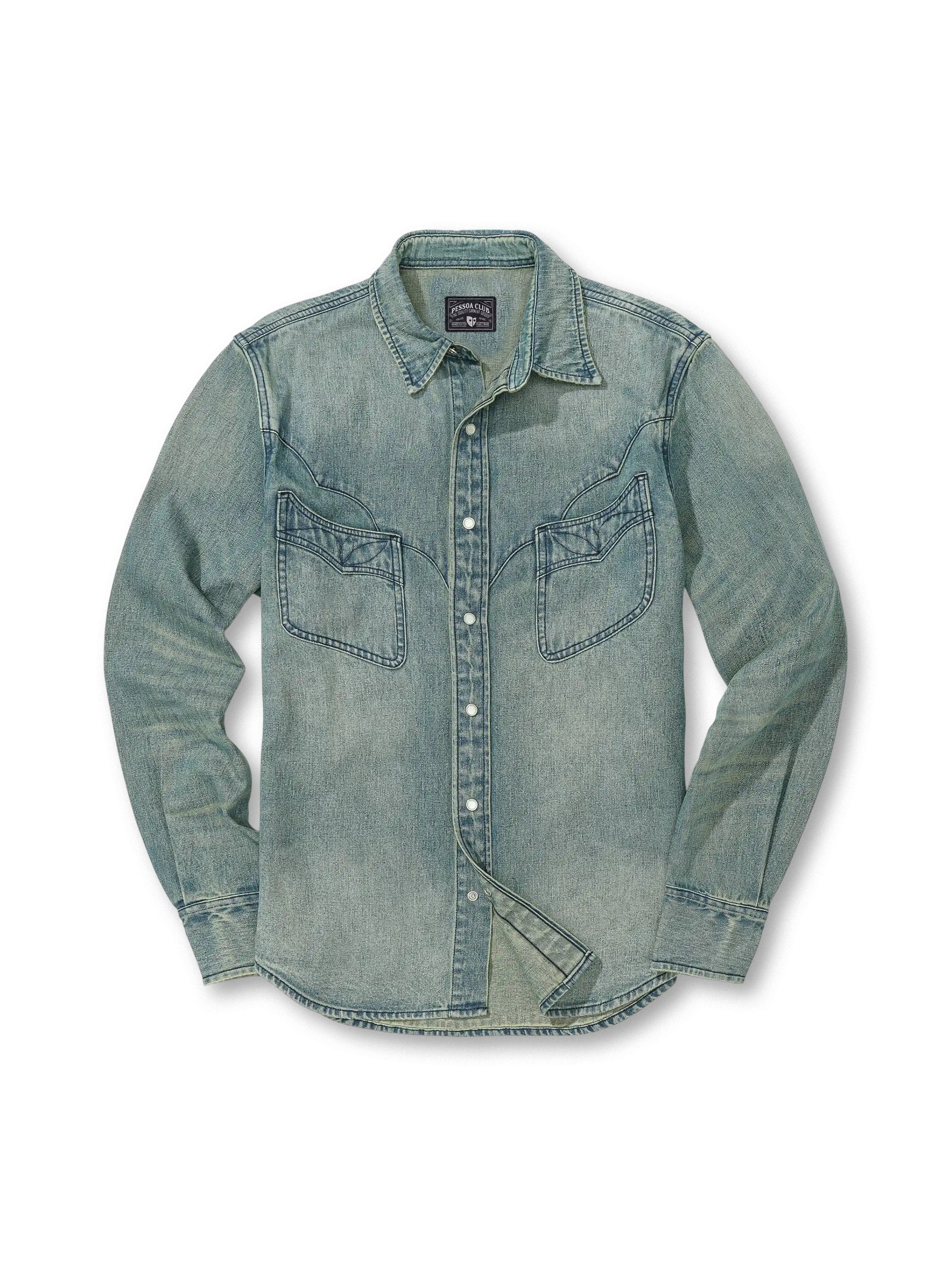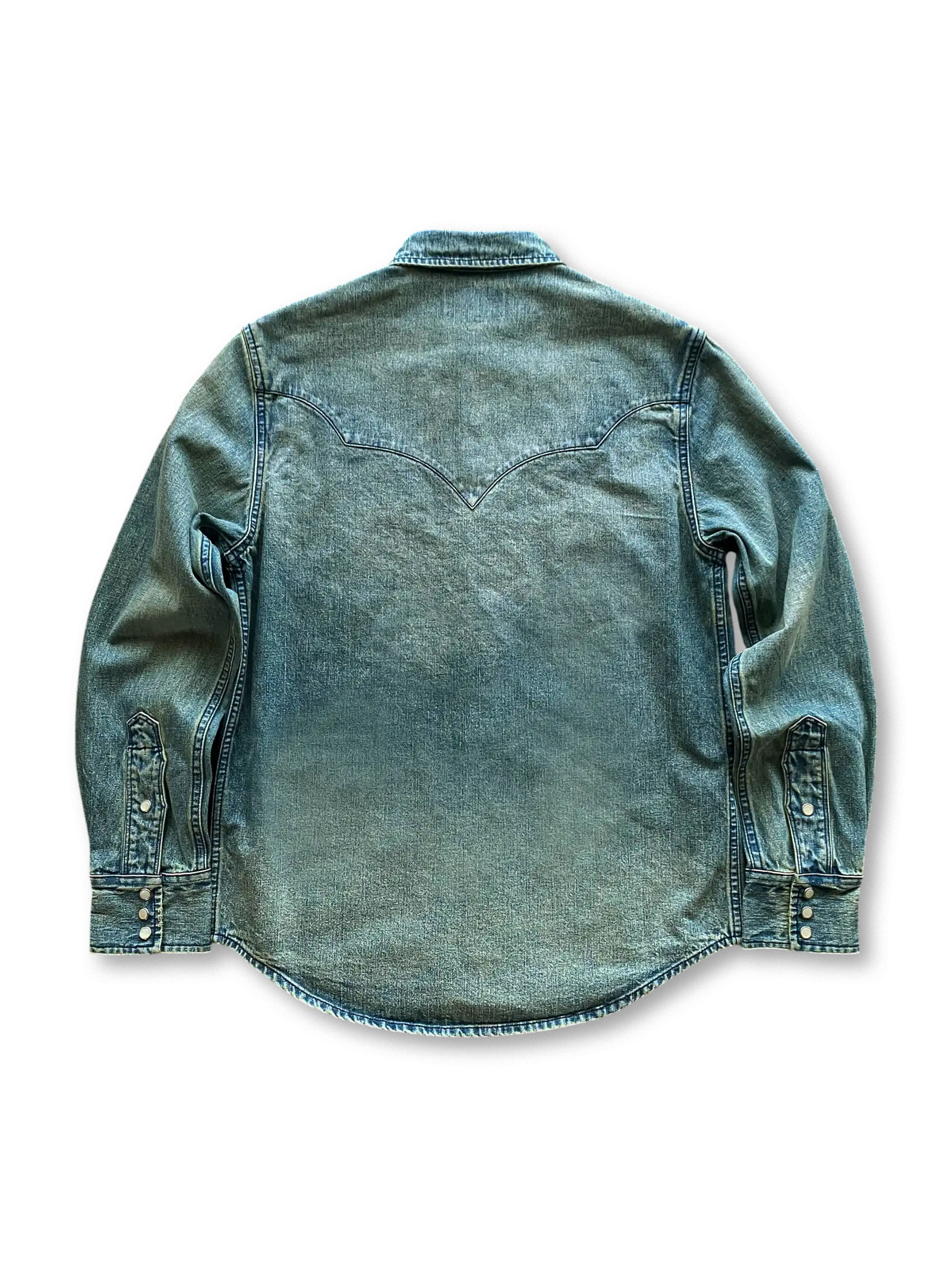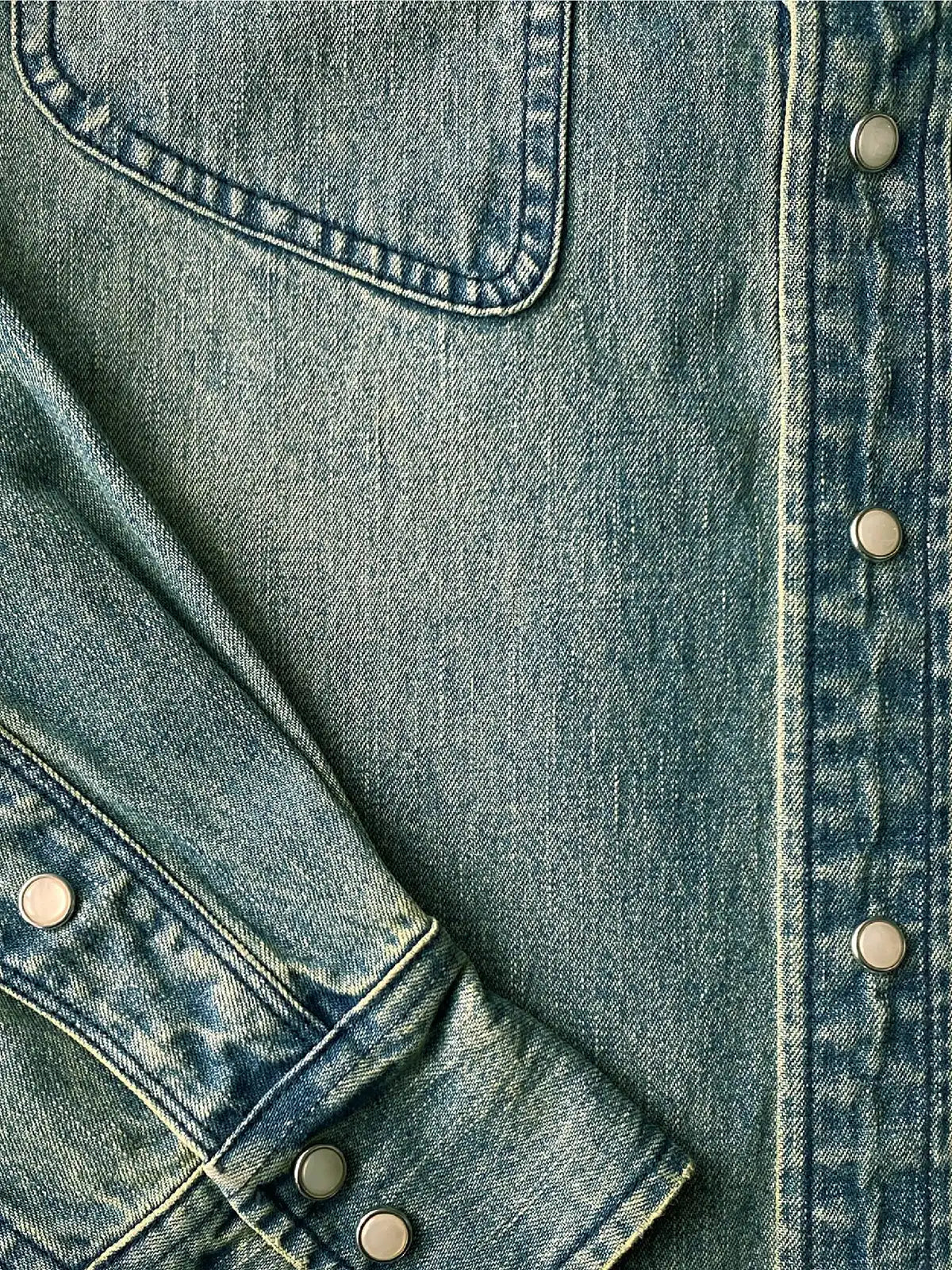 重厚な100%コットンセルビッジデニムにヴィンテージ風ウォッシュとシルバースナップを施した、アメカジ西部テイストの本格ワークシャツ。