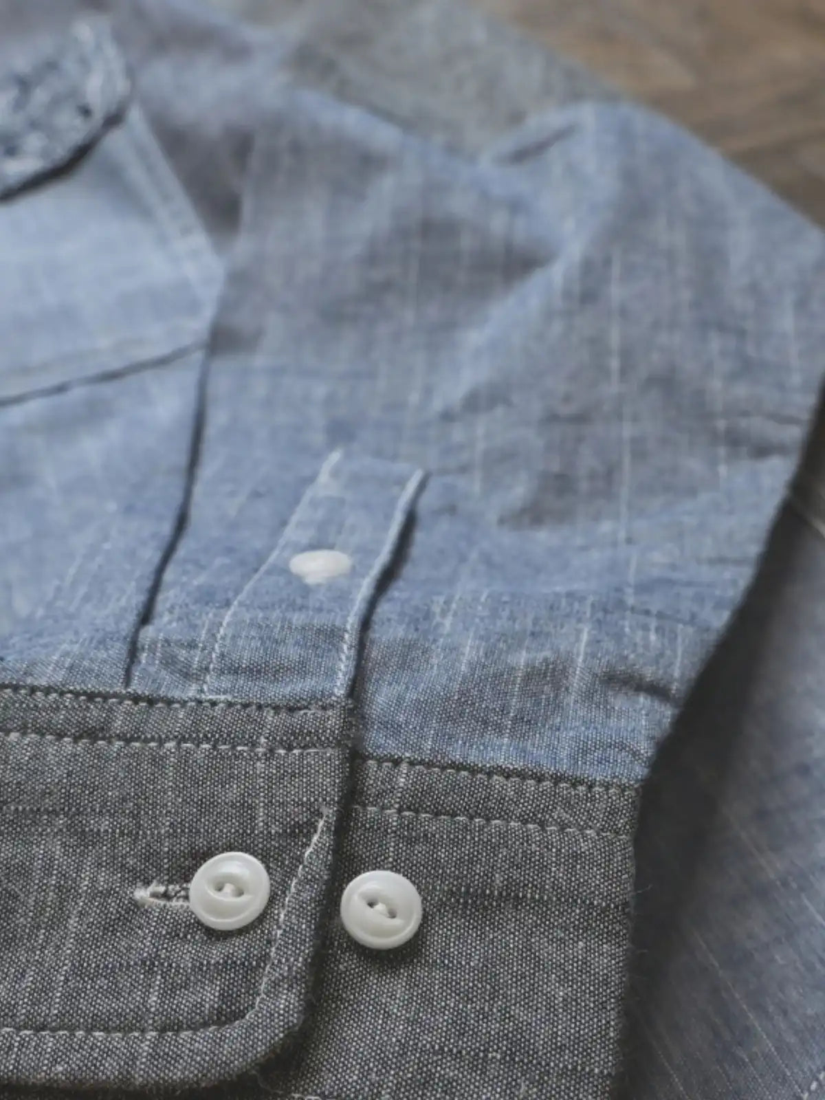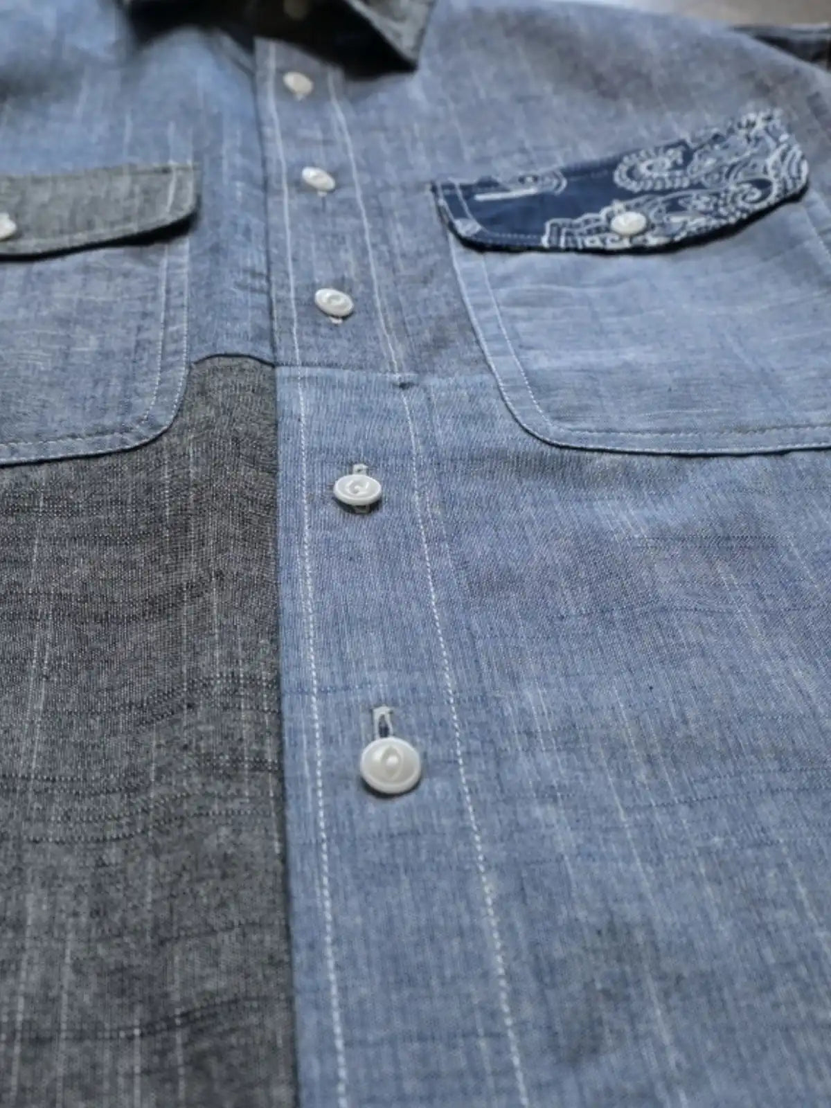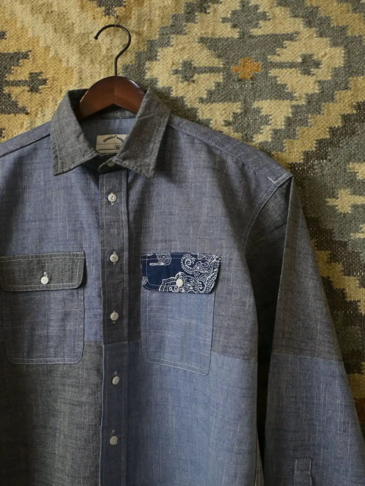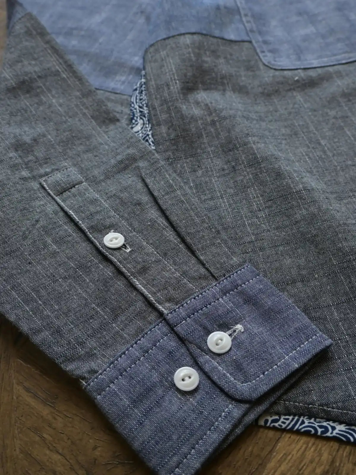 コットン100%の異なる5種類の生地を組み合わせ、胸ポケットにペイズリー柄を加えた個性的なパッチワークデザイン。ランダムな配置が一点ごとに異なる表情を持ち、クラシックな咔叽(カツジ)ワークテイストを現代的に再解釈。立体的なゆったりシルエットで、インナーとしても羽織りとしても活躍。縫製にはダブルチェーンステッチを採用し、耐久性とヴィンテージ感を強調。ボタンは天然素材由来のフルーツボタンを使用し、手縫いで仕立てた温かみのある質感が魅力。