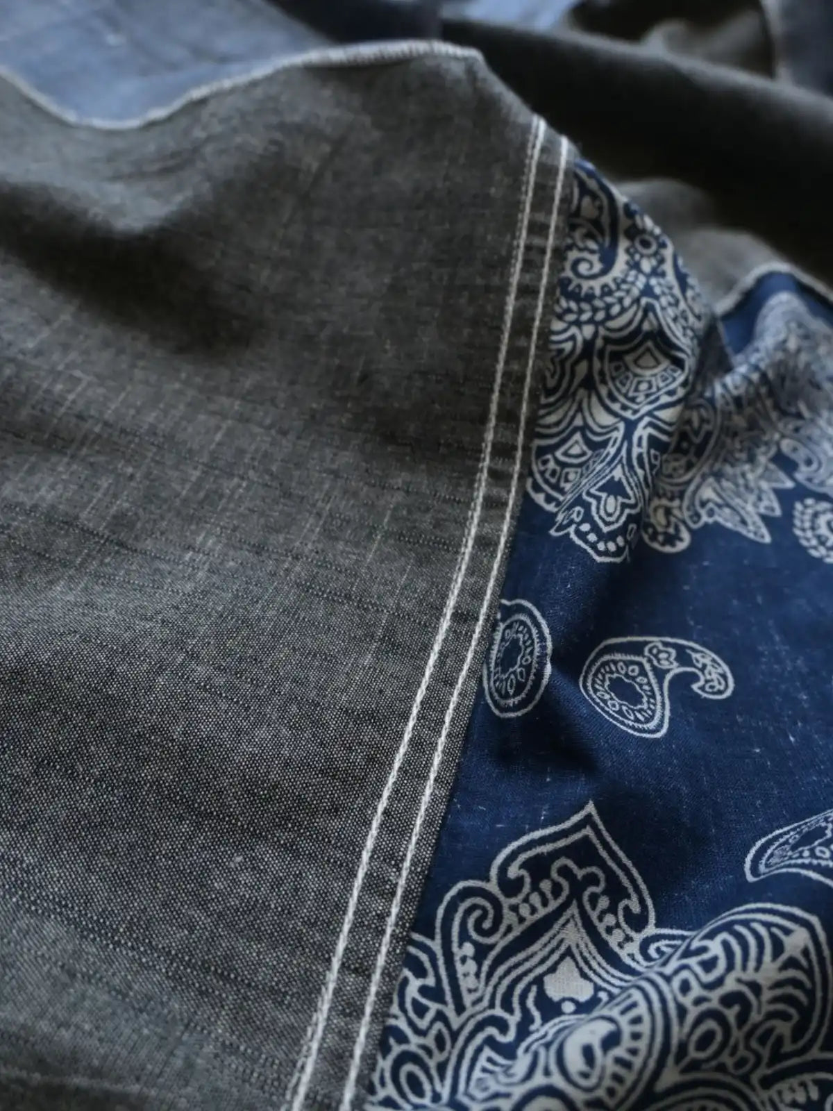 異素材とペイズリーを組み合わせた独特なパッチワークが映える、ゆったりシルエットのヴィンテージ長袖シャツ。
